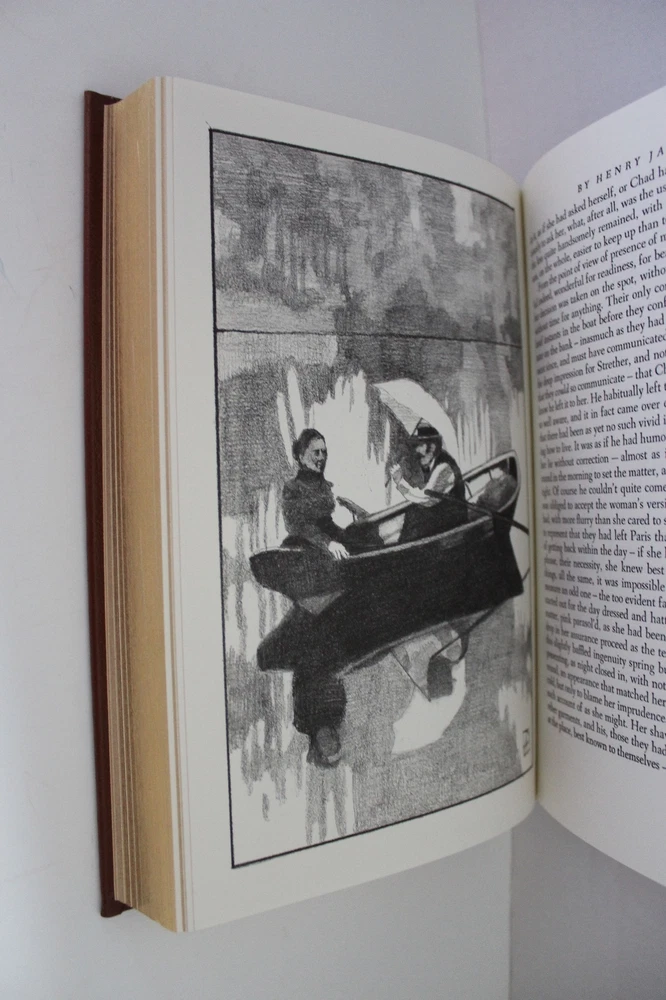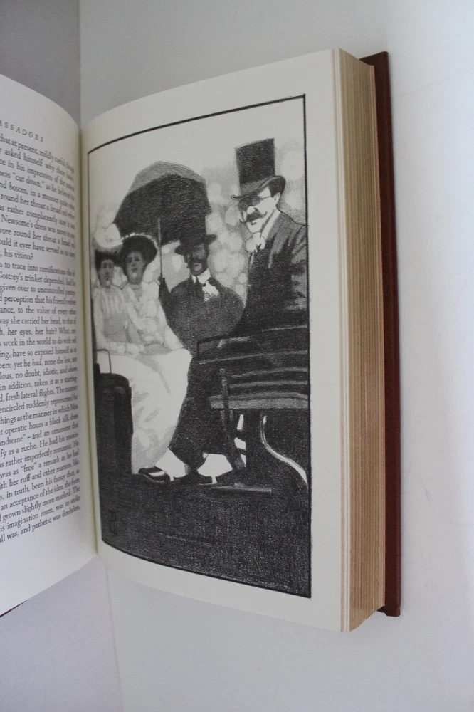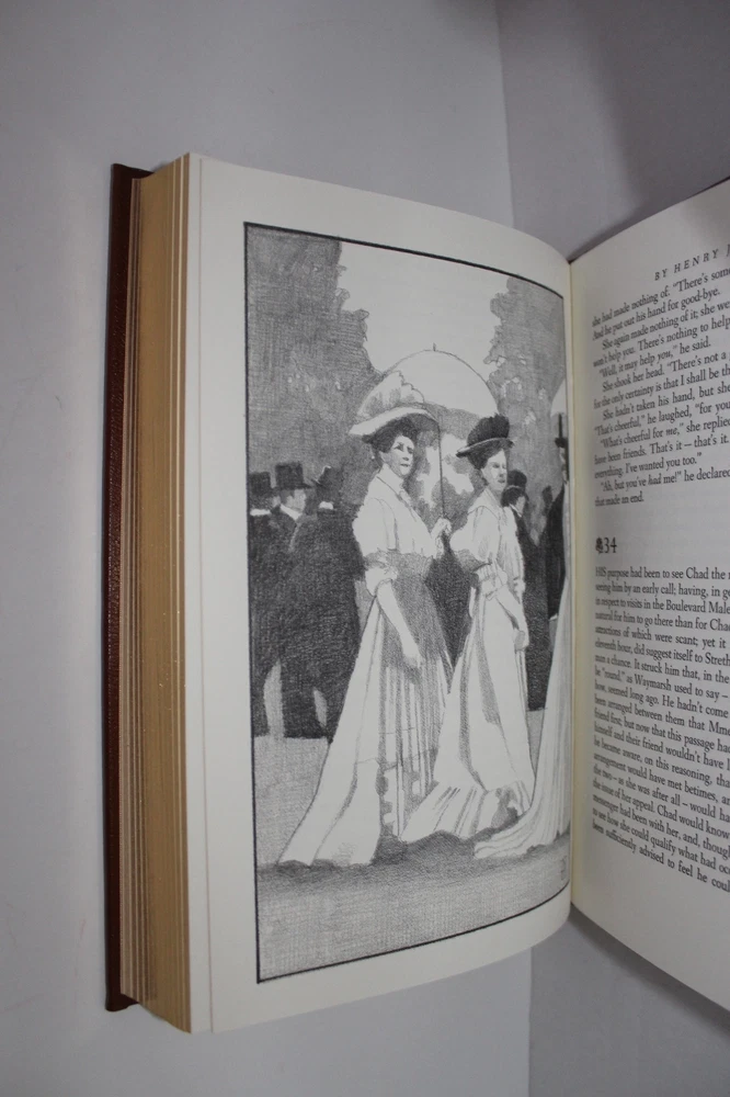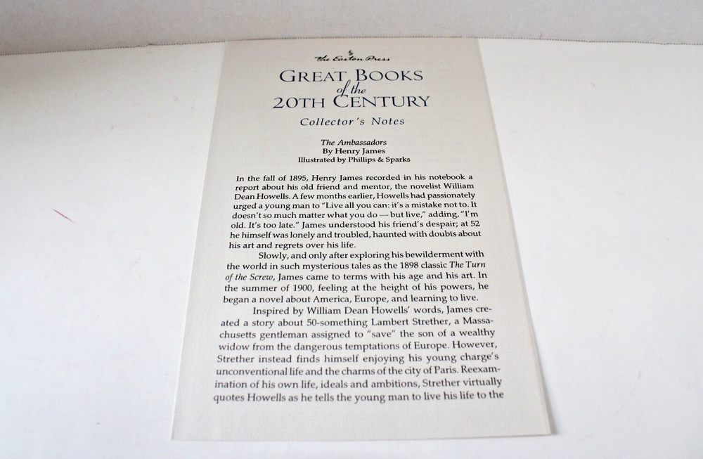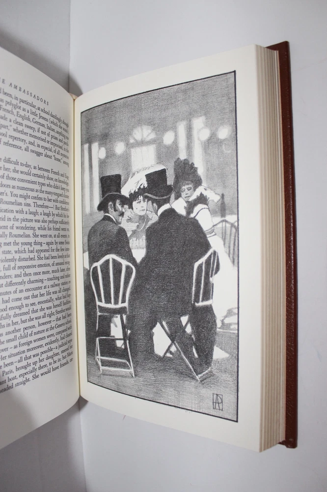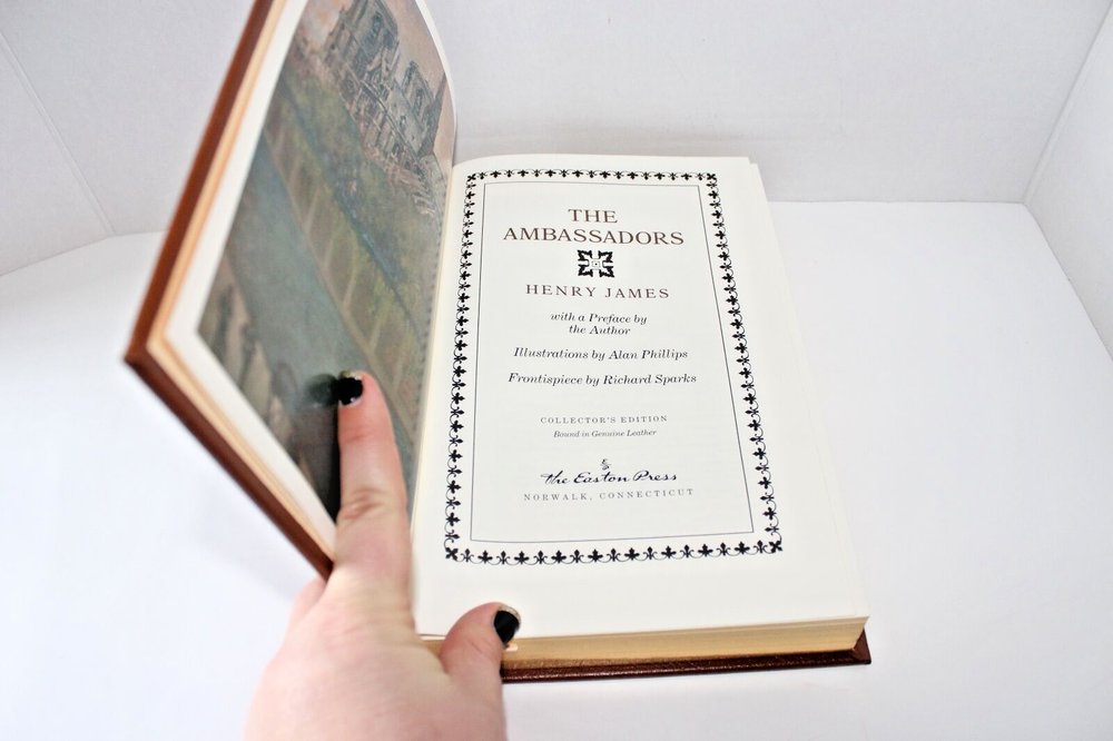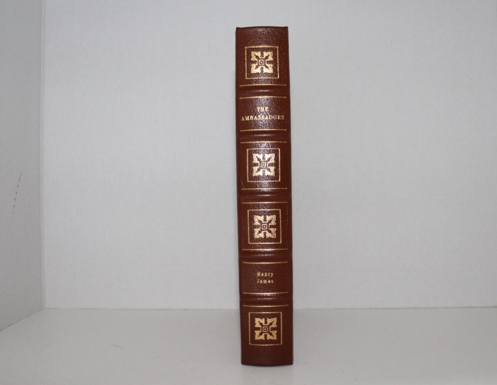 From the Easton Press Collection of Great Books of the 20th Century... The Ambassadors by Henry James Illustrations by Alan Phillips Frontispiece by Richard Sparks Copyright 1994 by The Easton Press Bound in Premium Full Leather This volume contains all of the classic Easton Press trimmings: Premium Leather Silk Moire Endleaves Distinctive Cover Design Hubbed Spine, Accented in Real 22KT Gold Satin Ribbon Page Marker Gilded Page Edges Long-lasting, High Quality Acid-neutral Paper Smyth-sewn Pages for Strength and Durability Beautiful Illustrations A very scarce title in any condition, this volume is in Near Fine - Fine and Unread condition. The front and back covers are both in near perfect condition and the gilded page edges show a few minor scratches (see pictures). There is no markings, bookplates, or other signs of prior ownership in this book. This book is part of the Great Books of the 20th Century Collection by the Easton Press . It comes complete with Collector's Notes and would be a beautiful addition to your Easton Press collection. Overall, this copy is a grade collector's book. This book is very elusive in this superior condition, as only a limited number of them were ever published, so now is the time to act. Hopefully you can add this book to your collection and enjoy it in the years to come... Please Email Me With Any Questions You Might Have! Shipping Info: Buyer to Pay Shipping and Handling International Bidders Pay Extra Shipping Seller Not Responsible For Uninsured Items Lost or Damaged in Mail Good luck and happy bidding!