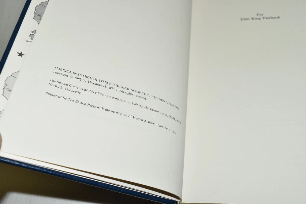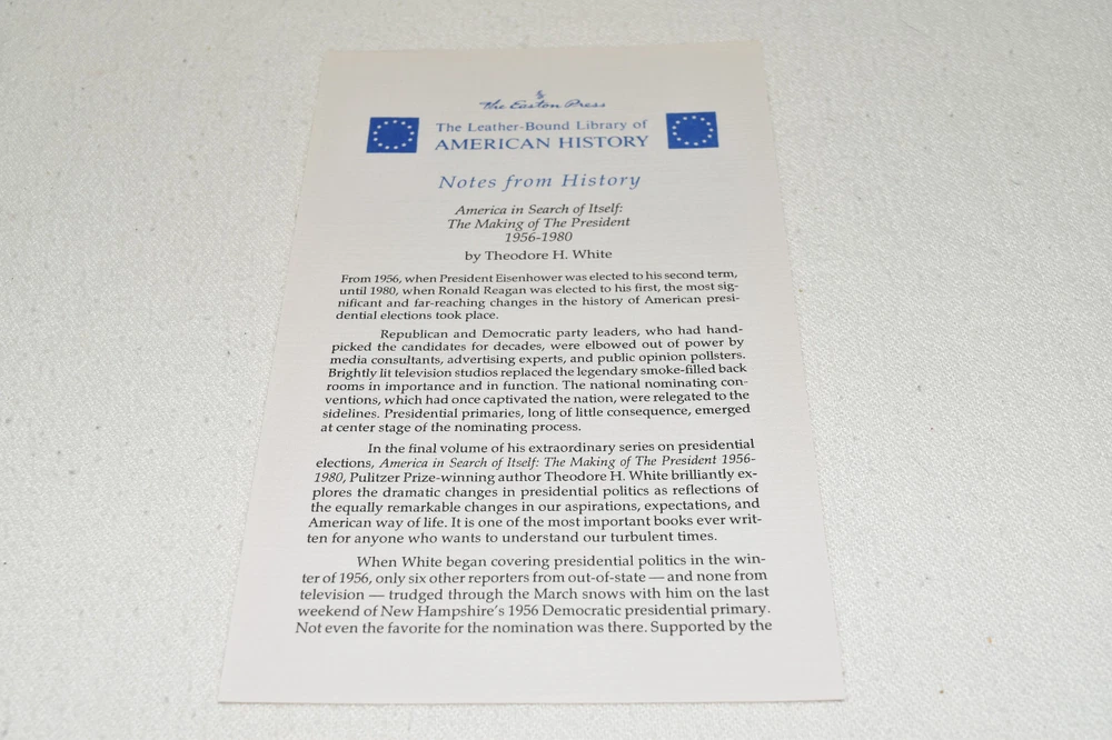 From the Easton Press Library of American History... America in Search of Itself The Making of the President, 1956 - 1980 by Theodore White Collector's Edition Copyright 1986 by The Easton Press Bound in Premium Full Leather This volume contains all of the classic Easton Press trimmings: Premium Leather Decorated Endleaves Distinctive Cover Design Hubbed Spine, Accented in Real 22KT Gold Satin Ribbon Page Marker Gilded Page Edges Long-lasting, High Quality Acid-neutral Paper Smyth-sewn Pages for Strength and Durability Beautiful Illustrations A very scarce title in any condition, this Easton Press Edition is in Near Fine - Fine condition. The front and back covers are both in terrific condition and the gilded page edges show rubbing on the top edge (see pictures of all sides of gilt). There is faint residue on the second page. This book is part of the Library of American History Collection published by Easton Press. It comes complete with Collector's Notes and would be a beautiful addition to your Easton Press collection. Please Email Me With Any Questions You Might Have! Shipping Info: Buyer to Pay Shipping and Handling International Bidders Pay Extra Shipping Seller Not Responsible For Uninsured Items Lost or Damaged in Mail Forms of Payment Accepted: Paypal Good luck and happy bidding! Powered by eBay Turbo Lister The free listing tool. List your items fast and easy and manage your active items.