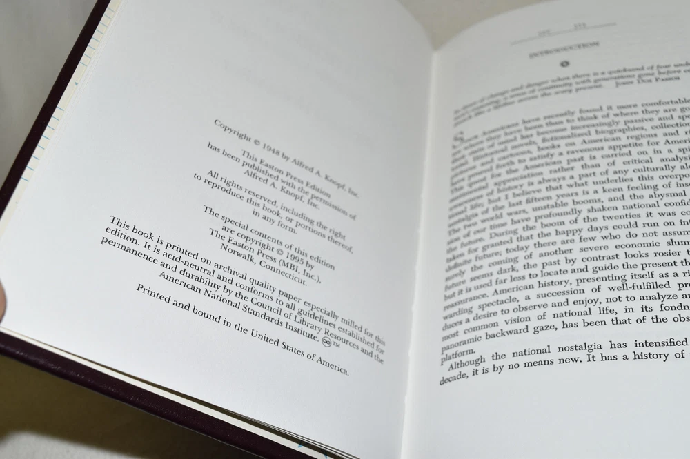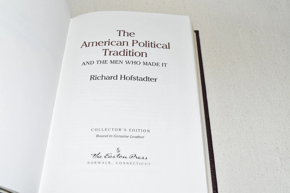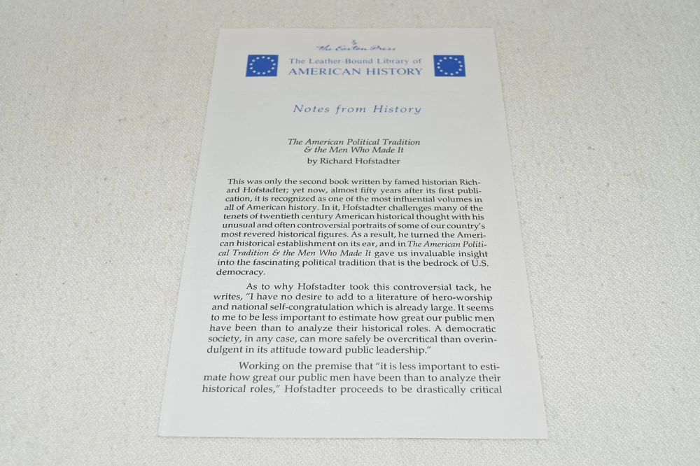 From the Easton Press Library of American History... The American Political Tradition and the Men Who Made It by Richard Hofstadter Collector's Edition Copyright 1995 by The Easton Press Bound in Premium Full Leather This volume contains all of the classic Easton Press trimmings: Premium Leather Decorated Endleaves Distinctive Cover Design Hubbed Spine, Accented in Real 22KT Gold Satin Ribbon Page Marker Gilded Page Edges Long-lasting, High Quality Acid-neutral Paper Smyth-sewn Pages for Strength and Durability Beautiful Illustrations A very scarce title in any condition, this Easton Press Edition is in Fine condition. The front and back covers are both in terrific condition and the gilded page edges show minor wear (see pictures of all sides of gilt). There is faint wear on the second page. This book is part of the Library of American History Collection published by Easton Press. It comes complete with Collector's Notes and would be a beautiful addition to your Easton Press collection. Please Email Me With Any Questions You Might Have! Shipping Info: Buyer to Pay Shipping and Handling International Bidders Pay Extra Shipping Seller Not Responsible For Uninsured Items Lost or Damaged in Mail Forms of Payment Accepted: Paypal Good luck and happy bidding! Powered by eBay Turbo Lister The free listing tool. List your items fast and easy and manage your active items.