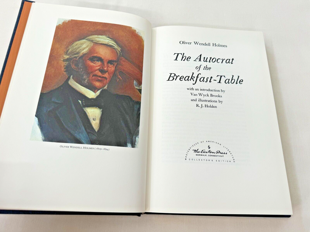 From the Easton Press Masterpieces of American Literature... The Autocrat of the Breakfast Table by Oliver Wendell Holmes Illustrated by R. J. Holden Copyright 1981 by The Easton Press Bound in Premium Full Leather This volume contains all of the classic Easton Press trimmings: Premium Leather Silk Moire Endleaves Distinctive Cover Design Hubbed Spine, Accented in Real 22KT Gold Satin Ribbon Page Marker Gilded Page Edges Long-lasting, High Quality Acid-neutral Paper Smyth-sewn Pages for Strength and Durability Beautiful Illustrations DESCRIPTION A very scarce title in any condition, this Edition is in near Mint and Unread condition. The front and back covers are in near Fine condition showing only minor wear and the gilded page edges show hardly any wear at all! There are no markings, bookplates, or other signs of prior ownership in this book. This book is part of the Masterpieces of American Literature Collection published by The Easton Press and would be a beautiful addition to your Easton Press collection. Overall, this copy is a grade collector's set. This set is very elusive in this superior condition, as only a limited number of them were ever published, so now is the time to act. Hopefully you can add this set to your collection and enjoy it in the years to come... SHIPPING POLICY We take great care packaging every item to ensure safe shipment to you. Items are packaged using plenty of bubble wrap and packaged securely in a sturdy box. Our secure shipping methods have resulted in zero damaged items in over 15 years! Items are shipped out within 1 - 3 days of payment being received. RETURN & REFUND POLICY We accept refunds within 30 days of purchase. If you are not 100% satisfied with your purchase, please contact us about a refund, or initiate a refund through eBay. CONTACT US We are committed to providing our customers with the best possible on-line shopping experience. This includes a commitment to excellent customer service, before you purchase as well as after your order has been delivered. Please feel free to submit any questions or inquiries regarding this item or your order by sending us a message through the eBay messaging system. We will typically respond within 24 hours of receiving your message.