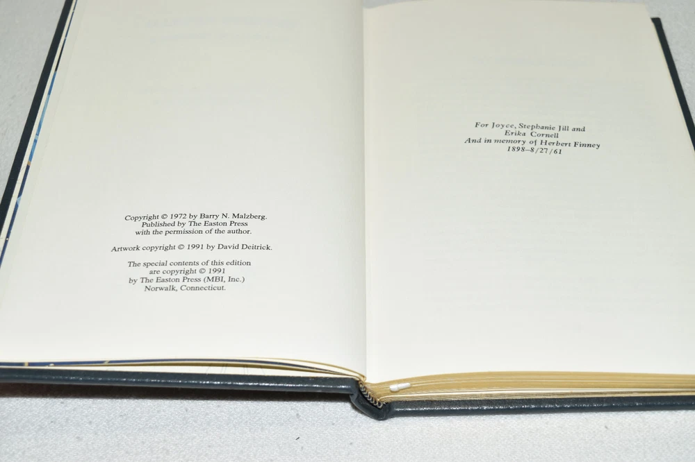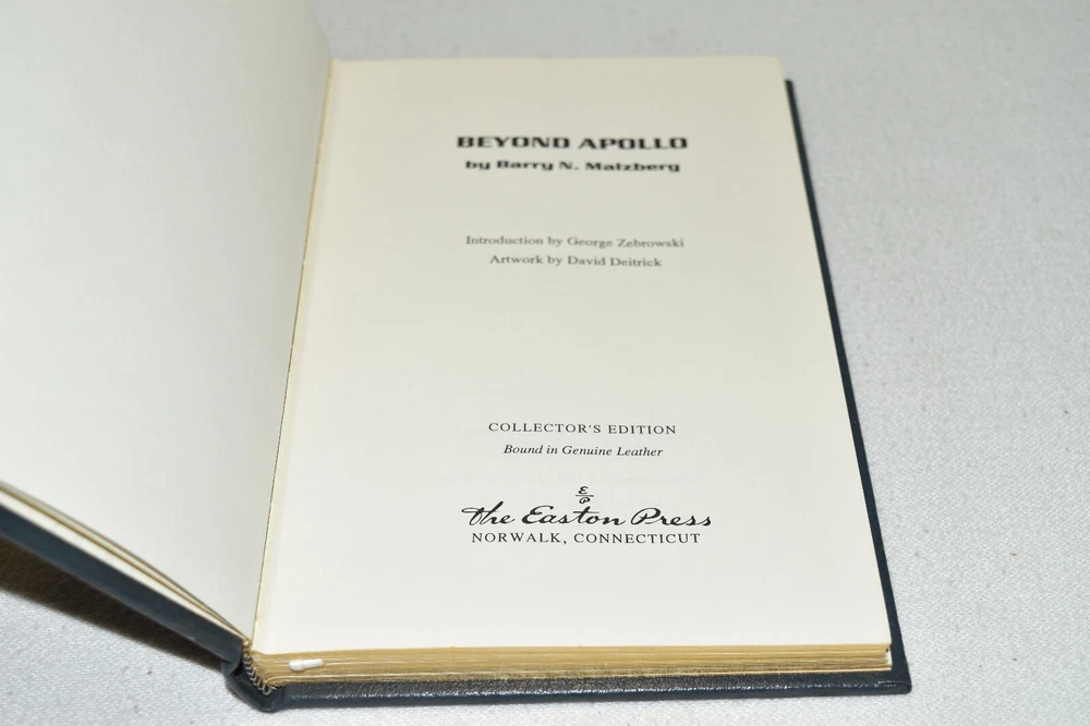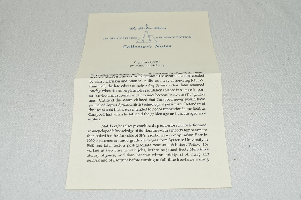 From the Easton Press Masterpieces of Science Fiction Collection... Beyond Apollo by Barry Malzberg Illustrated by David Deitrick Collector's Edition Copyright 1991 by The Easton Press Bound in Premium Full Leather This volume contains all of the classic Easton Press trimmings: Premium Leather Decorated Endleaves Distinctive Cover Design Hubbed Spine, Accented in Real 22KT Gold Satin Ribbon Page Marker Gilded Page Edges Long-lasting, High Quality Acid-neutral Paper Smyth-sewn Pages for Strength and Durability Beautiful Illustrations A very scarce title in any condition, this 1991 Easton Press Edition is in Fine condition! The front and back covers are both in terrific condition and the gilded page edges show hardly any wear (see pictures of all sides of gilt). There is light residue on the second page. This book is part of the Masterpieces of Science Fiction Collection published by Easton Press. It comes complete with Collector's Notes and would be a beautiful addition to your Easton Press collection. Please Email Me With Any Questions You Might Have! Shipping Info: Buyer to Pay Shipping and Handling International Bidders Pay Extra Shipping Seller Not Responsible For Uninsured Items Lost or Damaged in Mail Forms of Payment Accepted: Paypal Good luck and happy bidding! Powered by eBay Turbo Lister The free listing tool. List your items fast and easy and manage your active items.