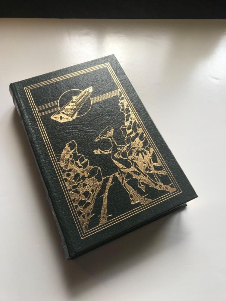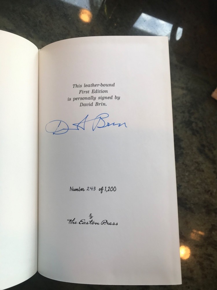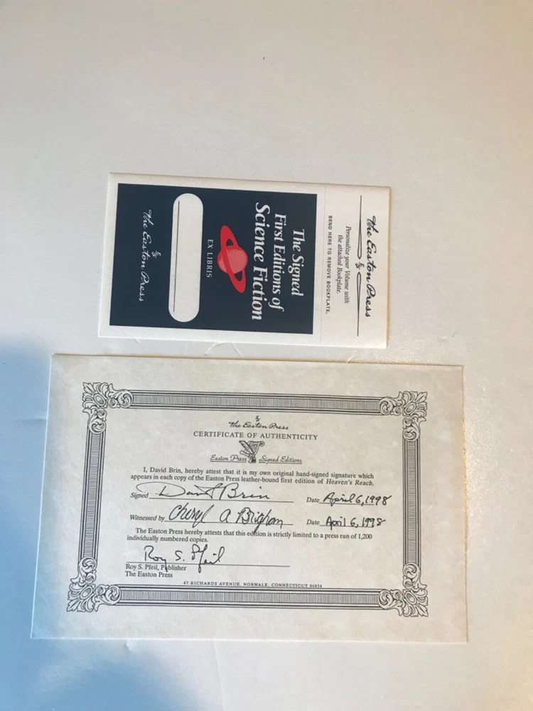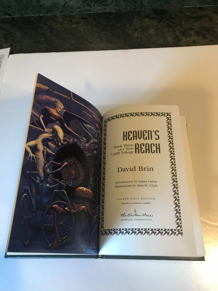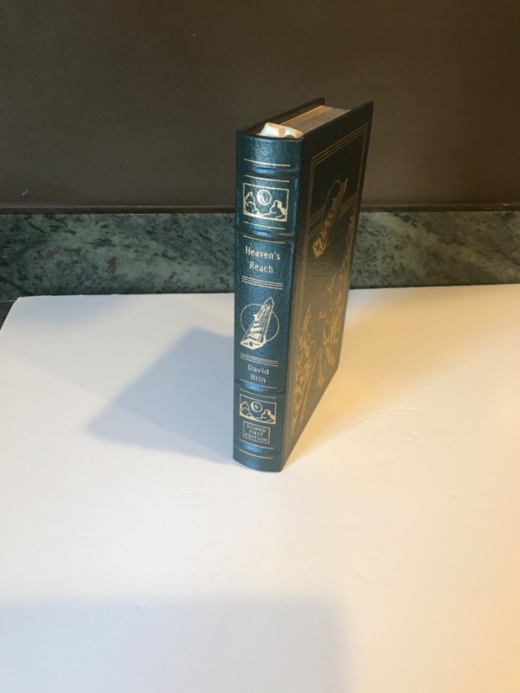 Easton Press Hand Signed First Edition of "Heaven's Reach" Science Fiction by author, David Brin- winner of the Nebula and Hugo Awards Publisher: Easton Press ( 1998 ) Binding: Full Genuine Leather embossed with 22kt gold Condition: Very Good= no marks on leather, Gold embossing on leather perfect, pages in pristine unmarked condition including on gilded edges. Has all the quality characteristics of Easton Press leather bound 1st Editions books: - Premium Hand-cut Full Leather Binding [ Dark Green ] - Silk Moire End leaves - Hubbed Spine Accented in 22kt Gold - Exquisite Cover Design - Gilded Page Edges - Sewn-in Satin Ribbon Page Marker - Beautiful Art Quality Illustrations - High quality Acid Neutral Paper - Smyth-sewn Pages This is a personally hand signed, limited collection, first edition David Brin on a special limitation page as pictured. This book is 243 of 1200 copies signed by the author without inscription or personalization. Certificate of Authenticity is, of course, included along with an unused publisher supplied book plate laid in - not attached. These colorful leather bound books [ this one in dark forest green ] make great pieces for display or a wonderful rare signed first edition gift for the discerning collector.