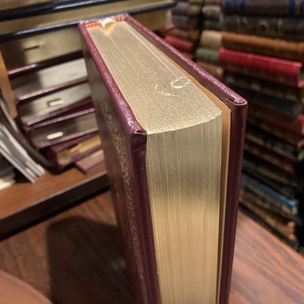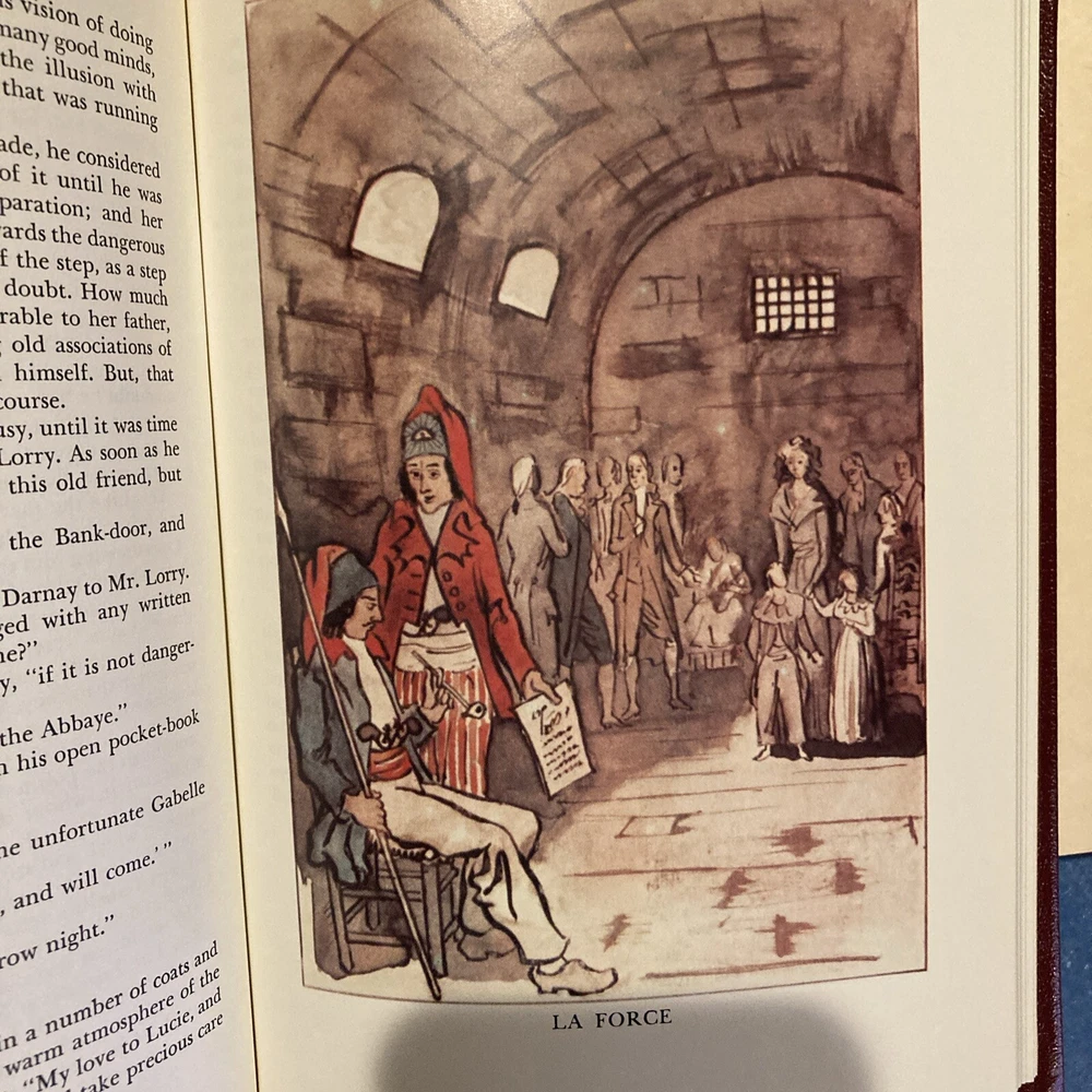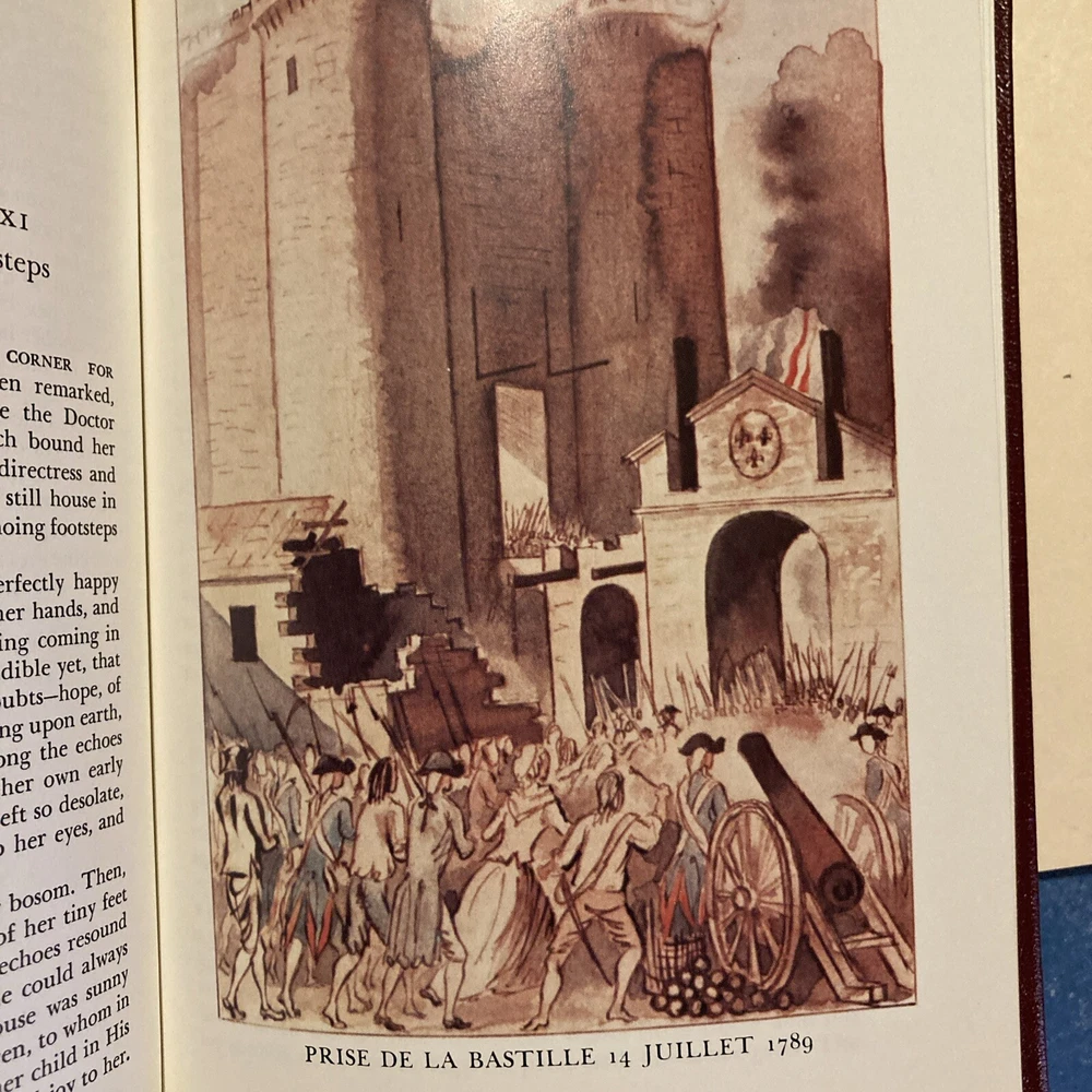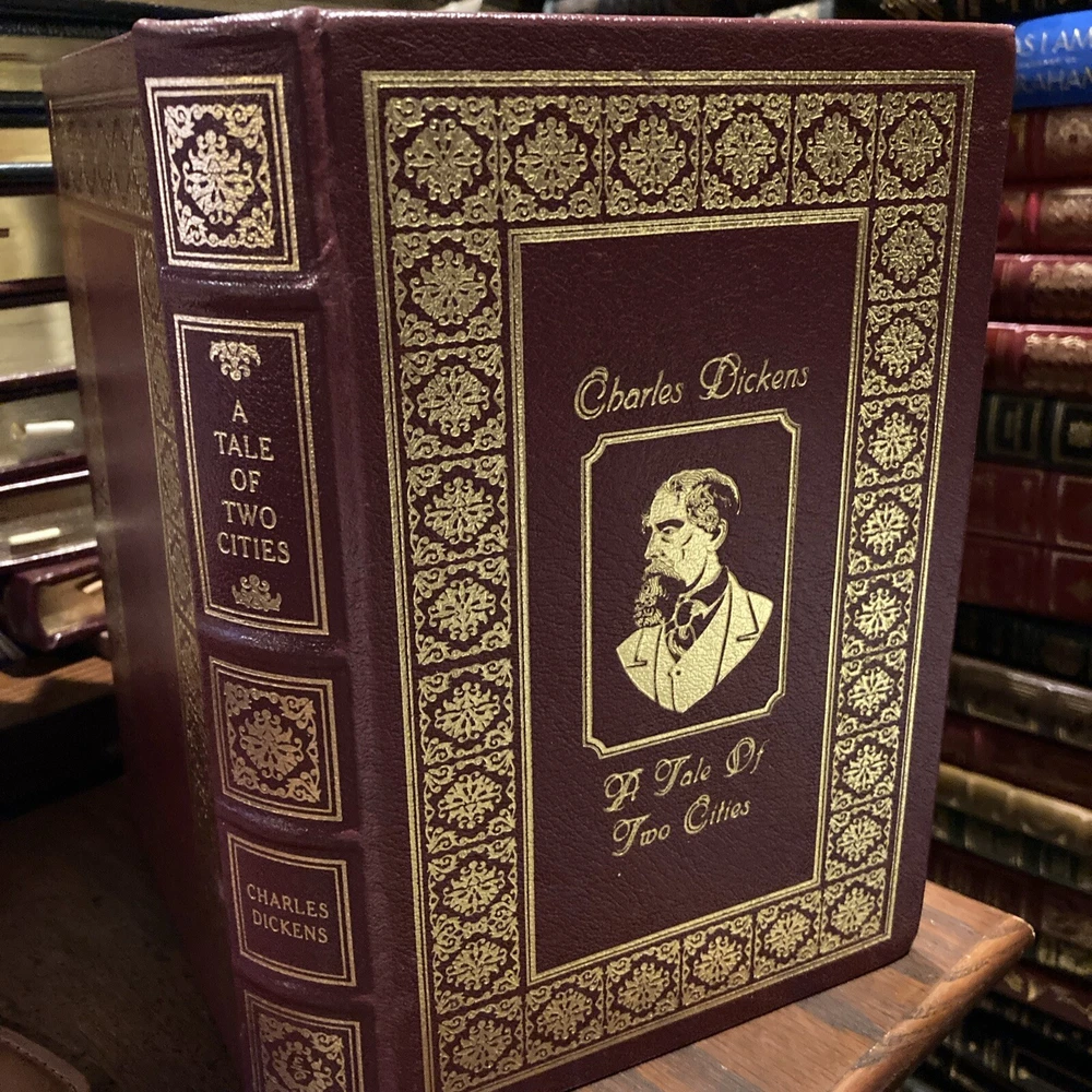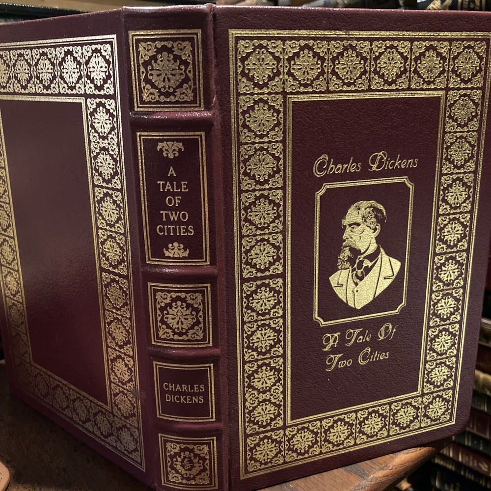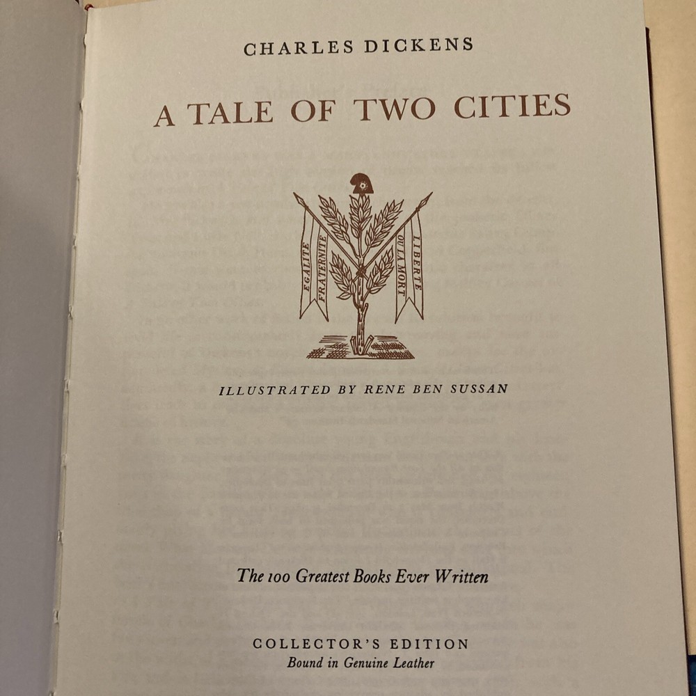 Easton Press leather edition of Charles Dickens's "A Tale of Two Cities," a COLLECTOR'S edition, Illustrated by Rene Ben Sussan, one of the 100 GREATEST BOOKS EVER WRITTEN series, published in 1981. Bound in brown leather with a portrait of Dickens in the center of the front board, the book has camel tan French moire silk end leaves, with gold tooling around the edges of the silk, satin book marker, hubbed spine, gold gilding on three edges---in near FINE condition---except for minor imperfection to top gilt. Charles Dickens, who lived from 1812-1870, was born near PORTSMOUTH, England but his family moved to LONDON when he was two years old. In no other work of fiction is the FRENCH REVOLUTION brought to as vivid life. "The Tale of Two Cities" is the story of a dissolute young Englishman and his look-alike, the nephew of a French nobleman. Both are in love with the pretty daughter of a man who has been imprisoned for eighteen years in the Bastille. He is now in a hiding in a Paris attic above the wine shop of a fanatic Frenchwoman who is constantly plying her knitting needles. The novel opens with these immortal lines: "It was the Best of Times, it was the worst of times, it was the age of wisdom, it was the age of foolishness, it was the epoch of belief, it was the epoch of incredulity, it was the season of Light, it was the season of Darkness, it was the spring of hope, it was the winter of despair, we had everything before us, we had nothing before us, we were all going to Heaven, we were all going direct the other way . . ." The novel closes with more immortal lines: "It is a far, far better thing that I do, than I have ever done: it is a far, far better rest that I go to than I have ever known." 371 pages----a BEAUTIFUL book! I offer Combined shipping.