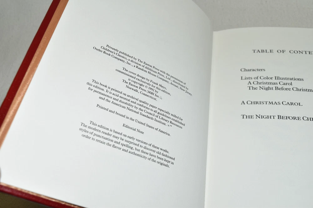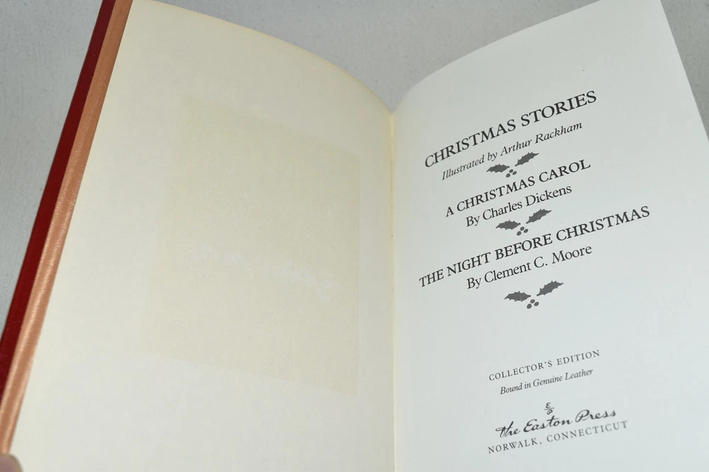 From the Easton Press Collection... Christmas Stories A Christmas Carol The Night Before Christmas by Charles Dickens and Clement Moore Profusely Illustrated by Arthur Rackham Collector's Edition Copyright 1992 by The Easton Press Bound in Premium Full Leather This volume contains all of the classic Easton Press trimmings: Premium Leather Silk Moire Endleaves Distinctive Cover Design Hubbed Spine, Accented in Real 22KT Gold Satin Ribbon Page Marker Gilded Page Edges Long-lasting, High Quality Acid-neutral Paper Smyth-sewn Pages for Strength and Durability Beautiful Illustrations A very scarce title in any condition, this Easton Press First Limited Edition is in Fine condition. The front and back covers are both in terrific condition and the gilded page edges show only faint wear (see pictures of all gilt sides). There is a faint residue on the second page. This book was published by Easton Press and would be a beautiful addition to your Easton Press collection. Hopefully you can add this book to your collection and enjoy it in the years to come... Please Email Me With Any Questions You Might Have! Shipping Info: Buyer to Pay Shipping and Handling International Bidders Pay Extra Shipping Seller Not Responsible For Uninsured Items Lost or Damaged in Mail Forms of Payment Accepted: Paypal Good luck and happy bidding! Powered by eBay Turbo Lister The free listing tool. List your items fast and easy and manage your active items.