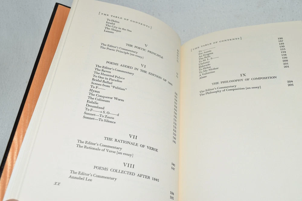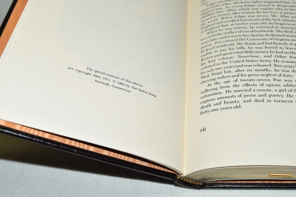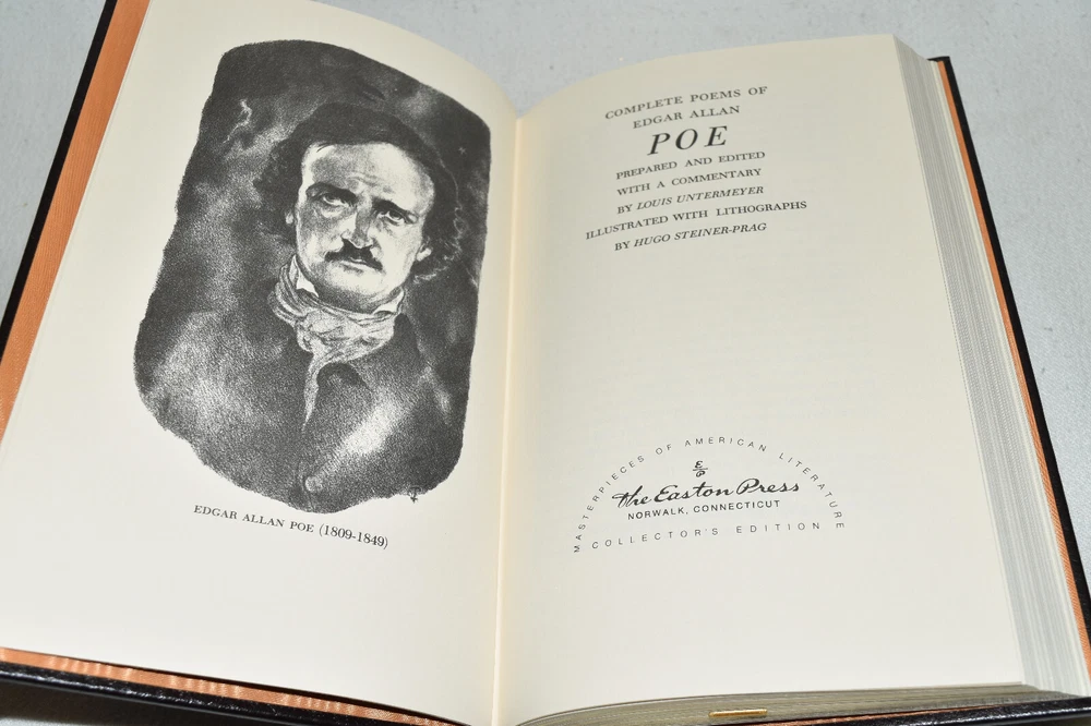 From the Easton Press Masterpieces of American Literature Collection... The Complete Poems of Edgar Allen Poe by Edgar Allen Poe Introduction by Louis Untermeyer Artwork by Hugo Steiner-Prag Copyright 1980 by The Easton Press Bound in Premium Full Leather This volume contains all of the classic Easton Press trimmings: Premium Leather Decorated Endleaves Distinctive Cover Design Hubbed Spine, Accented in Real 22KT Gold Satin Ribbon Page Marker Gilded Page Edges Long-lasting, High Quality Acid-neutral Paper Smyth-sewn Pages for Strength and Durability Beautiful Illustrations A very scarce title in any condition, this volume is in Fine condition. The front and back covers are in terrific condition and the gilded page edges show hardly any wear (see pictures of all edges). There is very faint residue on the second page. This book is part of the Masterpieces of American Literature Collection published by Easton Press and would be a beautiful addition to your Easton Press collection. Hopefully you can add this book to your collection and enjoy it in the years to come... Please Email Me With Any Questions You Might Have! Shipping Info: Buyer to Pay Shipping and Handling International Bidders Pay Extra Shipping Seller Not Responsible For Uninsured Items Lost or Damaged in Mail Forms of Payment Accepted: Paypal Good luck and happy bidding! Powered by eBay Turbo Lister The free listing tool. List your items fast and easy and manage your active items.