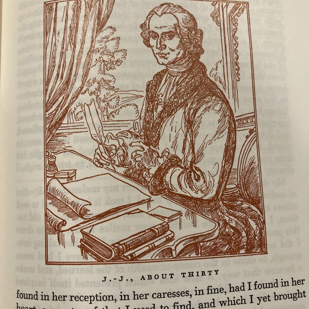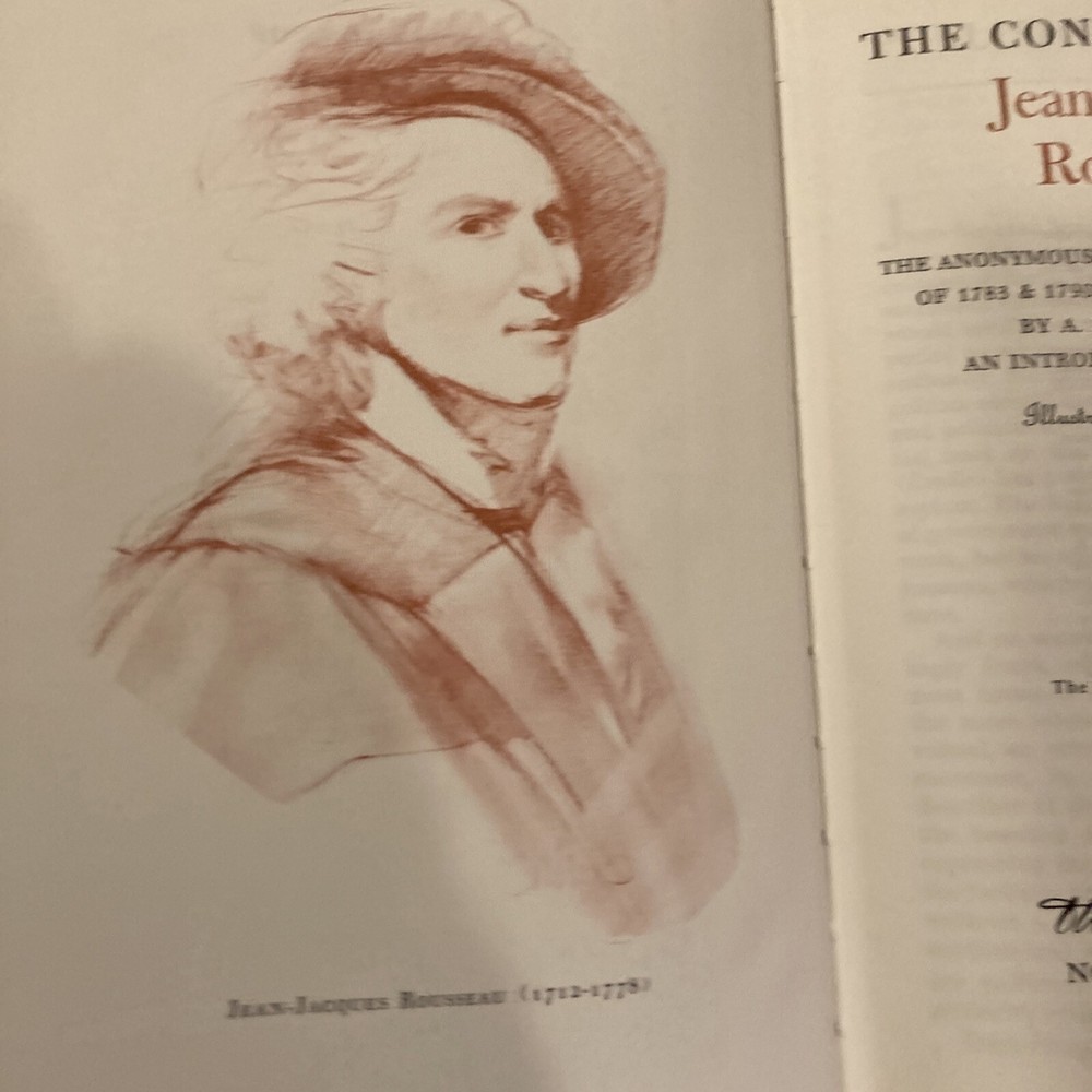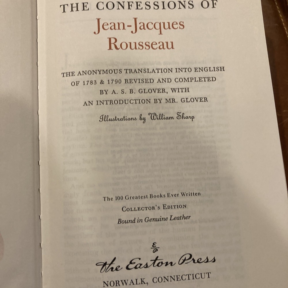 Franklin Library Easton Press leather edition of "The Confessions of Jean Jacques Rousseau," a limited edition, Translated by A.S. B. Glover, Illustrated by William Sharp, one of the 100 GREATEST BOOKS EVER WRITTEN series, published in 1980. Bound in green leather, the book has camel tan French moire silk end leaves, acid-free paper, Symth-sewn binding, a satin book marker, hubbed spine, gold gilding on three edges---in FINE condition. Jean Jacques Rousseau, who lived from 1712-1778, was born in Switzerland, the son of a watch maker and grandson of a Calvinist minister. At twelve, Rousseau was apprenticed to an engraver with whom he spent four unhappy years. He was beaten and his only pleasures were reading and taking long walks in the countryside. He abandoned his master before his sixteenth birthday. Without money or possessions, he started walking until he reached a village where a kindly priest took him in, fed him, and sent him to his first important woman in his life, the Baronne de Warens. She was 29 and separated from her husband. Having converted Rousseau to Catholicism, she sent him to a hospice in Turin. Years later he called this conversion "at bottom the act of a bandit." Eventually he returned to Madame de Warens and they became lovers and he managed her business affairs. At age thirty, Rousseau was unknown, a self-educated rustic with few social graces. He arrived in Paris in 1742 and took a position with the French Ambassador to Venice in 1743. Back in Paris in 1745, he began a relationship with THERESE LEVASEUR that would last the rest of his life. "She gave me the confidence, the want of which has has always hindered me from being myself. . .She was neither pretty nor young, but not being ugly or old, she had nothing in her person which prevented her with and grace from having all their effect." They became parents to five children who were placed in foundling homes. Rousseau criticized THOMAS HOBBES and JOHN LOCKE for their failure to probe the origins of man. Rousseau argued that man was "self-sufficient; he knew neither virtue or vice, but primarily the art of self-preservation. In the "Social Contract," he wrote: "Man is born free but everywhere he is in chains. One thinks himself the master of others and still remains a greater slave than they." Rousseau was absolutely without a forerunner or model---an intellectual wonder of the eighteenth century. 635 pages. I offer combined shipping.