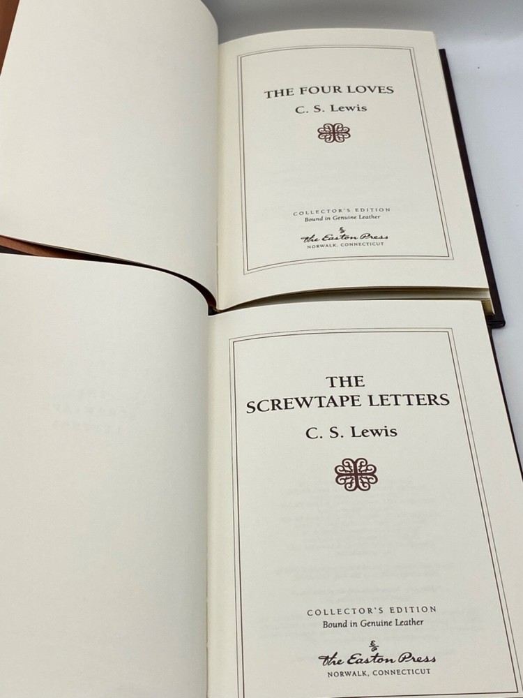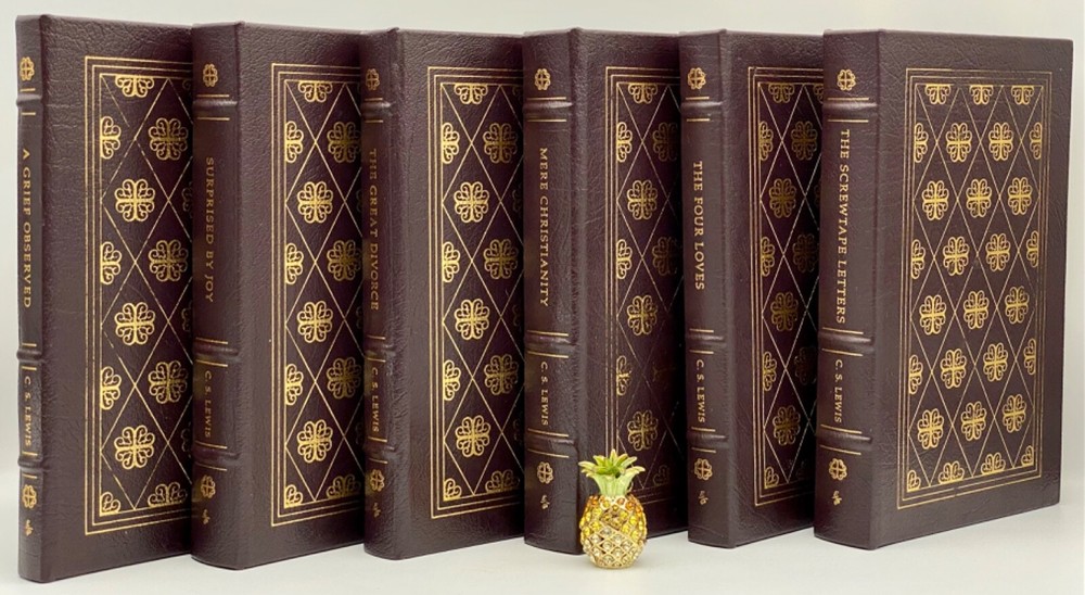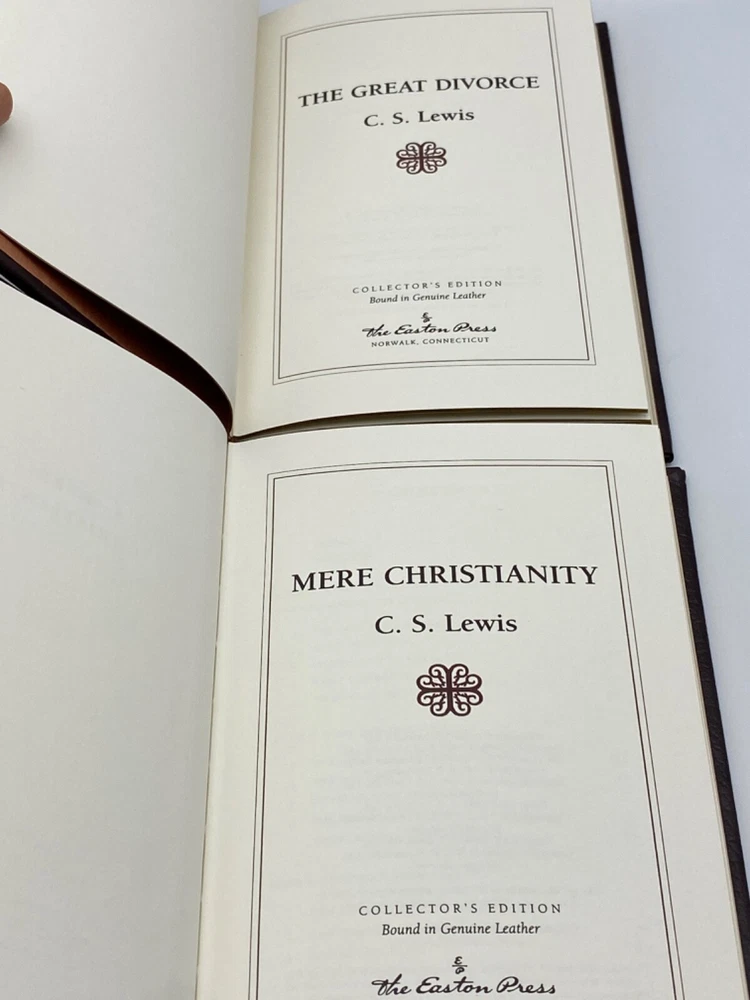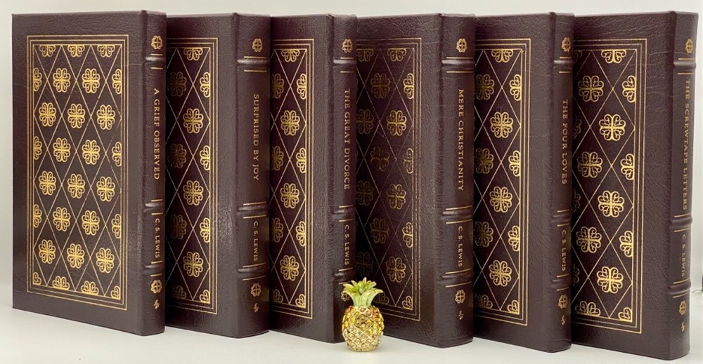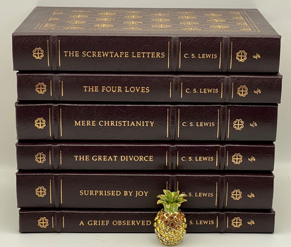 MAKES THE PERFECT GIFT FOR ANY FAN OF RELIGIOUS CLASSICS / C.S. LEWIS / CHRISTIAN NOVELS ** PLEASE READ : Mahalo for taking the time to look at our listing. We truly appreciate it. We always do our BEST to give you the most accurate description of these beautiful books. If, however, you have any SPECIFIC questions about the SIZE of the book, NUMBER of pages, TYPE of leather, SMELL or FEEL of the book, PLEASE email us through EBay’s mail system BEFORE you bid, and we will be HAPPY to give you more information. We want you to be completely happy with your purchase and keep you as our customers for years to come!** DESCRIPTION: Easton Press’s COMPLETE 6-VOLUME FULL LEATHER editions of C.S. LEWIS’S CLASSICS. THIS IS A SCARCE, ONE OF THE MOST DIFFICULT TO FIND EASTON SETS WITH GORGEOUS DEEP GILT IMPRESSIONS TO THE BOARDS AND SPINE. IT IS ONE OF THE MOST HIGHLY-PRIZED & MOST BEAUTIFUL SETS OF THESE C.S. LEWIS MASTERPIECES YOU CAN FIND. 🍍 NOT INCLUDED… 😃 ABOUT THE BOOKS: The Great Divorce is a classic Christian allegorical tale about a bus ride from hell to heaven. An extraordinary meditation upon good and evil, grace and judgment, Lewis’s revolutionary idea in the The Great Divorce is that the gates of Hell are locked from the inside. Using his extraordinary descriptive powers, Lewis’ The Great Divorce will change the way we think about good and evil. —- In Surprised By Joy, Lewis tells of his search for joy, a spiritual journey that led him from the Christianity of his early youth into atheism and then back to Christianity. —- Written with love, humility, and faith, this brief but poignant volume was first published in 1961 and concerns the death of C. S. Lewis's wife, the American-born poet Joy Davidman. In her introduction to this new edition, Madeleine L'Engle writes: "I am grateful to Lewis for having the courage to yell, to doubt, to kick at God in angry violence. This is a part of a healthy grief which is not often encouraged. It is helpful indeed that C. S. Lewis, who has been such a successful apologist for Christianity, should have the courage to admit doubt about what he has so superbly proclaimed. It gives us permission to admit our own doubts, our own angers and anguishes, and to know that they are part of the soul's growth." Written in longhand in notebooks that Lewis found in his home, A Grief Observed probes the "mad midnight moments" of Lewis's mourning and loss, moments in which he questioned what he had previously believed about life and death, marriage, and even God. Indecision and self-pity assailed Lewis. "We are under the harrow and can't escape," he writes. "I know that the thing I want is exactly the thing I can never get. The old life, the jokes, the drinks, the arguments, the lovemaking, the tiny, heartbreaking commonplace." Writing A Grief Observed as "a defense against total collapse, a safety valve," he came to recognize that "bereavement is a universal and integral part of our experience of love." Lewis writes his statement of faith with precision, humor, and grace. Yet neither is Lewis reluctant to confess his continuing doubts and his awareness of his own human frailty. This is precisely the quality which suggests that A Grief Observed may become "among the great devotional books of our age." —- In the classic Mere Christianity , Lewis, the most important writer of the 20th century, explores the common ground upon which all of those of Christian faith stand together. Bringing together Lewis’ legendary broadcast talks during World War Two from his three previous books The Case for Christianity , Christian Behavior , and Beyond Personality , Mere Christianity provides an unequaled opportunity for believers and nonbelievers alike to hear this powerful apologetic for the Christian faith. —- The Four Loves is a candid, wise, and warmly personal book in which Lewis explores the possibilities and problems of the four basic kinds of human love- affection, friendship, erotic love, and the love of God. “Immensely worthwhile for its simplicity...a rare and memorable book. —- The Screwtape Letters by C.S. Lewis is a classic masterpiece of religious satire that entertains readers with its sly and ironic portrayal of human life and foibles from the vantage point of Screwtape, a highly placed assistant to "Our Father Below." At once wildly comic, deadly serious, and strikingly original, C.S. Lewis's The Screwtape Letters is the most engaging account of temptation—and triumph over it—ever written. CONDITION: Books are in LIKE NEW condition for its age with only a few minor fades to the gilt on the boards on a couple of the volumes and a few faint, negligible rubs to the gilt page ends on a couple as well. IF YOU’D LIKE TO SEE MORE PHOTOS, JUST LET US KNOW (SEE PICS FOR FURTHER DETAILS). NO WRITING FROM PREVIOUS OWNER, ETC. It is a BEAUTIFUL EDITION. SHIPPING: FREE TO US ADDRESSES ONLY. INTERNATIONAL $ based on location. WE SHIP PRIORITY MAIL & PACK VERY WELL. Please check out our other listings of Easton Press, Franklin Library, Limited Editions Club, First Editions Library, Heritage Press, International Collectors Library, and Folio Society editions. WE DO COMBINE SHIPPING IF YOU PURCHASE MORE THAN ONE COPY. Mahalo for looking at our listings! By bidding/purchasing this item, you are helping a very grateful family who sends you our WARMEST ALOHA & MAHALO!