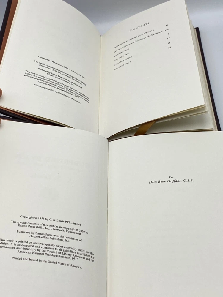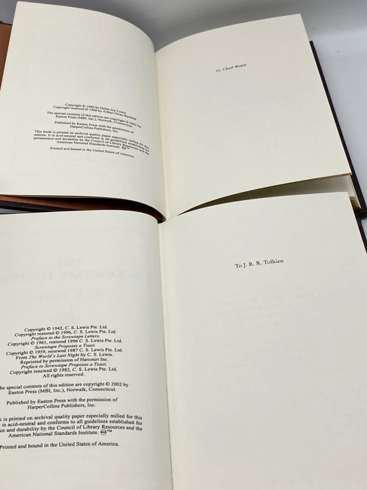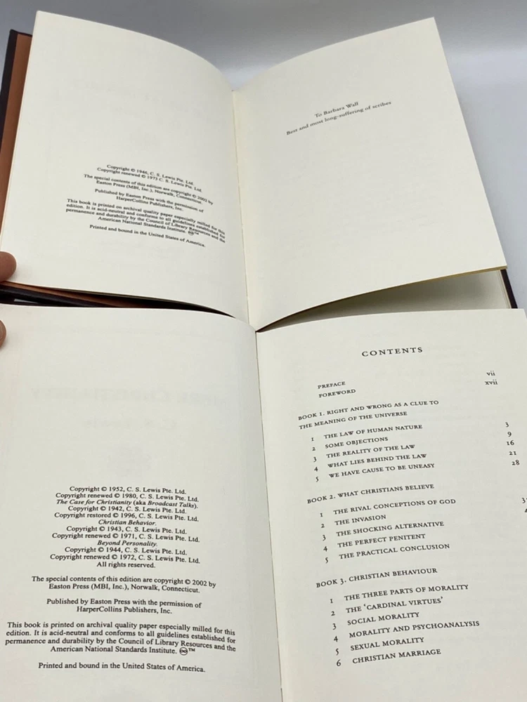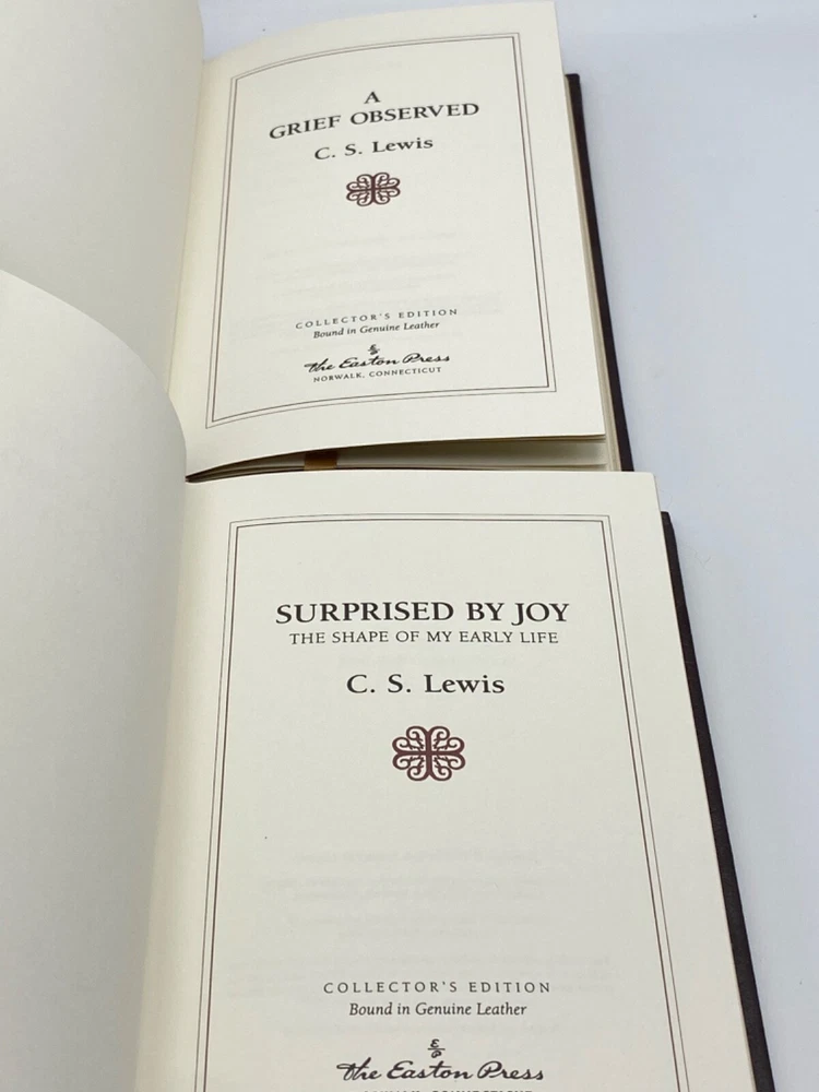 MAKES THE PERFECT GIFT FOR ANY FAN OF RELIGIOUS CLASSICS / C.S. LEWIS / CHRISTIAN NOVELS ** PLEASE READ : Mahalo for taking the time to look at our listing. We truly appreciate it. We always do our BEST to give you the most accurate description of these beautiful books. If, however, you have any SPECIFIC questions about the SIZE of the book, NUMBER of pages, TYPE of leather, SMELL or FEEL of the book, PLEASE email us through EBay’s mail system BEFORE you bid, and we will be HAPPY to give you more information. We want you to be completely happy with your purchase and keep you as our customers for years to come!** DESCRIPTION: Easton Press’s COMPLETE 6-VOLUME FULL LEATHER editions of C.S. LEWIS’S CLASSICS. THIS IS A SCARCE, ONE OF THE MOST DIFFICULT TO FIND EASTON SETS WITH GORGEOUS DEEP GILT IMPRESSIONS TO THE BOARDS AND SPINE. IT IS ONE OF THE MOST HIGHLY-PRIZED & MOST BEAUTIFUL SETS OF THESE C.S. LEWIS MASTERPIECES YOU CAN FIND. 🍍 NOT INCLUDED… 😃 ABOUT THE BOOKS: The Great Divorce is a classic Christian allegorical tale about a bus ride from hell to heaven. An extraordinary meditation upon good and evil, grace and judgment, Lewis’s revolutionary idea in the The Great Divorce is that the gates of Hell are locked from the inside. Using his extraordinary descriptive powers, Lewis’ The Great Divorce will change the way we think about good and evil. —- In Surprised By Joy, Lewis tells of his search for joy, a spiritual journey that led him from the Christianity of his early youth into atheism and then back to Christianity. —- Written with love, humility, and faith, this brief but poignant volume was first published in 1961 and concerns the death of C. S. Lewis's wife, the American-born poet Joy Davidman. In her introduction to this new edition, Madeleine L'Engle writes: "I am grateful to Lewis for having the courage to yell, to doubt, to kick at God in angry violence. This is a part of a healthy grief which is not often encouraged. It is helpful indeed that C. S. Lewis, who has been such a successful apologist for Christianity, should have the courage to admit doubt about what he has so superbly proclaimed. It gives us permission to admit our own doubts, our own angers and anguishes, and to know that they are part of the soul's growth." Written in longhand in notebooks that Lewis found in his home, A Grief Observed probes the "mad midnight moments" of Lewis's mourning and loss, moments in which he questioned what he had previously believed about life and death, marriage, and even God. Indecision and self-pity assailed Lewis. "We are under the harrow and can't escape," he writes. "I know that the thing I want is exactly the thing I can never get. The old life, the jokes, the drinks, the arguments, the lovemaking, the tiny, heartbreaking commonplace." Writing A Grief Observed as "a defense against total collapse, a safety valve," he came to recognize that "bereavement is a universal and integral part of our experience of love." Lewis writes his statement of faith with precision, humor, and grace. Yet neither is Lewis reluctant to confess his continuing doubts and his awareness of his own human frailty. This is precisely the quality which suggests that A Grief Observed may become "among the great devotional books of our age." —- In the classic Mere Christianity , Lewis, the most important writer of the 20th century, explores the common ground upon which all of those of Christian faith stand together. Bringing together Lewis’ legendary broadcast talks during World War Two from his three previous books The Case for Christianity , Christian Behavior , and Beyond Personality , Mere Christianity provides an unequaled opportunity for believers and nonbelievers alike to hear this powerful apologetic for the Christian faith. —- The Four Loves is a candid, wise, and warmly personal book in which Lewis explores the possibilities and problems of the four basic kinds of human love- affection, friendship, erotic love, and the love of God. “Immensely worthwhile for its simplicity...a rare and memorable book. —- The Screwtape Letters by C.S. Lewis is a classic masterpiece of religious satire that entertains readers with its sly and ironic portrayal of human life and foibles from the vantage point of Screwtape, a highly placed assistant to "Our Father Below." At once wildly comic, deadly serious, and strikingly original, C.S. Lewis's The Screwtape Letters is the most engaging account of temptation—and triumph over it—ever written. CONDITION: Books are in LIKE NEW condition for its age with only a few minor fades to the gilt on the boards on a couple of the volumes and a few faint, negligible rubs to the gilt page ends on a couple as well. IF YOU’D LIKE TO SEE MORE PHOTOS, JUST LET US KNOW (SEE PICS FOR FURTHER DETAILS). NO WRITING FROM PREVIOUS OWNER, ETC. It is a BEAUTIFUL EDITION. SHIPPING: FREE TO US ADDRESSES ONLY. INTERNATIONAL $ based on location. WE SHIP PRIORITY MAIL & PACK VERY WELL. Please check out our other listings of Easton Press, Franklin Library, Limited Editions Club, First Editions Library, Heritage Press, International Collectors Library, and Folio Society editions. WE DO COMBINE SHIPPING IF YOU PURCHASE MORE THAN ONE COPY. Mahalo for looking at our listings! By bidding/purchasing this item, you are helping a very grateful family who sends you our WARMEST ALOHA & MAHALO!