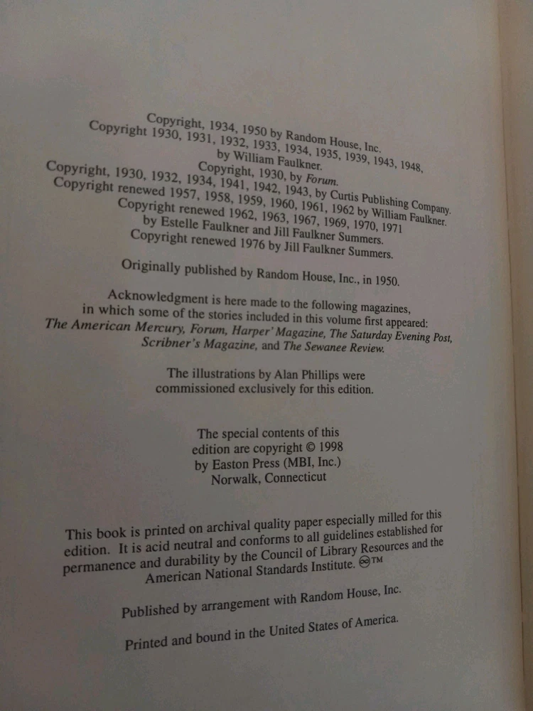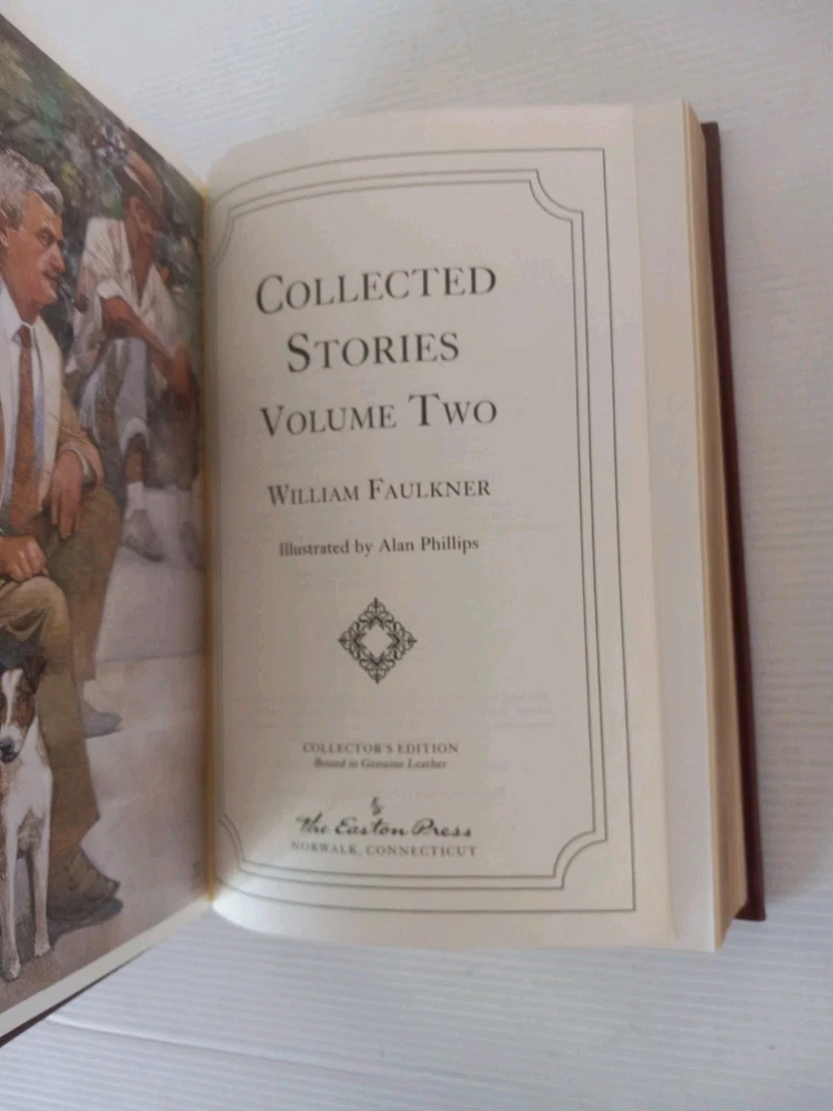 This is a Collector's Edition of "The Collected Stories Vol. 2" by William Faulkner, published by Easton Press in 2004. The book is leather-bound and has gold-gilded pages. It is illustrated by Alan Phillips and is part of the "100 Greatest Books Ever Written" list. The book features characters such as Benjy, Caddie, Jason, and Quentin and is set in Mississippi. The topic of the book is Social Psychology. The book is an original copy and was published in Norwalk, Connecticut in the United States.