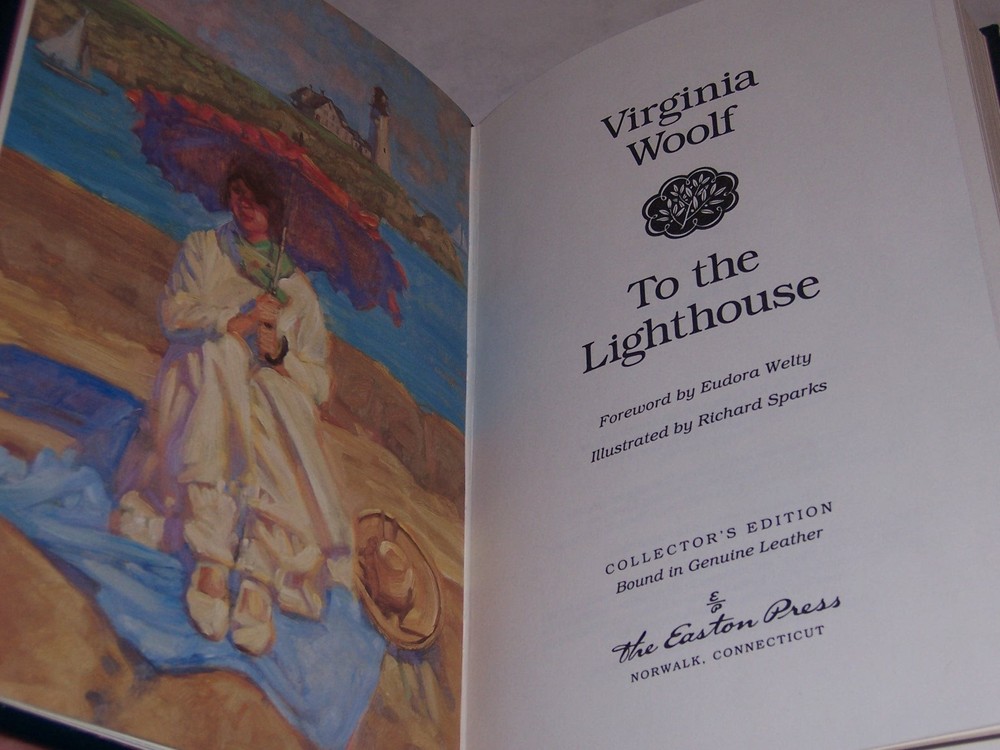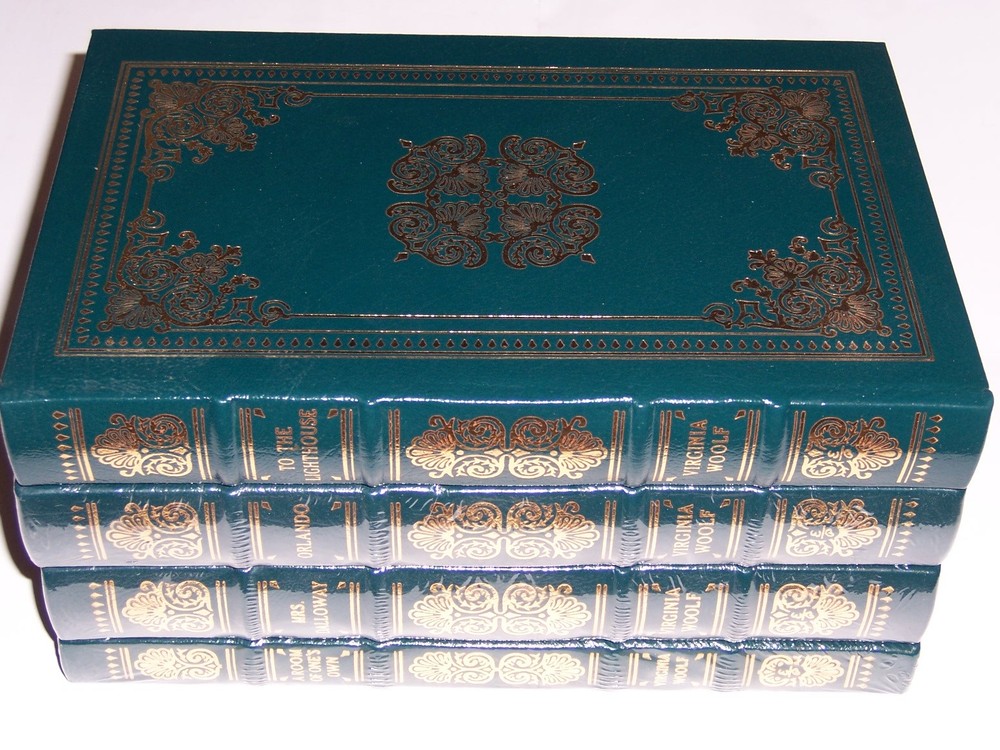 Heirloom Edition Easton Press Collected Works of VIRGINIA WOOLF in 4 vols by Virginia Woolf Teal leather binding with design on the front board exclusively illustrated with frontispiece BOUND IN GENUINE LEATHER Copyright by Easton Press Hubbed Spine, Bound in Premium Full Leather Distinctive Cover Design, Profusely Illustrated Moire Endleaves, Satin Ribbon Page Marker Accented in Real 22KT Gold, Gilt Page Edges Smyth-sewn Pages for Strength and Durability Long-lasting, High Quality Acid-neutral Paper LIST OF TITLES: a set in 4 leather-bound volumes: 1. To The Lighthouse, Foreword by Eudora Welty, illustrated by Richard Sparks 2. Mrs. Dalloway, Foreword by Maureen Howard 3. A Room of One's Own, Foreword by Mary Gordon 4. Orlando: A Biography CONDITION DESCRIPTION: this set is like new and unread condition: clean inside pages, tight binding, beautiful bright endpapers and satin ribbon page marker. SHIPPING / HANDLING: The books will be shipped via USPS media mail with delivery confirmation, special care will be taken during packing to ensure you receive the books as described.