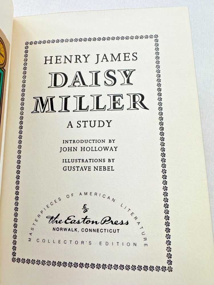 From the Masterpieces of American Literature Collection from the Easton Press... Daisy Miller by Henry James Introduction by John Holloway Illustrated by Gustave Nebel Copyright 1982 by The Easton Press Bound in Premium Full Leather This volume contains all of the classic Easton Press trimmings: Premium Leather Silk moire Endleaves Distinctive Cover Design Hubbed Spine, Accented in Real 22KT Gold Satin Ribbon Page Marker Gilded Page Edges Long-lasting, High Quality Acid-neutral Paper Smyth-sewn Pages for Strength and Durability Beautiful Illustrations A very scarce title in any condition, this volume is Absolute Mint and Unread condition. The front and back covers are both in Perfect condition and the gilded page edges show no wear at all! Aside from a blank bookplate on the page adjacent to the title page, there are markings, or other signs of prior ownership in this book . This is book is part of Masterpieces of American Literature Collection published by Easton Press and would be a beautiful addition to your Easton Press collection. Overall, this copy is a grade collector's book. This book is very elusive in this superior condition, as only a limited number of them were ever published, so now is the time to act. Hopefully you can add this book to your collection and enjoy it in the years to come... Please Email Me With Any Questions You Might Have! Shipping Info: Buyer to Pay Shipping and Handling International Bidders Pay Extra Shipping Good luck and happy bidding!