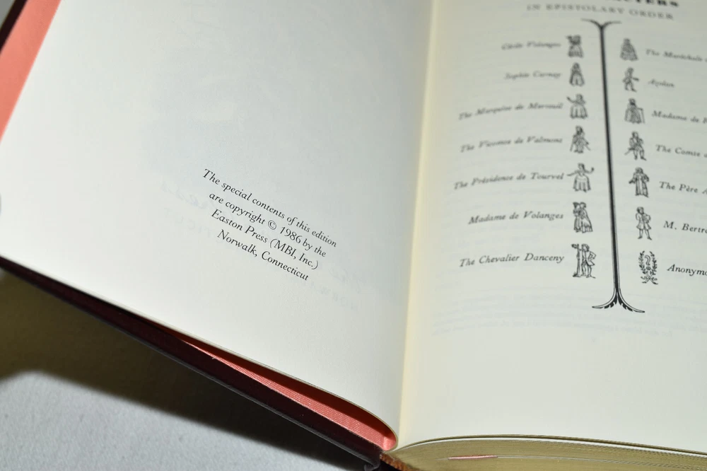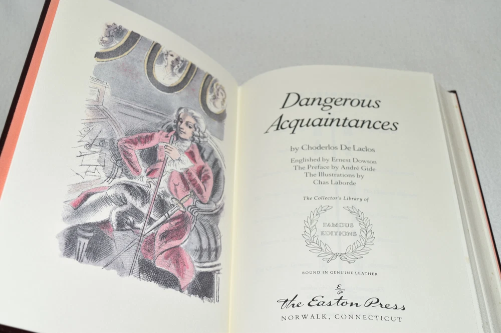 From the Easton Press Library of Famous Editions Collection... Dangerous Acquaintances by Choderlos De Laclos Introduced by Andre Gide Illustrated by Chas Laborde Copyright 1986 by The Easton Press Bound in Premium Full Leather This volume contains all of the classic Easton Press trimmings: Premium Leather Silk Moire Endleaves Distinctive Cover Design Hubbed Spine, Accented in Real 22KT Gold Satin Ribbon Page Marker Gilded Page Edges Long-lasting, High Quality Acid-neutral Paper Smyth-sewn Pages for Strength and Durability Beautiful Illustrations A very scarce title in any condition, this copy is in Fine condition. The front and back covers are both in near perfect condition and the gilded page edges show minor wear (see pictures of all sides). There are no markings, bookplates, or other signs of prior ownership. This book is part of the Library of Famous Editions Collection published by Easton Press. It would be a beautiful addition to your Easton Press collection. Hopefully you can add this book to your collection and enjoy it in the years to come... Please Email Me With Any Questions You Might Have! Shipping Info: Buyer to Pay Shipping and Handling International Bidders Pay Extra Shipping Good luck and happy bidding!