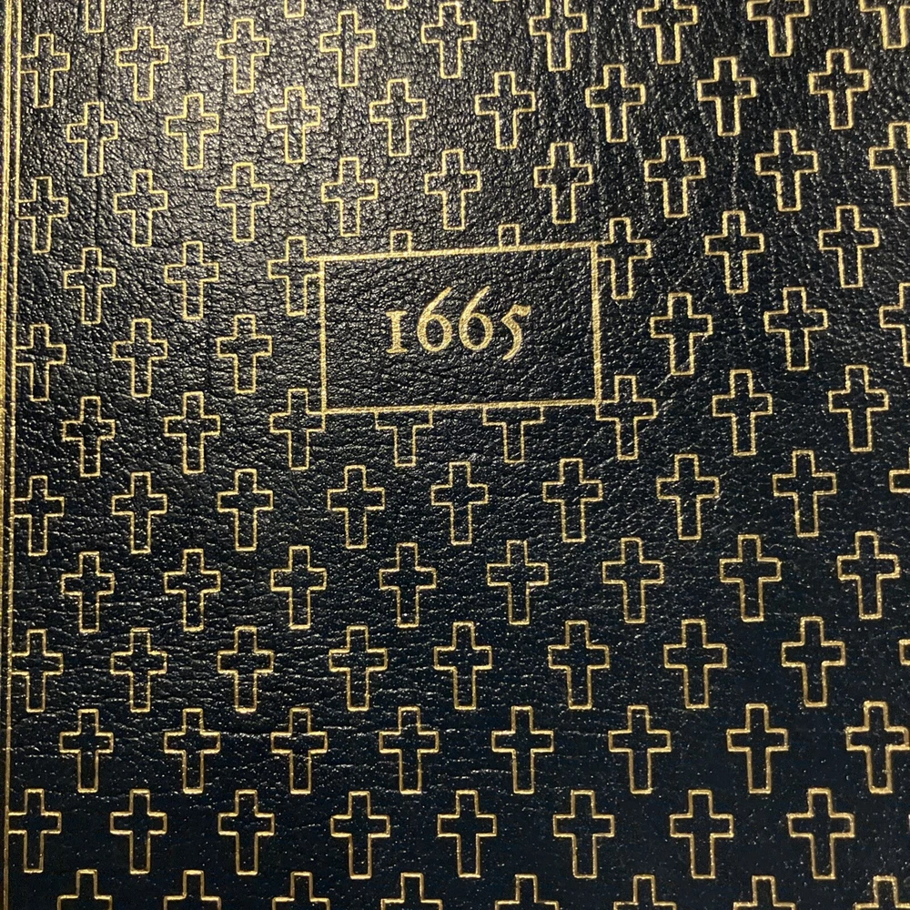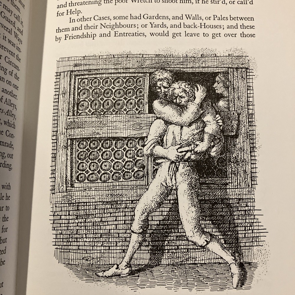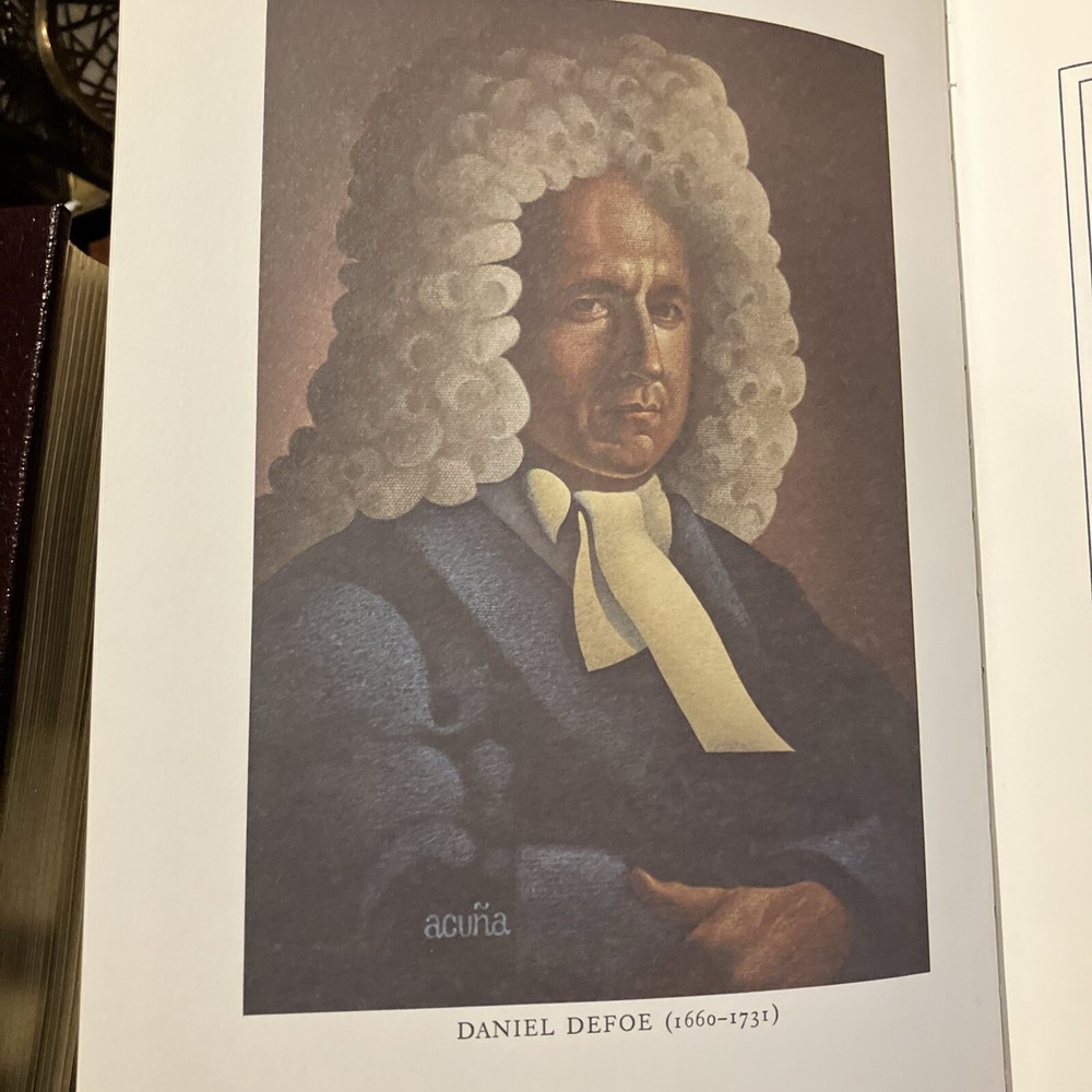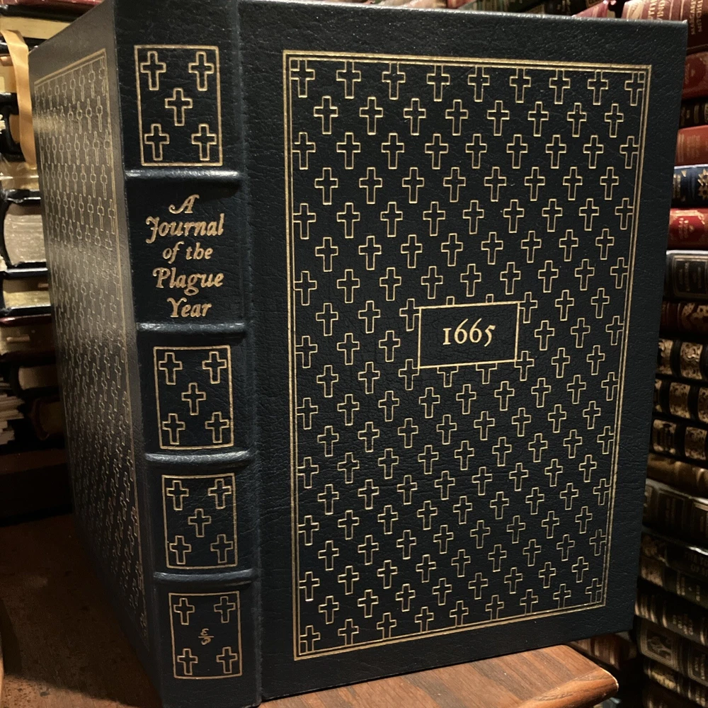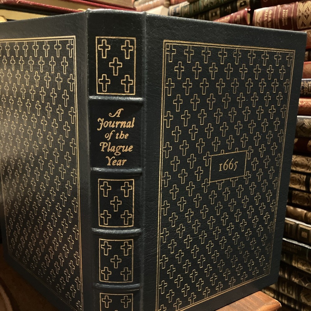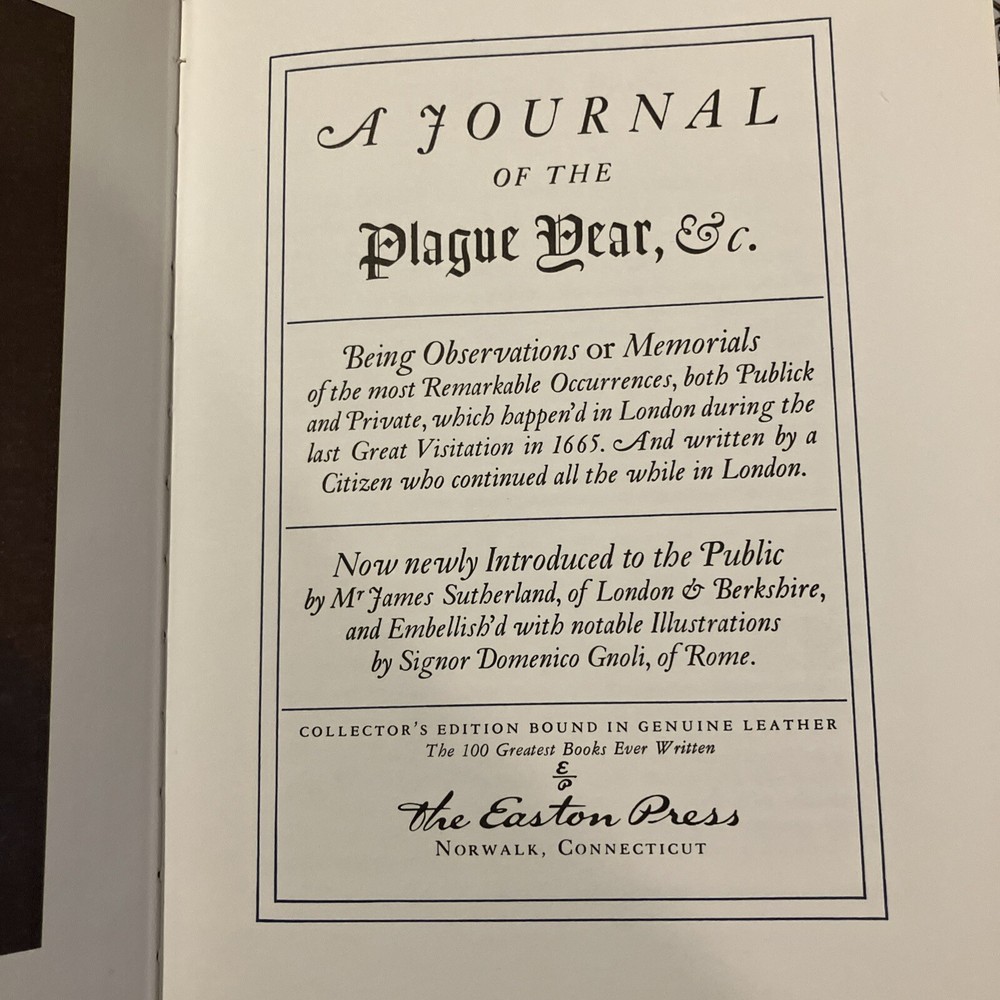 Easton Press leather edition of Daniel Defoe's "A Journal of the Plague Year, Etc.," a COLLECTOR'S edition, Illustrated by Signor Domenico Gnoli, Frontispiece Portrait of Defoe, Introduced by James Sutherland, one of the 100 GREATEST BOOKS EVER WRITTEN series, published in 197. Bound in hunter green leather, the book has camel tan moire silk end leaves, acid-free paper, Symth-sewn binding, hubbed spine, a satin book marker, gold gilding on three edges---in near FINE condition---except for a blank attached bookplate on inside flyleaf. Daniel Defoe, who lived from 1660---1731, was born in London, the son of a butcher. The Great Plague of London in 1665 was only the worse of many similar visitations since the Black Death of 1349 had carried off about one third of the English people. The epidemic of 1625 had killed 40,000 Londoners. Two parishes, St.Giles-in-the-Fields and Stepney, completed escaped the flames. Defoe described the public measures taken by authorities, such as the sequestration of the sick, the closing of infected houses, and the prohibition of assemblies, with their effect on the minds of the people. The symptoms of the disease, the circulation of the dead-carts, and burials in great pits, and the lamentable scenes witnessed by the supposed narrator are described with extraordinary vividness. The general effects of the epidemic, notably in the cessation of many trades, and the exodus from the city, are also set forth, and an estimate made of the total number of deaths from the disease. England was finally delivered from the plague by the GREAT FIRE of 1666. The book ends with these lines: "A dreadful Plague in London was, / In the Year Sixty Five, / Which swept an Hundred Thousand Souls/ Away; yet I alive!" 271 pages. I offer combined shippind.