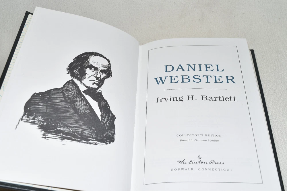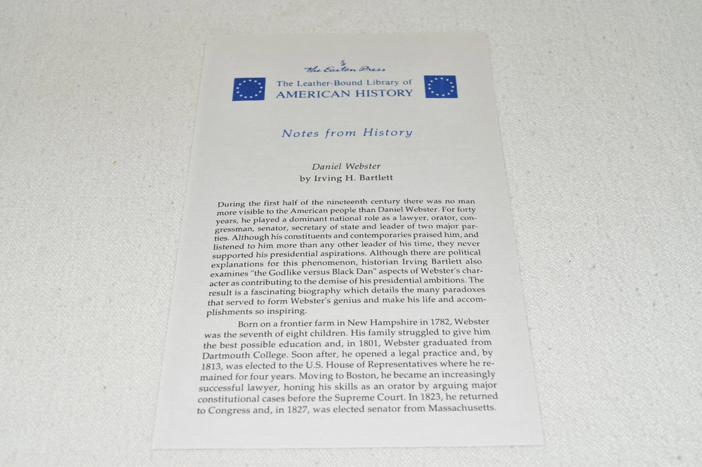 From the Easton Press Library of American History... Daniel Webster by Irving H. Bartlett Collector's Edition Copyright 1994 by The Easton Press Bound in Premium Full Leather This volume contains all of the classic Easton Press trimmings: Premium Leather Decorated Endleaves Distinctive Cover Design Hubbed Spine, Accented in Real 22KT Gold Satin Ribbon Page Marker Gilded Page Edges Long-lasting, High Quality Acid-neutral Paper Smyth-sewn Pages for Strength and Durability Beautiful Illustrations A very scarce title in any condition, this Easton Press Edition is in Near Fine condition. The front and back covers are both in terrific condition and the gilded page edges show minor wear on the side edge (see pictures of all sides of gilt). There is faint residue on the second page. This book is part of the Library of American History Collection published by Easton Press. It comes complete with Collector's Notes and would be a beautiful addition to your Easton Press collection. Please Email Me With Any Questions You Might Have! Shipping Info: Buyer to Pay Shipping and Handling International Bidders Pay Extra Shipping Seller Not Responsible For Uninsured Items Lost or Damaged in Mail Forms of Payment Accepted: Paypal Good luck and happy bidding! Powered by eBay Turbo Lister The free listing tool. List your items fast and easy and manage your active items.