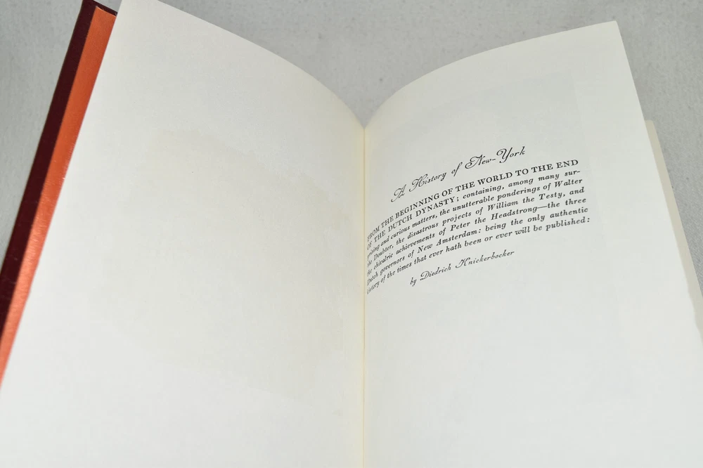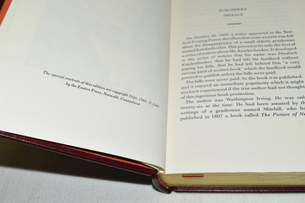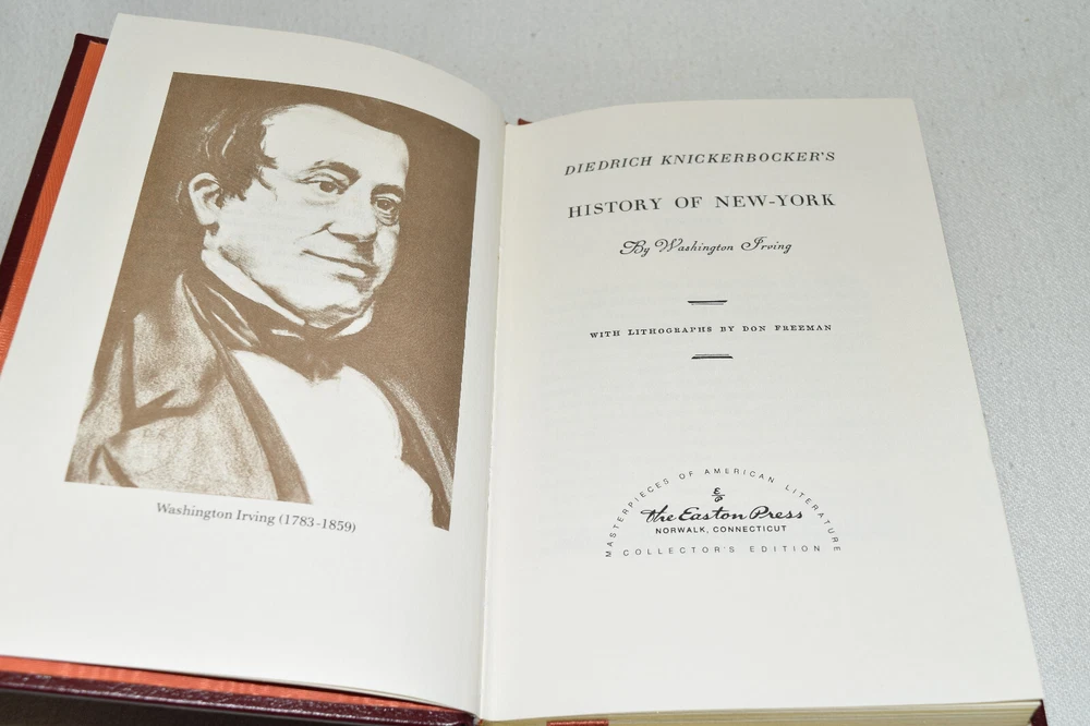 From the Easton Press Masterpieces of American Literature Collection... Diedrich Knickerbocker's History of New York by Washington Irving Artwork by Don Freeman Copyright 1980 by The Easton Press Bound in Premium Full Leather This volume contains all of the classic Easton Press trimmings: Premium Leather Decorated Endleaves Distinctive Cover Design Hubbed Spine, Accented in Real 22KT Gold Satin Ribbon Page Marker Gilded Page Edges Long-lasting, High Quality Acid-neutral Paper Smyth-sewn Pages for Strength and Durability Beautiful Illustrations A very scarce title in any condition, this volume is in Fine condition. The front and back covers are in terrific condition and the gilded page edges show hardly any wear (see pictures of all edges). There is very faint residue on the second page. This book is part of the Masterpieces of American Literature Collection published by Easton Press and would be a beautiful addition to your Easton Press collection. Hopefully you can add this book to your collection and enjoy it in the years to come... Please Email Me With Any Questions You Might Have! Shipping Info: Buyer to Pay Shipping and Handling International Bidders Pay Extra Shipping Seller Not Responsible For Uninsured Items Lost or Damaged in Mail Forms of Payment Accepted: Paypal Good luck and happy bidding! Powered by eBay Turbo Lister The free listing tool. List your items fast and easy and manage your active items.