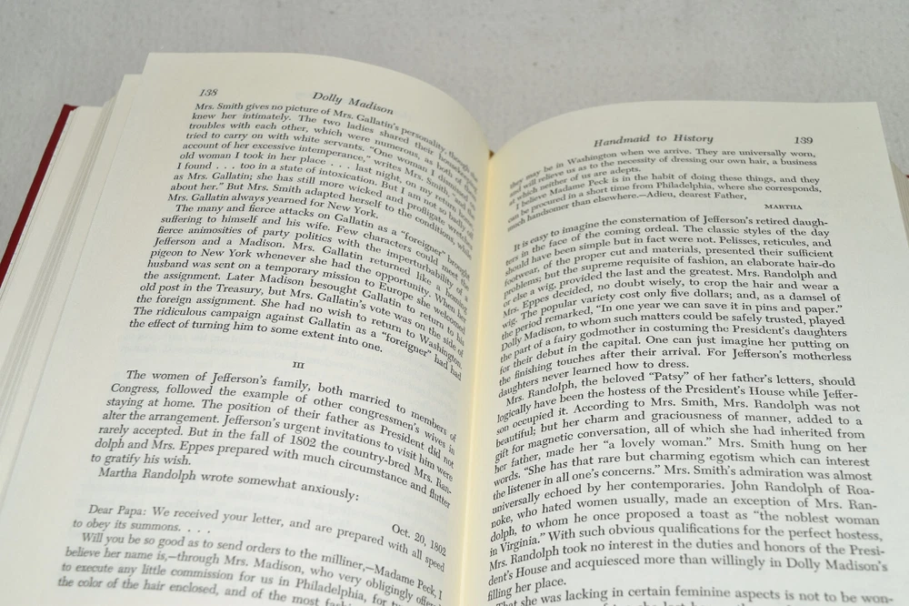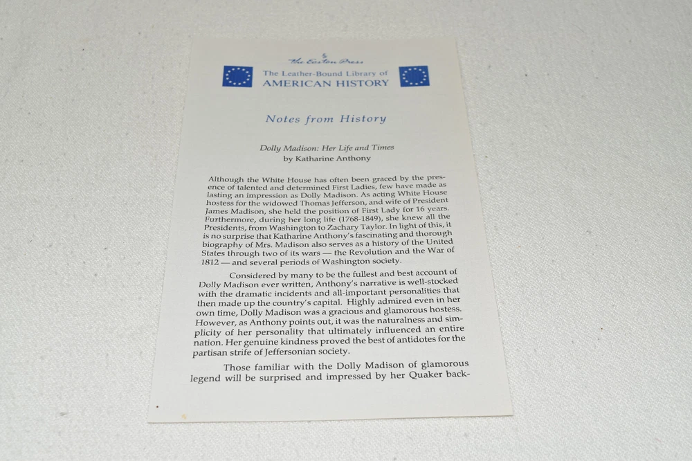 From the Easton Press Library of American History... Dolly Madison by Katharine Anthony Collector's Edition Copyright 1995 by The Easton Press Bound in Premium Full Leather This volume contains all of the classic Easton Press trimmings: Premium Leather Decorated Endleaves Distinctive Cover Design Hubbed Spine, Accented in Real 22KT Gold Satin Ribbon Page Marker Gilded Page Edges Long-lasting, High Quality Acid-neutral Paper Smyth-sewn Pages for Strength and Durability Beautiful Illustrations A very scarce title in any condition, this Easton Press Edition is in Fine condition. The front and back covers are both in terrific condition and the gilded page edges show only minor wear (see pictures of all sides of gilt). There is faint residue on the second page. This book is part of the Library of American History Collection published by Easton Press. It comes complete with Collector's Notes and would be a beautiful addition to your Easton Press collection. Please Email Me With Any Questions You Might Have! Shipping Info: Buyer to Pay Shipping and Handling International Bidders Pay Extra Shipping Seller Not Responsible For Uninsured Items Lost or Damaged in Mail Forms of Payment Accepted: Paypal Good luck and happy bidding! Powered by eBay Turbo Lister The free listing tool. List your items fast and easy and manage your active items.