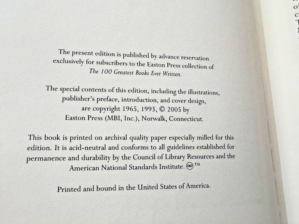 From the Easton Press 100 Greatest Books Ever Written... Dracula by Bram Stoker Illustrated by Felix Hoffmann Copyright 2005 by The Easton Press Bound in Premium Full Leather This volume contains all of the classic Easton Press trimmings: Premium Leather Silk Moire Endleaves Distinctive Cover Design Hubbed Spine, Accented in Real 22KT Gold Satin Ribbon Page Marker Gilded Page Edges Long-lasting, High Quality Acid-neutral Paper Smyth-sewn Pages for Strength and Durability Beautiful Illustrations DESCRIPTION A very scarce title in any condition, this Edition is in Mint and Unread condition. The front and back covers are in near Perfect condition and the gilded page edges show hardly any wear at all! The first couple pages have a small crease. This book is part of the 100 Greatest Books Ever Written Collection published by The Easton Press and comes with a blank attached bookplate. It would be a beautiful addition to your Easton Press collection. Overall, this copy is a grade collector's book. This book is very elusive in this superior condition, as only a limited number of them were ever published, so now is the time to act. Hopefully you can add this book to your collection and enjoy it in the years to come... SHIPPING POLICY We take great care packaging every item to ensure safe shipment to you. Items are packaged using plenty of bubble wrap and packaged securely in a sturdy box. Our secure shipping methods have resulted in zero damaged items in over 15 years! Items are shipped out within 1 - 3 days of payment being received. RETURN & REFUND POLICY We accept refunds within 30 days of purchase. If you are not 100% satisfied with your purchase, please contact us about a refund, or initiate a refund through eBay. CONTACT US We are committed to providing our customers with the best possible on-line shopping experience. This includes a commitment to excellent customer service, before you purchase as well as after your order has been delivered. Please feel free to submit any questions or inquiries regarding this item or your order by sending us a message through the eBay messaging system. We will typically respond within 24 hours of receiving your message.