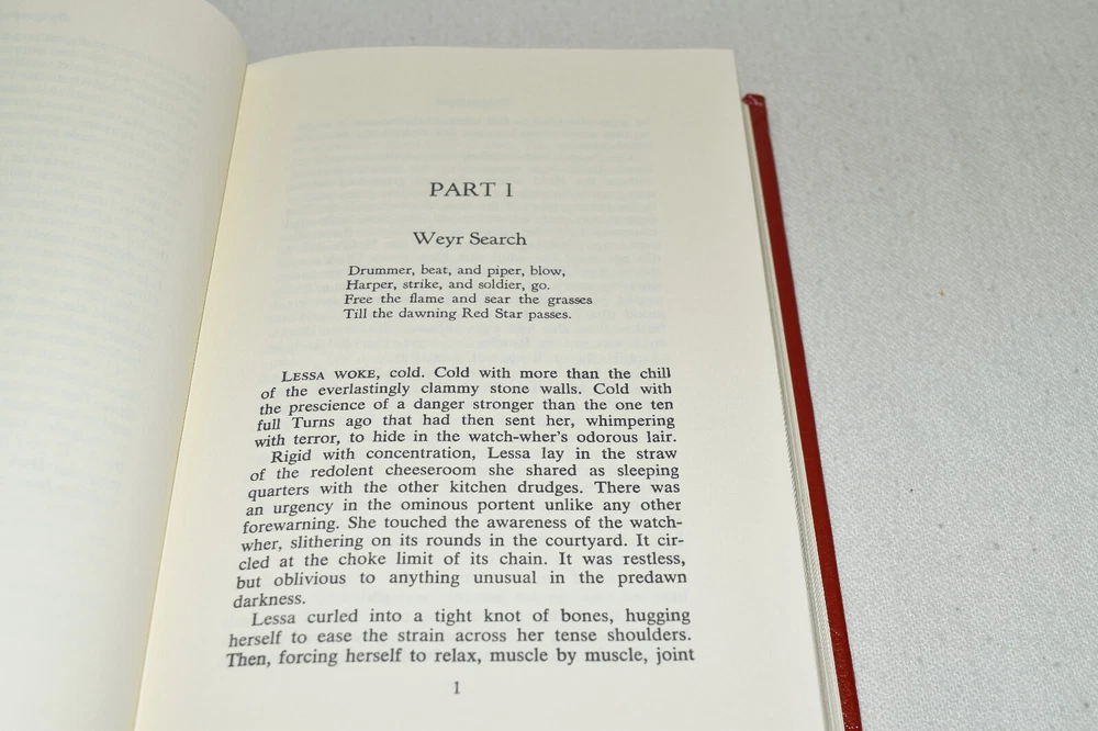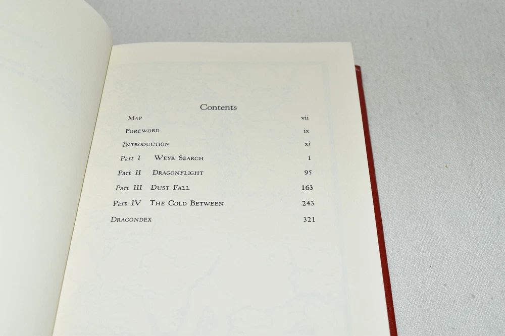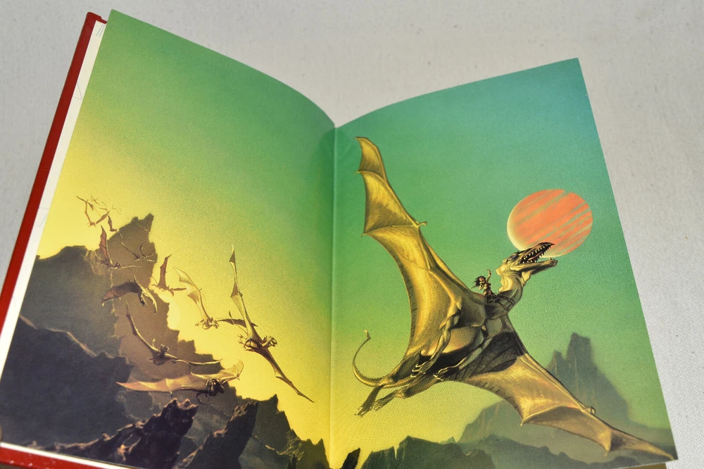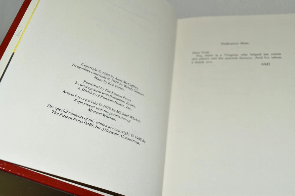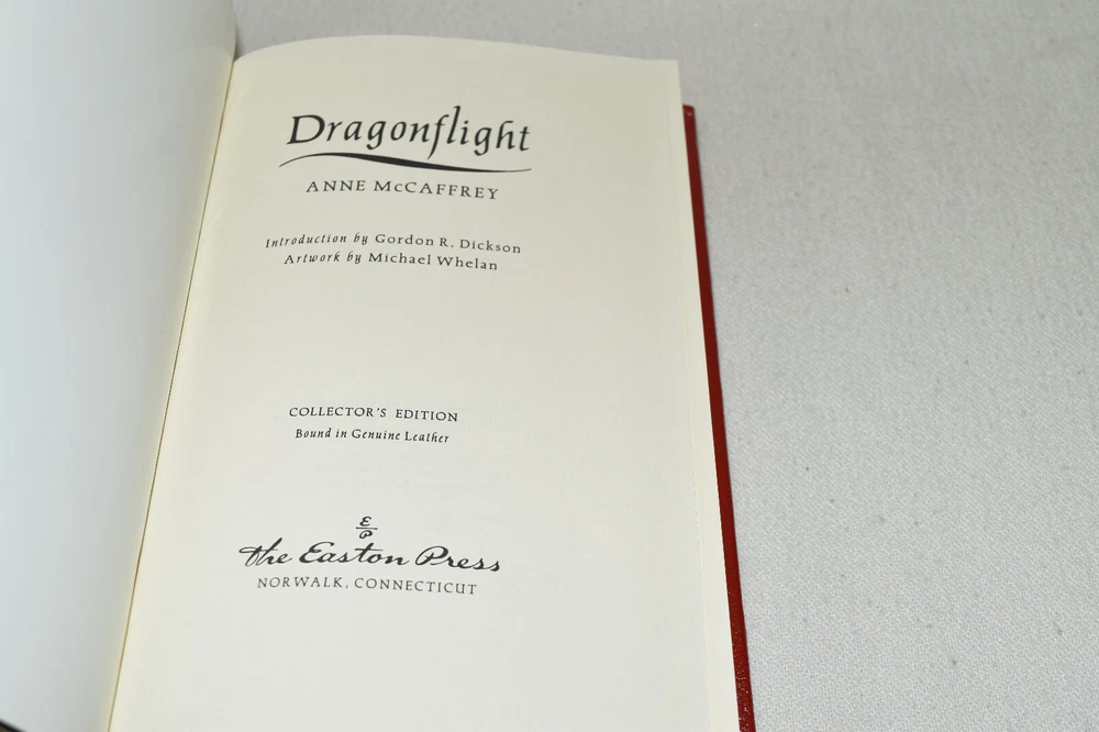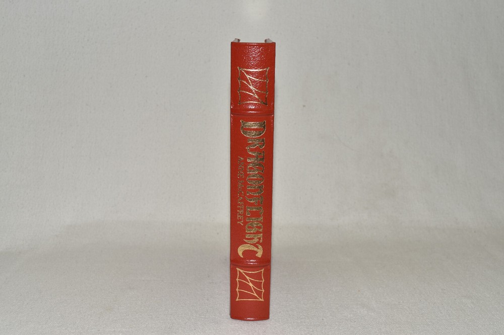 From the Easton Press Masterpieces of Science Fiction Collection... Dragonflight by Anne McCaffrey Introduction by Gordon Dickson Illustration by Michael Whelan Copyright 1978 by The Easton Press Bound in Premium Full Leather This volume contains all of the classic Easton Press trimmings: Premium Leather Decorated Endleaves Distinctive Cover Design Hubbed Spine, Accented in Real 22KT Gold Satin Ribbon Page Marker Gilded Page Edges Long-lasting, High Quality Acid-neutral Paper Smyth-sewn Pages for Strength and Durability Beautiful Illustrations A very scarce title in any condition, this volume is in Fine condition. The front and back covers are in terrific condition and the gilded page edges show minor wear (see pictures of all edges). There is faint residue on the second page. This book is part of the Masterpieces of Science Fiction Collection published by Easton Press and would be a beautiful addition to your Easton Press collection. Hopefully you can add this book to your collection and enjoy it in the years to come... Please Email Me With Any Questions You Might Have! Shipping Info: Buyer to Pay Shipping and Handling International Bidders Pay Extra Shipping Seller Not Responsible For Uninsured Items Lost or Damaged in Mail Forms of Payment Accepted: Paypal Good luck and happy bidding! Powered by eBay Turbo Lister The free listing tool. List your items fast and easy and manage your active items.