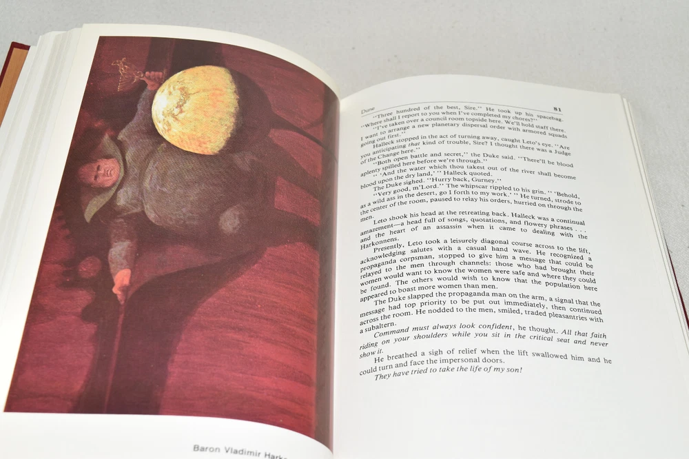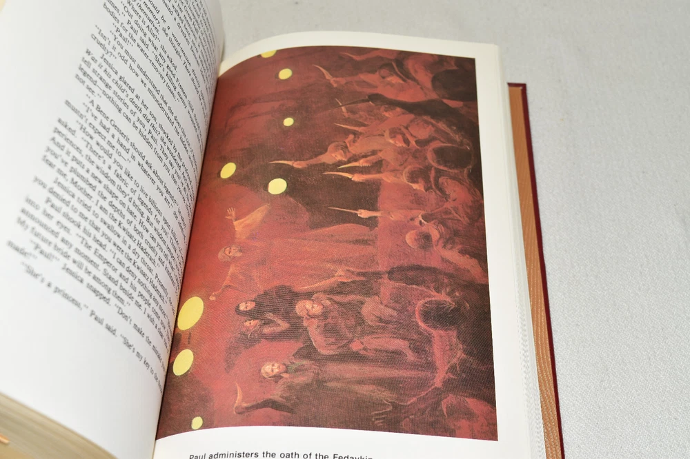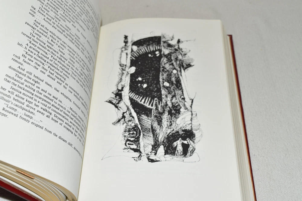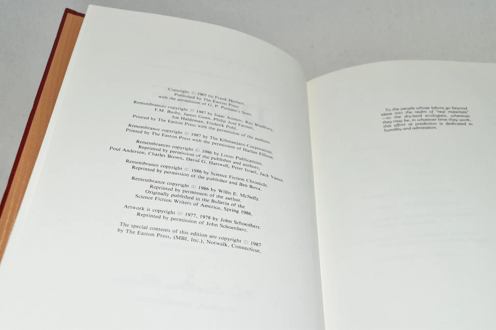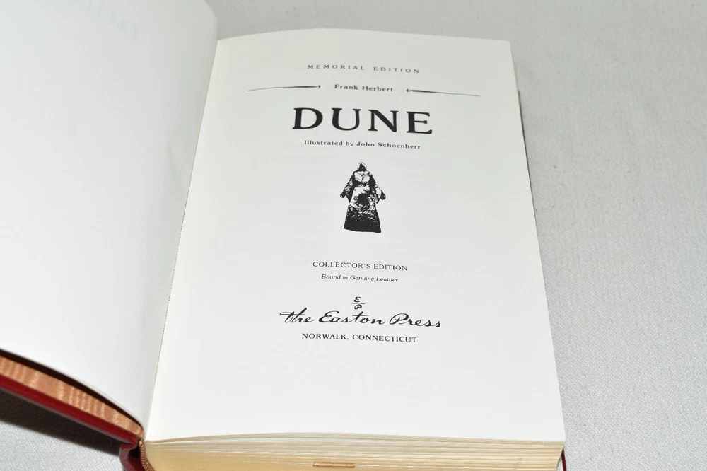 From the Easton Press Masterpieces of Science Fiction Collection... Dune Memorial Edition by Frank Herbert Artwork by John Schoenherr Copyright 1987 by The Easton Press Bound in Premium Full Leather This volume contains all of the classic Easton Press trimmings: Premium Leather Decorated Endleaves Distinctive Cover Design Hubbed Spine, Accented in Real 22KT Gold Satin Ribbon Page Marker Gilded Page Edges Long-lasting, High Quality Acid-neutral Paper Smyth-sewn Pages for Strength and Durability Beautiful Illustrations A very scarce title in any condition, this volume is in Fine condition. The front and back covers are both in terrific condition and the gilded page edges show only faint wear (see pictures of all edges). There is very faint residue on the second page. This book is part of the Masterpieces of Science Fiction Collection published by Easton Press and would be a beautiful addition to your Easton Press collection. Overall, this copy is a grade collector's book. This book is very elusive in this superior condition, as only a limited number of them were ever published, so now is the time to act. Hopefully you can add this book to your collection and enjoy it in the years to come... Please Email Me With Any Questions You Might Have! Shipping Info: Buyer to Pay Shipping and Handling International Bidders Pay Extra Shipping Seller Not Responsible For Uninsured Items Lost or Damaged in Mail Forms of Payment Accepted: Paypal Good luck and happy bidding! Powered by eBay Turbo Lister The free listing tool. List your items fast and easy and manage your active items.