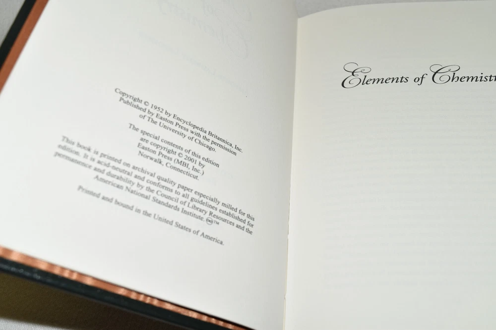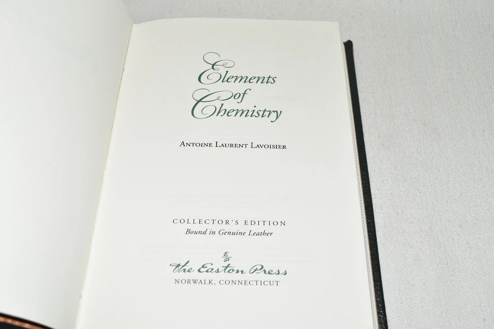 From the Easton Press Collection... Elements of Chemistry by Antoine Laurent Lavoisier C ollector's Edition Copyright 2001 by The Easton Press Bound in Premium Full Leather This volume contains all of the classic Easton Press trimmings: Premium Leather Silk Moire Endleaves Distinctive Cover Design Hubbed Spine, Accented in Real 22KT Gold Satin Ribbon Page Marker Gilded Page Edges Long-lasting, High Quality Acid-neutral Paper Smyth-sewn Pages for Strength and Durability Beautiful Illustrations A very scarce title in any condition, this Easton Press First Limited Edition is in Fine condition. The front and back covers are both in terrific condition and the gilded page edges show faint wear (see pictures of all gilt sides). There are no bookplates, markings, or other signs of prior ownership in this book. This book was published by Easton Press and would be a beautiful addition to your Easton Press collection. Hopefully you can add this book to your collection and enjoy it in the years to come... Please Email Me With Any Questions You Might Have! Shipping Info: Buyer to Pay Shipping and Handling International Bidders Pay Extra Shipping Seller Not Responsible For Uninsured Items Lost or Damaged in Mail Forms of Payment Accepted: Paypal Good luck and happy bidding! Powered by eBay Turbo Lister The free listing tool. List your items fast and easy and manage your active items.