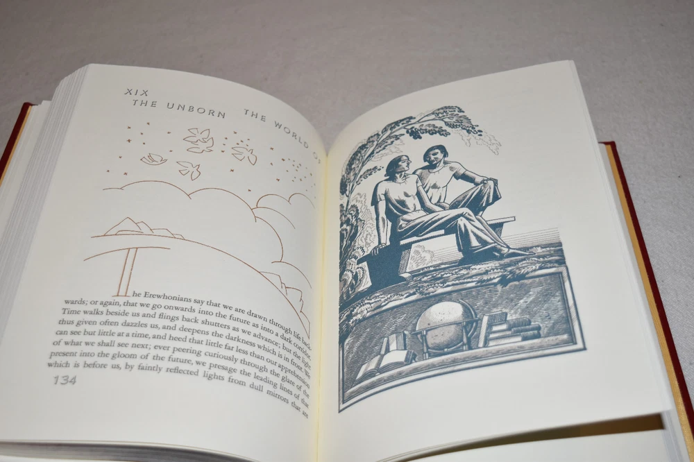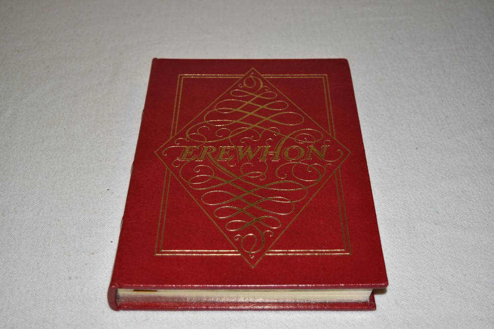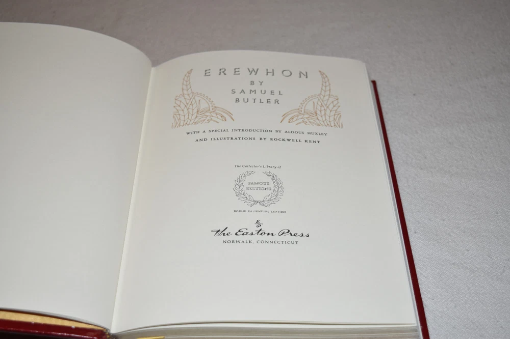 From the Easton Press Famous Editions Collection... Erewhon by Samuel Butler Illustrated by Rockwell Kent Introduced by Aldous Huxley Copyright 1934 by The Easton Press Bound in Premium Full Leather This volume contains all of the classic Easton Press trimmings: Premium Leather Silk Moire Endleaves Distinctive Cover Design Hubbed Spine, Acccented in Real 22KT Gold Satin Ribbon Page Marker Gilded Page Edges Long-lasting, High Quality Acid-neutral Paper Smyth-sewn Pages for Strength and Durability Beautiful Illustrations A very scarce title in any condition, this volume is in Fine condition! The front and back covers are both in near perfect condition showing faint wear and the gilded page edges show hardly any wear (see pictures). There are no markings, bookplates, or other signs of prior ownership in this book . This book is part of The Famous Editions Collection series published by Easton Press. It would be a beautiful addition to your Easton Press collection. Overall, this copy is a grade collector's book. This book is very elusive in this superior condition, as only a limited number of them were ever published, so now is the time to act. Hopefully you can add this book to your collection and enjoy it in the years to come... Please Email Me With Any Questions You Might Have! Shipping Info: Buyer to Pay Shipping & Handling International Bidders Pay Extra Shipping Good luck and happy bidding!