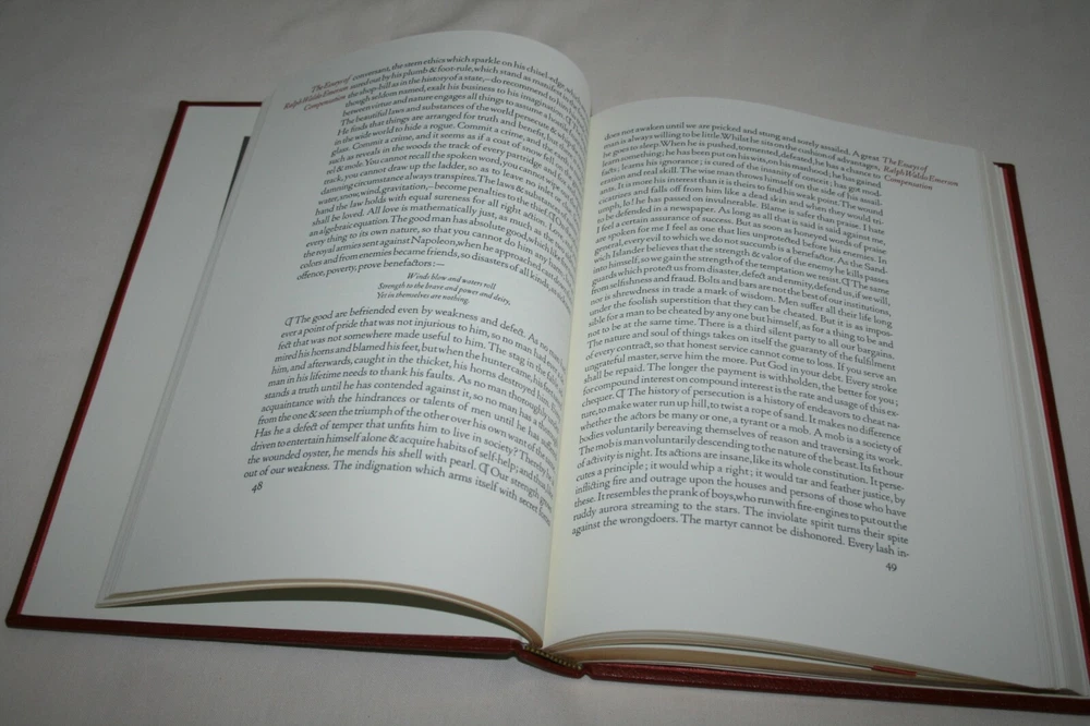 From the Easton Press 100 Greatest Books Ever Written Collection... The Essays of Ralph Waldo Emerson With Critical Introduction by Edward F. O'Day The First Series - MDCCCXLI And the Second Series - MDCCCXLIV In One Volume Collector's Edition Copyright 1979 by The Easton Press Bound in Premium Full Leather This volume contains all of the classic Easton Press trimmings: Premium Leather Silk Moire Endleaves Distinctive Cover Design Hubbed Spine, Accented in Real 22KT Gold Satin Ribbon Page Marker Gilded Page Edges Long-lasting, High Quality Acid-neutral Paper Smyth-sewn Pages for Strength and Durability A very scarce title in any condition, this Massive, 1979 Easton Press First Edition is in Mint and Unread condition! The book measures 8.5" by 12". The front and back covers are both in near Perfect condition and the gilded page edges show no wear at all! There is no attached bookplate nor any other signs of previous ownership. This book is part of the 100 Greatest Books Ever Written Collection published by Easton Press and would be a beautiful addition to your Easton Press collection. Overall, this copy is a grade collector's book. This book is very elusive in this superior condition, as only a limited number of them were ever published, so now is the time to act. Hopefully you can add this book to your collection and enjoy it in the years to come... Please Email Me With Any Questions You Might Have! Shipping Info: Buyer to Pay Shipping and Handling International Bidders Pay Extra Shipping Seller Not Responsible For Uninsured Items Lost or Damaged in Mail Good luck and happy bidding!