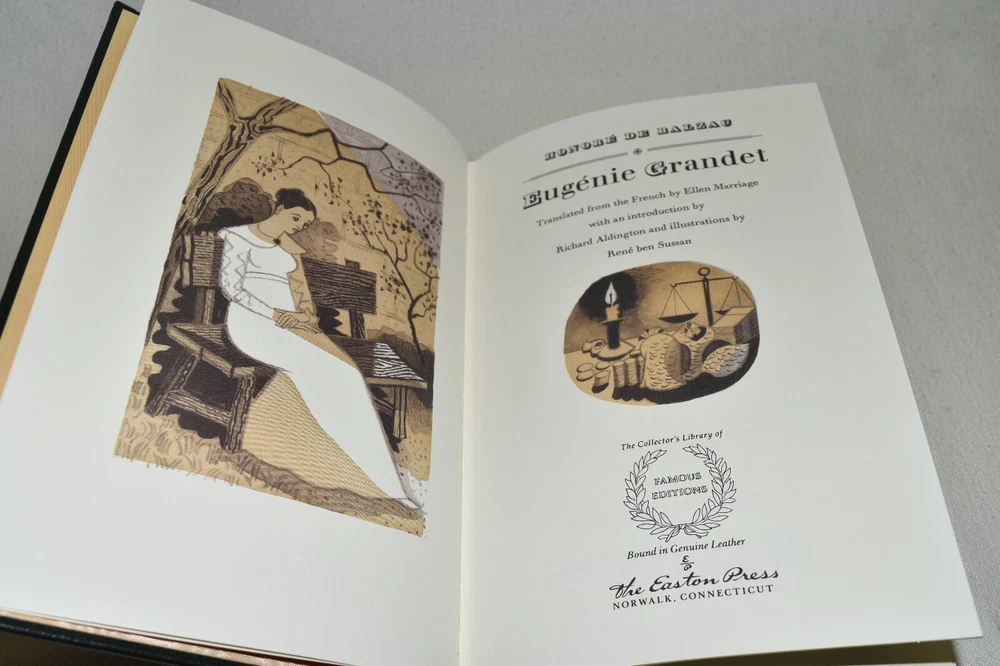 From the Easton Press Library of Famous Editions Collection... Eugenie Grandet by Honore de Balzac Translated by Ellen Marriage Introduced by Richard Aldington Illustrated by Rene ben Sussan Copyright 1996 by The Easton Press Bound in Premium Full Leather This volume contains all of the classic Easton Press trimmings: Premium Leather Silk Moire Endleaves Distinctive Cover Design Hubbed Spine, Accented in Real 22KT Gold Satin Ribbon Page Marker Gilded Page Edges Long-lasting, High Quality Acid-neutral Paper Smyth-sewn Pages for Strength and Durability Beautiful Illustrations A very scarce title in any condition, this copy is in Fine condition. The front and back covers are both in near perfect condition and the gilded page edges show hardly any wear (see pictures of all gilt sides). There is light residue on the second page. This book is part of the Library of Famous Editions Collection published by Easton Press. It comes complete with Collector's Notes and would be a beautiful addition to your Easton Press collection. Overall, this copy is a grade collector's book. This book is very elusive in this superior condition, as only a limited number of them were ever published, so now is the time to act. Hopefully you can add this book to your collection and enjoy it in the years to come... Please Email Me With Any Questions You Might Have! Shipping Info: Buyer to Pay Shipping and Handling International Bidders Pay Extra Shipping Good luck and happy bidding!