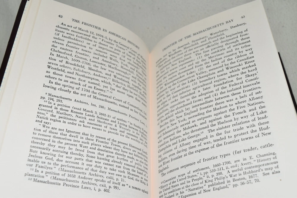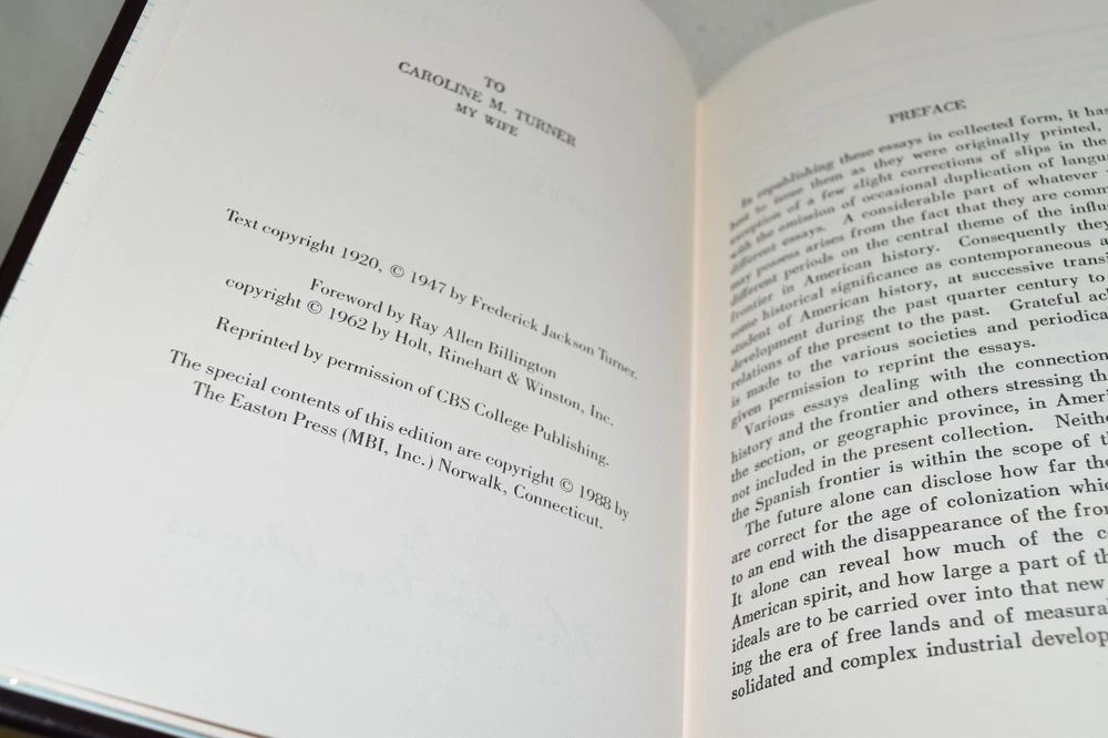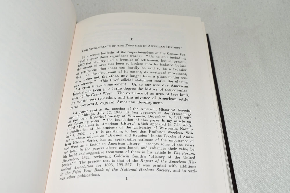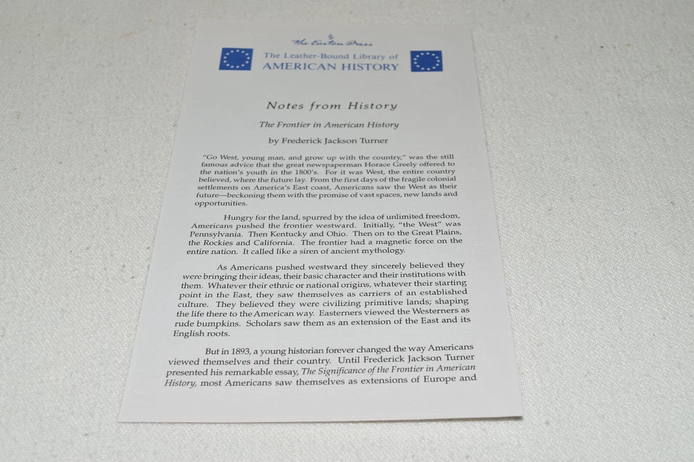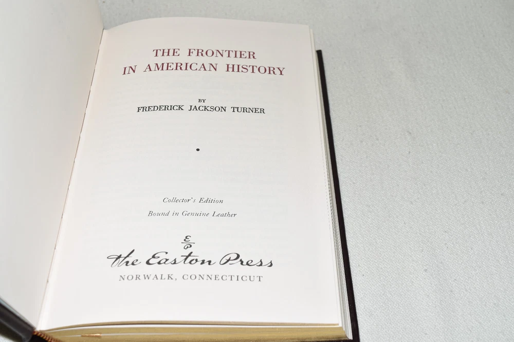 From the Easton Press Library of American History... The Frontier in American History by Frederick Jackson Turner Collector's Edition Copyright 1988 by The Easton Press Bound in Premium Full Leather This volume contains all of the classic Easton Press trimmings: Premium Leather Decorated Endleaves Distinctive Cover Design Hubbed Spine, Accented in Real 22KT Gold Satin Ribbon Page Marker Gilded Page Edges Long-lasting, High Quality Acid-neutral Paper Smyth-sewn Pages for Strength and Durability Beautiful Illustrations A very scarce title in any condition, this Easton Press Edition is in Fine condition. The front and back covers are both in terrific condition showing minor wear to the binding and sides and the gilded page edges show only faint wear (see pictures of all sides of gilt). There are no markings, bookplate, or other signs of prior ownership in this book. This book is part of the Library of American History Collection published by Easton Press. It comes complete with Collector's Notes and would be a beautiful addition to your Easton Press collection. Please Email Me With Any Questions You Might Have! Shipping Info: Buyer to Pay Shipping and Handling International Bidders Pay Extra Shipping Seller Not Responsible For Uninsured Items Lost or Damaged in Mail Forms of Payment Accepted: Paypal Good luck and happy bidding! Powered by eBay Turbo Lister The free listing tool. List your items fast and easy and manage your active items.