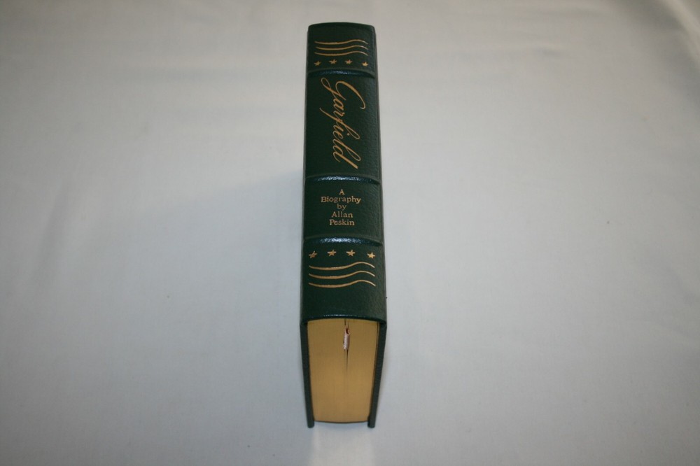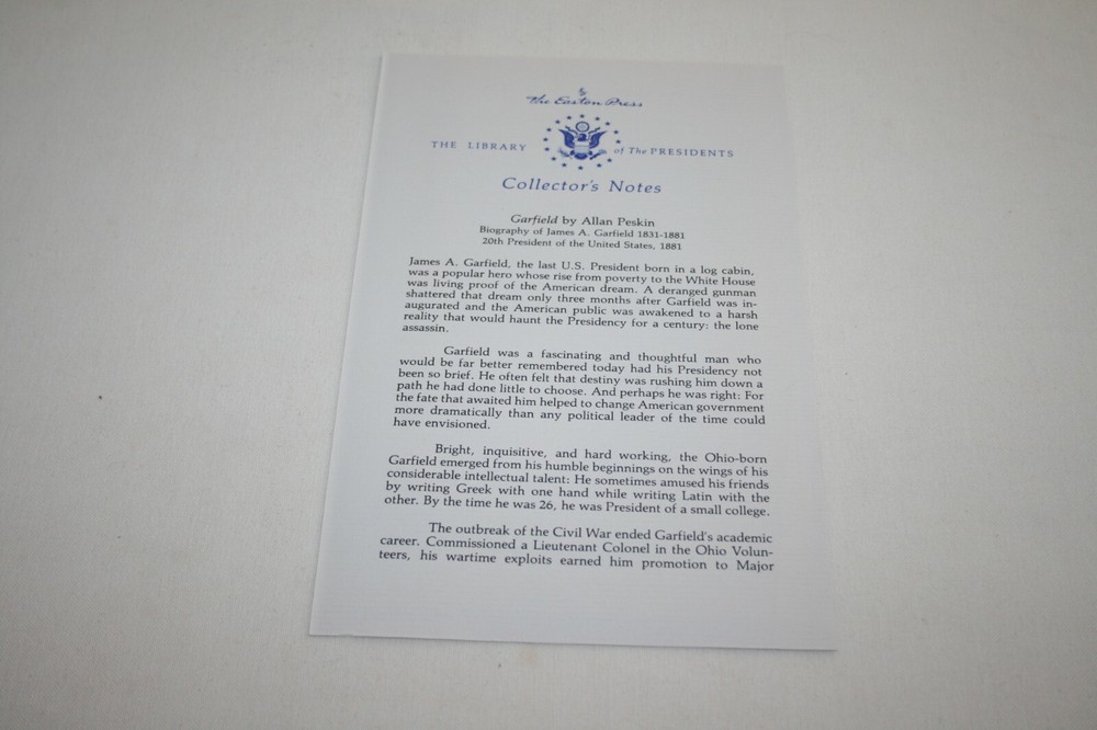From the Easton Press Library of the Presidents Collector's Edition Series... Garfield A Biography by Allan Peskin Copyright 1987 by The Easton Press Bound in Premium Full Leather Collector's Edition This volume contains all of the classic Easton Press trimmings: Premium Leather Decorated Endleaves Distinctive Cover Design Hubbed Spine, Accented in Real 22KT Gold Satin Ribbon Page Marker Gilded Page Edges Long-lasting, High Quality Acid-neutral Paper Smyth-sewn Pages for Strength and Durability A very scarce title in any condition, this copy is in Absolute Pristine and Unread condition. The front and back covers are both in Perfect condition and the gilded page edges show no wear at all! The binding is tight and square without spine lean. This book is part of the Library of Presidents published by Easton Press and comes complete with the Collector's Notes and attached bookplate from the previous owner. It would be a beautiful addition to your Easton Press collection. Overall, this copy is a grade collector's book. This book is very elusive in this superior condition, as only a limited number of them were ever published, so now is the time to act. Hopefully you can add this book to your collection and enjoy it in the years to come... Please Email Me With Any Questions You Might Have! Shipping Info: Buyer to Pay Shipping and Handling International Bidders Pay Extra Shipping Forms of Payment Accepted: Paypal Good luck and happy bidding! Powered by eBay Turbo Lister The free listing tool. List your items fast and easy and manage your active items.