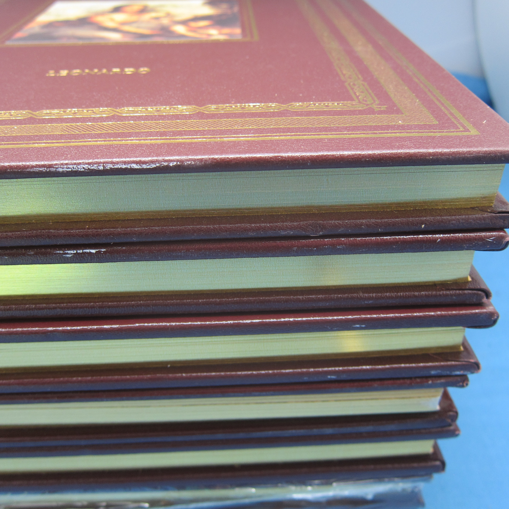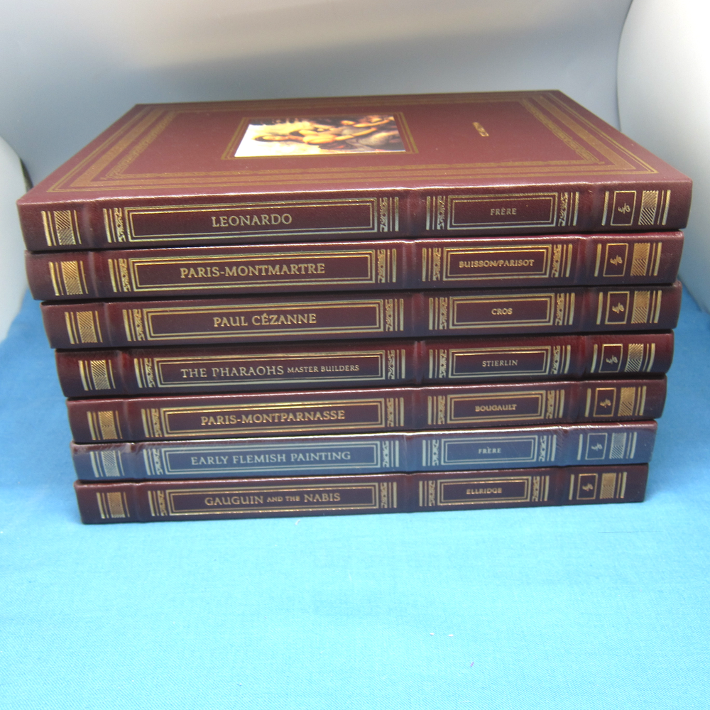 Lot of 7 books in the Glorious Art: The Most Beautiful Art Books Ever Published series from Easton Press. Includes: Gauguin and the Nabis, by Ellridge - like new Early Flemish Painting, by Frere - Brand new, factory sealed Paris - Montparnasse, by Bougault - like new The Pharaohs, Master Builders, by Stierlin - minor white marks on the bottom edge and one small bit of damage to the gilt edge Paul Cezanne, by Cros - minor white marks on the bottom edge Paris-Montmartre, by Buisson and Barisot - minor white marks on the bottom edge Leonardo, by Frere - minor white marks on the bottom edge