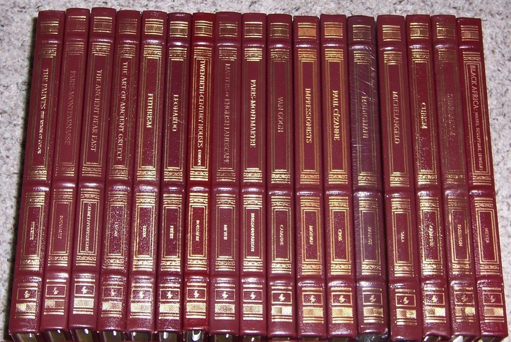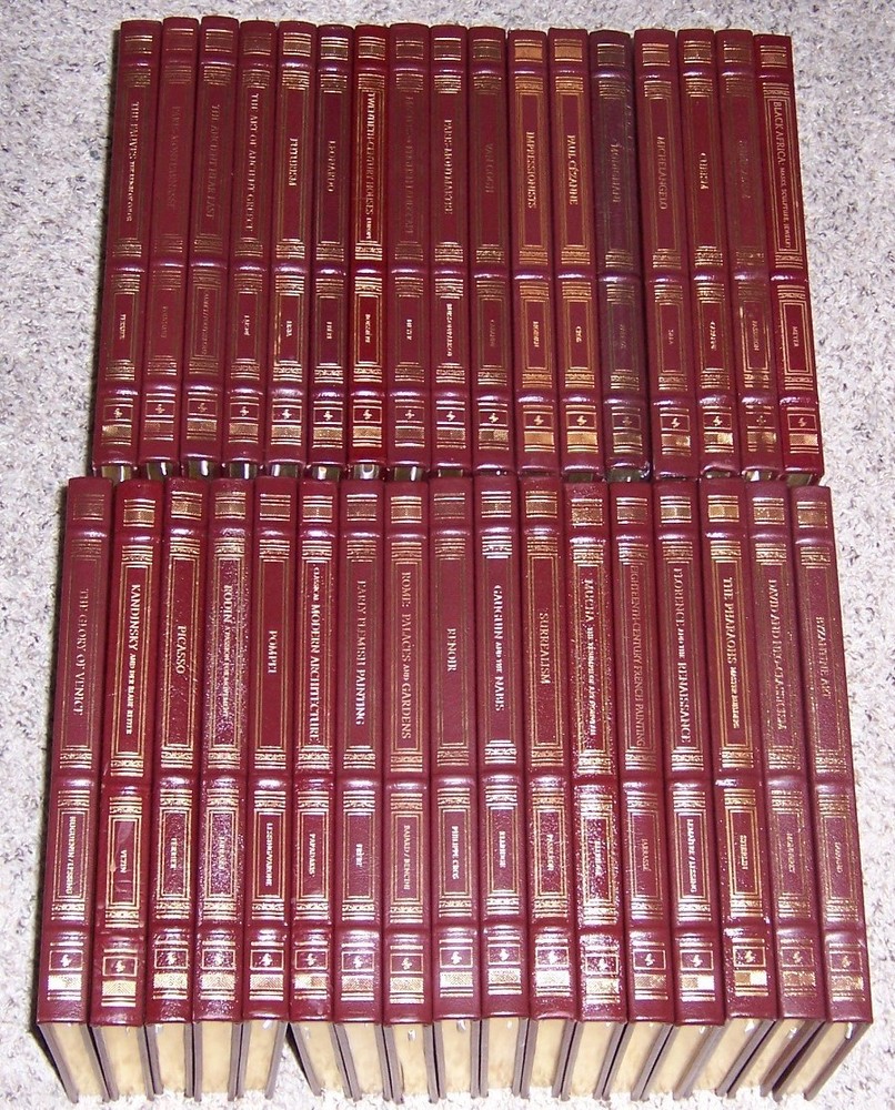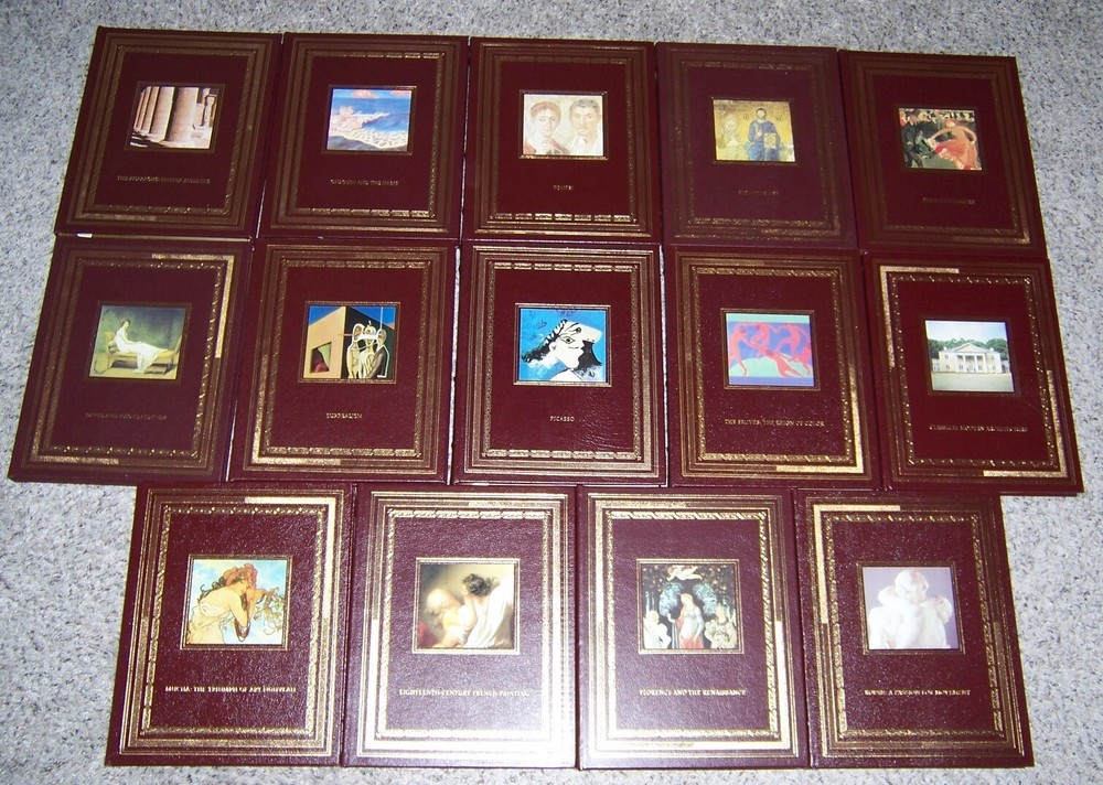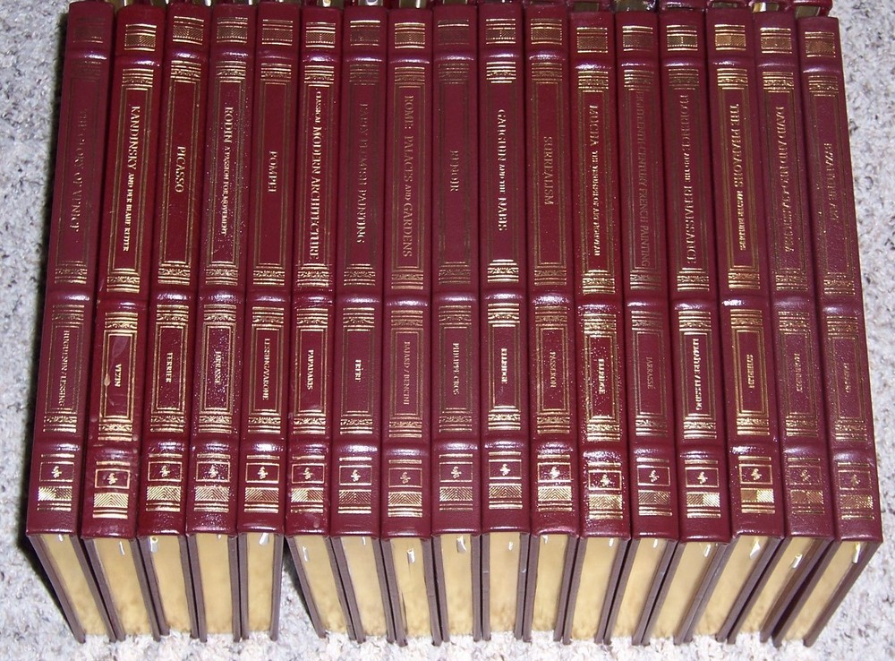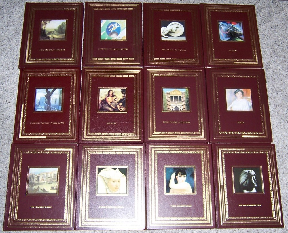 The most beautiful collection of art books ever published Easton Press GLORIOUS ART Series in 34 volumes various authors with informative text and quality reproduction of artworks, measured by 9.5" x 12", takes about 36” shelf space out of print and individual title goes as high as $150, do not miss out this good deal Copyright by The Easton Press hubbed spine, bound in premium full leathers distinctive cover design, beautiful illustrations handsome, readable typefaces, permanent satin ribbon page marker elegant gilded page edges, endsheets of rich moire fabric thread-sewn pages for durability and strength, long-lasting high quality, acid-neutral paper LIST OF TITLES: Easton Press is proud to present the most comprehensive series of art books ever conceived, handsomely bound in leather. These remarkable books overflow with an abundance of art from all of history and the entire world; stunning art from ancient, medieval, Renaissance, modern, and postmodern periods; painting, sculpture, design, and more. These books will change the way you and your family experience art. Here is a series in 34 volumes: 1. Architecture of the Future 2. The Art of Ancient Greece, by Laisne 3. The Ancient Near East, by Caubet and Pouyssegur 4. Byzantine Art, by Durand 5. Black Africa: Masks, Sculpture, Jewelry, by Meyer 6. Cubism, by Cabanne 7. Classical Modern Architecture, by Papadakis 8. Kandinsky and Der Blaue Reiter 9. David and Neo-Classicism, by Monneret 10. Eighteenth-Century French Painting, by Jarrasse 11. Early Flemish Paintings, by Frere 12. The Fauves: The Reign of Color, by Ferrier 13. Florence and the Renaissance, by Lemaitre and Lessing 14. Futurism, by Lista 15. Gauguin and the Nabis, by Ellridge 16. The Glory of Venice, by Huguenin and Lessing 17. Impressionists, by Morvan 18. Twentieth-Century Houses -Europe, by Olivier Boissiere 19. Leonardo, by Frere 20. Michelangelo, by Sala 21. Modigliani, by Parisot 22. Masters of English Landscape, by Meyer 23. Mucha: The Triumph of Art Nouveau, by Ellridge 24. Paris-Montmartre, by Buisson and Parisot 25. Paris-Montparnasse, by Bougault 26. Surrealism, by Passeron 27. The Pharaohs: Master Builders, by Sterlin 28. Paul Cezanne, by Cros 29. Picasso, by Ferrier 30. Pompei, by Lessing and Varone 31. Renoir, by Philippe Cros 32. Rodin: A Passion for Movement, by Jarrasse 33. Rome: Palaces and Gardens, by Bajard and Bencini 34. Van Gogh, by Cabanne CONDITION DESCRIPTION: Like new and unread condition, binding is tight and gold page edging still shiny, beautiful bright endleaves and satin ribbon page marker. This set could be a precious addition to your family library. SHIPPING / HANDLING: Book(s) will be handled/packed very safely, and shipped via USPS media mail with delivery confirmation.