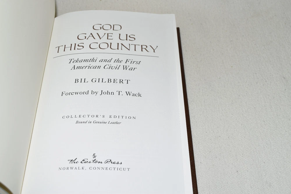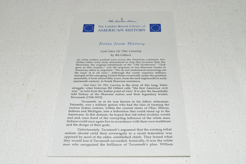 From the Easton Press Library of American History... God Gave Us This Country Tekamthi and the First American Civil War by Bill Gilbert Foreword by John Wack Collector's Edition Copyright 1994 by The Easton Press Bound in Premium Full Leather This volume contains all of the classic Easton Press trimmings: Premium Leather Decorated Endleaves Distinctive Cover Design Hubbed Spine, Accented in Real 22KT Gold Satin Ribbon Page Marker Gilded Page Edges Long-lasting, High Quality Acid-neutral Paper Smyth-sewn Pages for Strength and Durability Beautiful Illustrations A very scarce title in any condition, this Easton Press Edition is in Fine condition. The front and back covers are both in terrific condition and the gilded page edges show hardly any wear (see pictures of all sides of gilt). There are no markings, bookplate, or other signs of prior ownership in this book. This book is part of the Library of American History Collection published by Easton Press. It comes complete with Collector's Notes and would be a beautiful addition to your Easton Press collection. Please Email Me With Any Questions You Might Have! Shipping Info: Buyer to Pay Shipping and Handling International Bidders Pay Extra Shipping Seller Not Responsible For Uninsured Items Lost or Damaged in Mail Forms of Payment Accepted: Paypal Good luck and happy bidding! Powered by eBay Turbo Lister The free listing tool. List your items fast and easy and manage your active items.