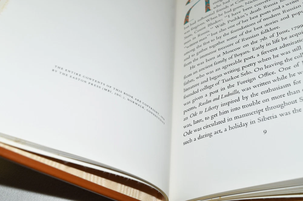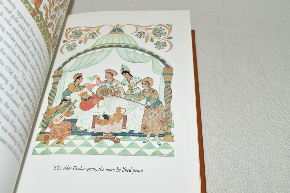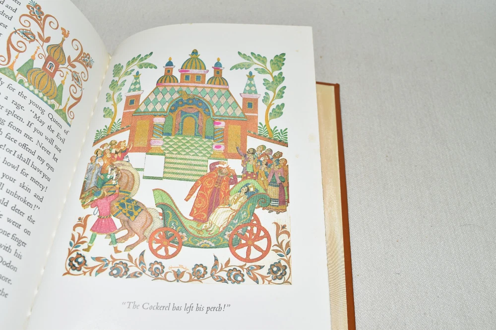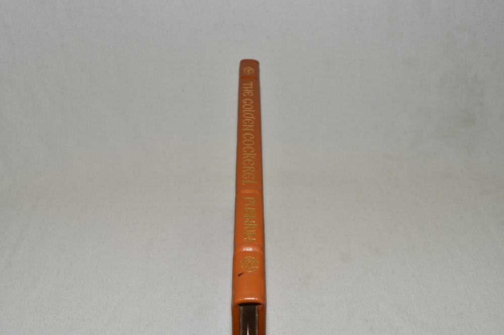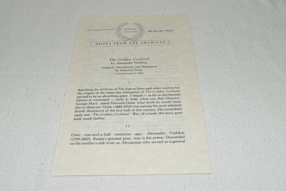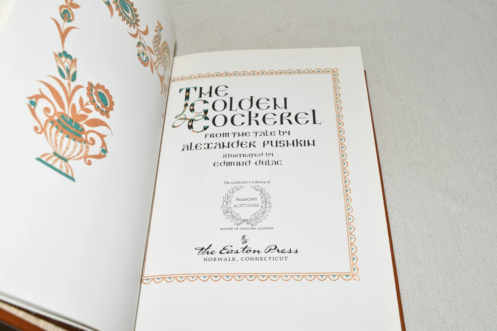 From the Easton Press Library of Famous Editions Collection... The Golden Cockerel From the Tale by Alexander Pushkin by Pushkin Illustrated by Edmund Dulac Copyright 1950 by The Easton Press Bound in Premium Full Leather This volume contains all of the classic Easton Press trimmings: Premium Leather Silk Moire Endleaves Distinctive Cover Design Hubbed Spine, Accented in Real 22KT Gold Satin Ribbon Page Marker Gilded Page Edges Long-lasting, High Quality Acid-neutral Paper Smyth-sewn Pages for Strength and Durability Beautiful Illustrations A very scarce title in any condition, this volume is in Fine condition. The front and back covers are both in terrific condition and the gilded page edges show only faint wear (see pictures of all edges). There is faint residue on the second page. This book is part of the Library of Famous Editions Collection published by Easton Press. It comes with Collector's Notes and would be a beautiful addition to your Easton Press collection. Hopefully you can add this book to your collection and enjoy it in the years to come... Please Email Me With Any Questions You Might Have! Shipping Info: Buyer to Pay Shipping and Handling International Bidders Pay Extra Shipping Seller Not Responsible For Uninsured Items Lost or Damaged in Mail Forms of Payment Accepted: Paypal Good luck and happy bidding! Powered by eBay Turbo Lister The free listing tool. List your items fast and easy and manage your active items.