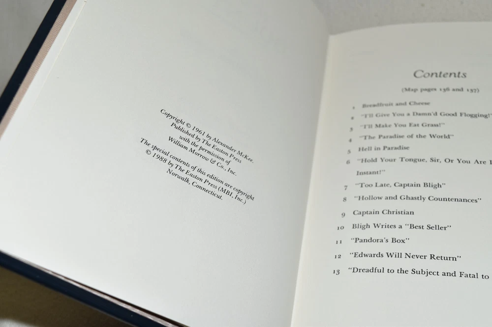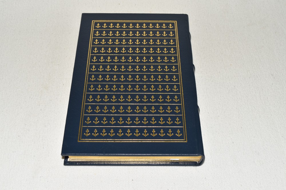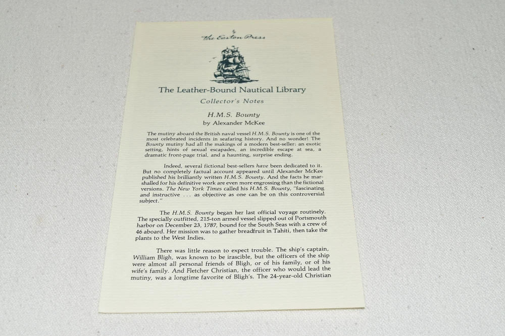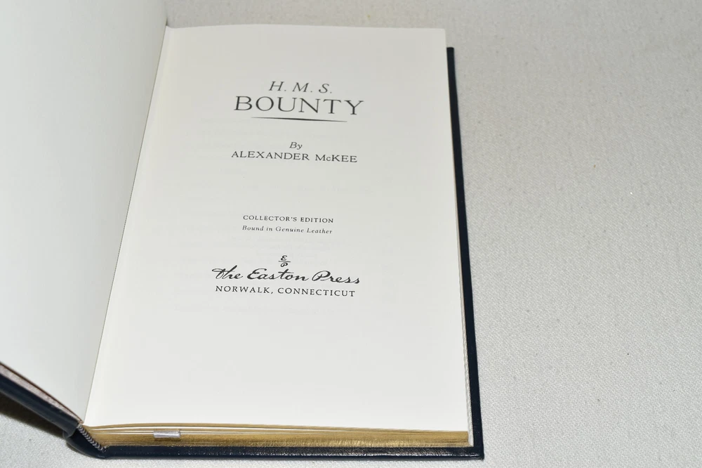 From the Easton Press Nautical Library... H. M. S. Bounty by Alexander McKee Collector's Edition Copyright 1988 by The Easton Press Bound in Premium Full Leather This volume contains all of the classic Easton Press trimmings: Premium Leather Decorated Endleaves Distinctive Cover Design Hubbed Spine, Accented in Real 22KT Gold Satin Ribbon Page Marker Gilded Page Edges Long-lasting, High Quality Acid-neutral Paper Smyth-sewn Pages for Strength and Durability Beautiful Illustrations A very scarce title in any condition, this Easton Press Edition is in Fine condition. The front and back covers are both in terrific condition and the gilded page edges show hardly any wear (see pictures of all sides of gilt). There is light residue on the second page. This book is part of the Nautical Library published by Easton Press. It comes complete with Collector's Notes and would be a beautiful addition to your Easton Press collection. Please Email Me With Any Questions You Might Have! Shipping Info: Buyer to Pay Shipping and Handling International Bidders Pay Extra Shipping Seller Not Responsible For Uninsured Items Lost or Damaged in Mail Forms of Payment Accepted: Paypal Good luck and happy bidding! Powered by eBay Turbo Lister The free listing tool. List your items fast and easy and manage your active items.