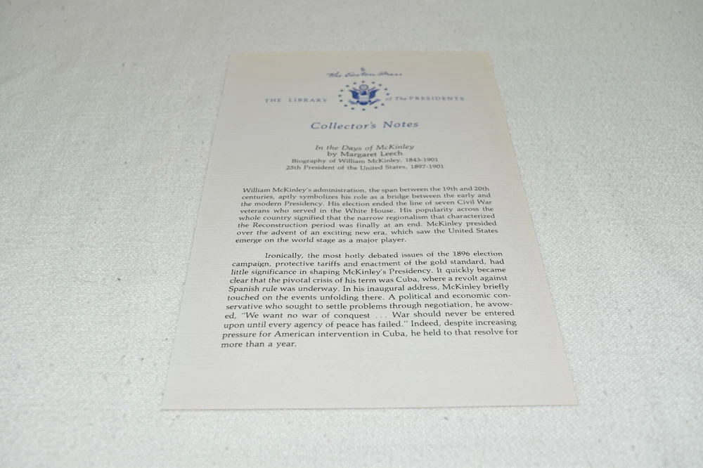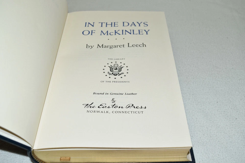 From the Easton Press Library of the Presidents Collector's Edition Series... In The Days of McKinley Biography of William McKinley by Margaret Leech Copyright 1986 by The Easton Press Bound in Premium Full Leather This volume contains all of the classic Easton Press trimmings: Premium Leather Decorated Endleaves Distinctive Cover Design Hubbed Spine, Accented in Real 22KT Gold Satin Ribbon Page Marker Gilded Page Edges Long-lasting, High Quality Acid-neutral Paper Smyth-sewn Pages for Strength and Durability A very scarce title in any condition, this copy is in Fine condition. The front and back covers are both in near perfect condition and the gilded page edges show hardly any wear (see pictures). There are no writing, markings, bookplates, or other signs of prior ownership in this book. The binding is tight and square without spine lean. This book is part of the Library of Presidents published by Easton Press and comes complete with a Collector's Notes. It would be a beautiful addition to your Easton Press collection. This book is very elusive in this superior condition, as only a limited number of them were ever published, so now is the time to act. Hopefully you can add this book to your collection and enjoy it in the years to come... Please Email Me With Any Questions You Might Have! Shipping Info: Buyer to Pay Shipping and Handling International Bidders Pay Extra Shipping Forms of Payment Accepted: Paypal Good luck and happy bidding! Powered by eBay Turbo Lister The free listing tool. List your items fast and easy and manage your active items.