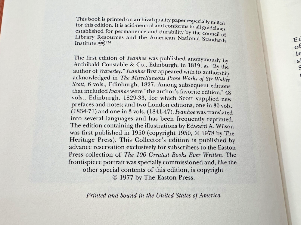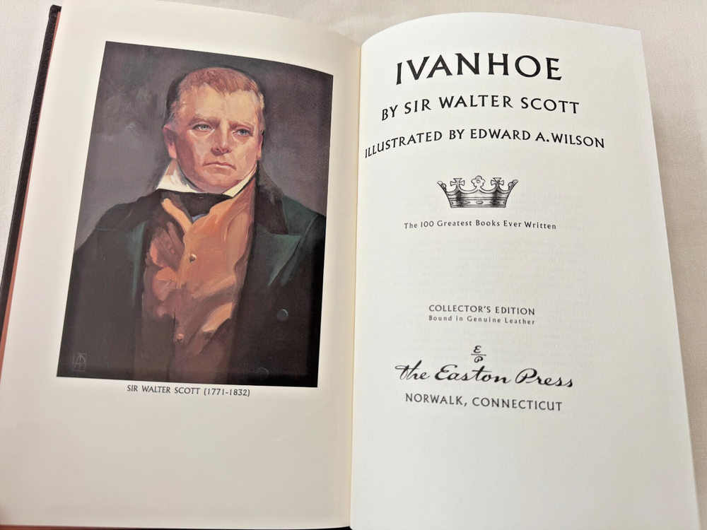 From the Easton Press 100 Greatest Books Ever Written... Ivanhoe by Sir Walter Scott Illustrated by Edward A. Wilson Copyright 1977 by The Easton Press Bound in Premium Full Leather This volume contains all of the classic Easton Press trimmings: Premium Leather Silk Moire Endleaves Distinctive Cover Design Hubbed Spine, Accented in Real 22KT Gold Satin Ribbon Page Marker Gilded Page Edges Long-lasting, High Quality Acid-neutral Paper Smyth-sewn Pages for Strength and Durability Beautiful Illustrations DESCRIPTION A very scarce title in any condition, this Edition is in Absolute Mint and Unread condition. The front and back covers are in Perfect condition and the gilded page edges show no wear at all! There is no attached bookplate nor any other signs of previous ownership . This book is part of the 100 Greatest Books Ever Written Collection published by The Easton Press and would be a beautiful addition to your Easton Press collection. Overall, this copy is a grade collector's book. This book is very elusive in this superior condition, as only a limited number of them were ever published, so now is the time to act. Hopefully you can add this book to your collection and enjoy it in the years to come... SHIPPING POLICY We take great care packaging every item to ensure safe shipment to you. Items are packaged using plenty of bubble wrap and packaged securely in a sturdy box. Our secure shipping methods have resulted in zero damaged items in over 15 years! Items are shipped out within 1 - 3 days of payment being received. RETURN & REFUND POLICY We accept refunds within 30 days of purchase. If you are not 100% satisfied with your purchase, please contact us about a refund, or initiate a refund through eBay. CONTACT US We are committed to providing our customers with the best possible on-line shopping experience. This includes a commitment to excellent customer service, before you purchase as well as after your order has been delivered. Please feel free to submit any questions or inquiries regarding this item or your order by sending us a message through the eBay messaging system. We will typically respond within 24 hours of receiving your message.