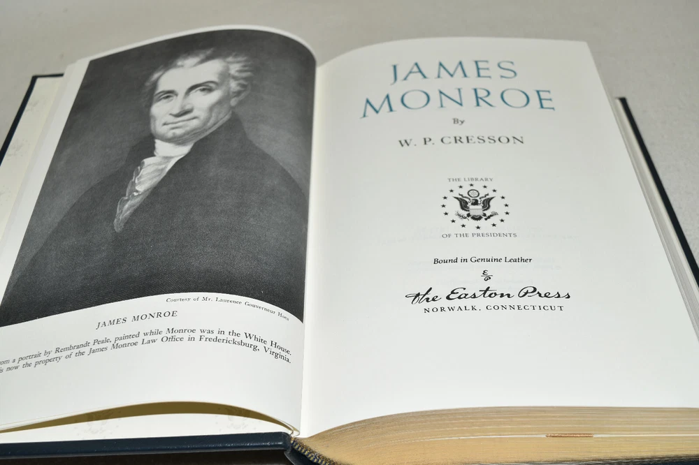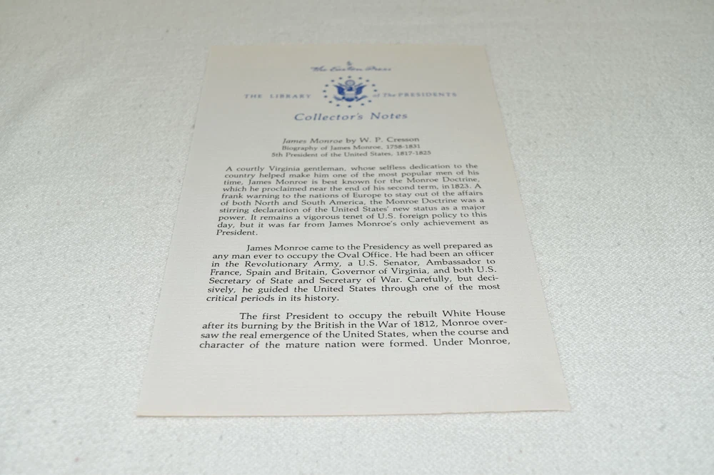 From the Easton Press Library of the Presidents Collector's Edition Series... James Monroe by W. P. Cresson Copyright 1986 by The Easton Press Bound in Premium Full Leather This volume contains all of the classic Easton Press trimmings: Premium Leather Decorated Endleaves Distinctive Cover Design Hubbed Spine, Accented in Real 22KT Gold Satin Ribbon Page Marker Gilded Page Edges Long-lasting, High Quality Acid-neutral Paper Smyth-sewn Pages for Strength and Durability A very scarce title in any condition, this copy is in Near Fine - Fine condition. The front and back covers are both in near perfect condition and the gilded page edges show only minor wear to the corner edge (see pictures of all sides). There are no writing, markings, bookplates, or other signs of prior ownership in this book. The binding is tight and square without spine lean. This book is part of the Library of Presidents published by Easton Press and comes complete with a Collector's Notes. It would be a beautiful addition to your Easton Press collection. Overall, this copy is a grade collector's book. This book is very elusive in this superior condition, as only a limited number of them were ever published, so now is the time to act. Hopefully you can add this book to your collection and enjoy it in the years to come... Please Email Me With Any Questions You Might Have! Shipping Info: Buyer to Pay Shipping and Handling International Bidders Pay Extra Shipping Forms of Payment Accepted: Paypal Good luck and happy bidding! Powered by eBay Turbo Lister The free listing tool. List your items fast and easy and manage your active items.