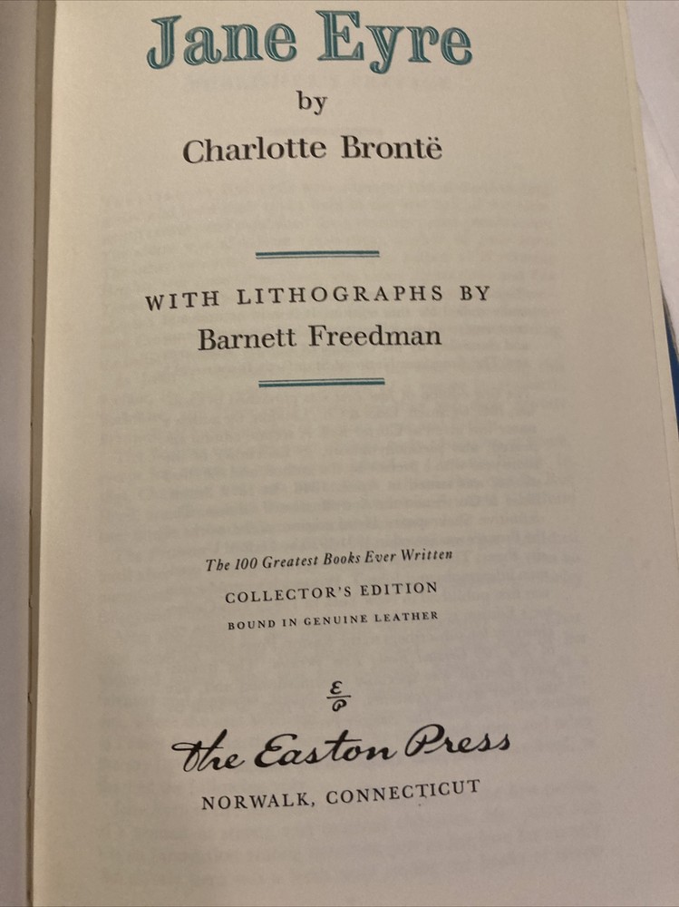 This Easton Press edition of *Jane Eyre* is absolutely stunning—a true collector's treasure. The rich brown leather binding, gold gilt edges, and elegant silk end leaves give it a luxurious feel. The illustrations by Barnett Freedman are beautiful, capturing the gothic romance of Brontë’s masterpiece. The acid-free paper ensures durability, while the satin bookmark adds convenience. Perfect for book lovers who appreciate fine craftsmanship and classic literature. Owning this feels like holding a piece of literary history—highly recommended for any serious collector!