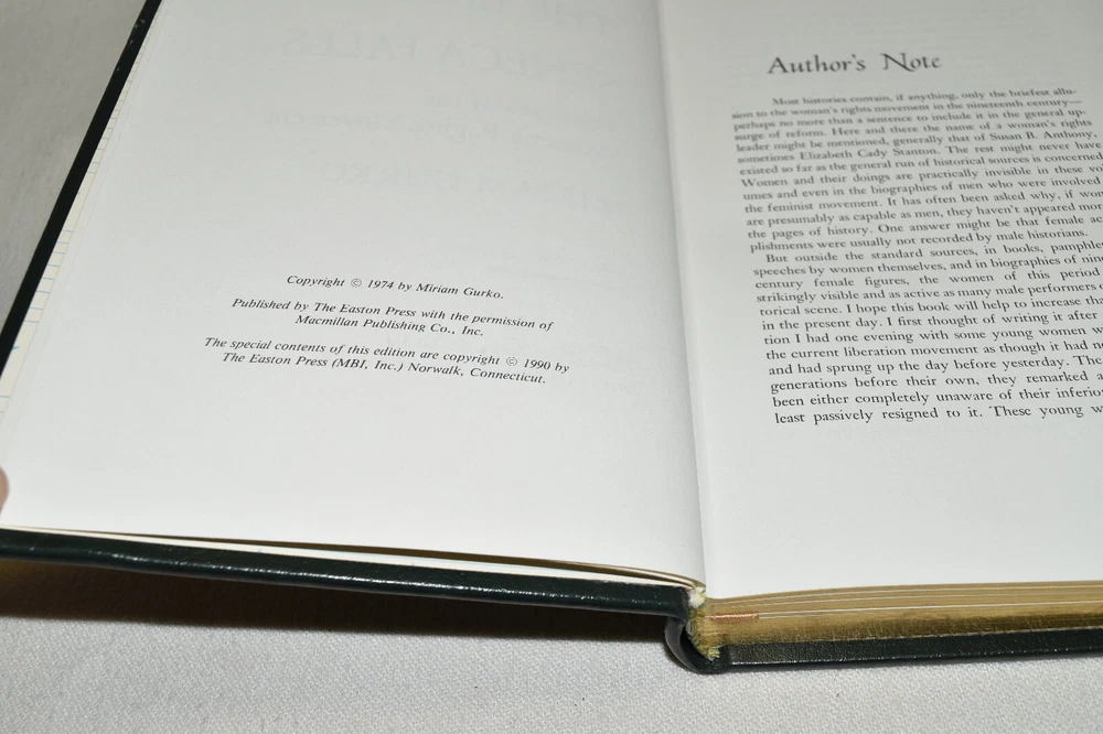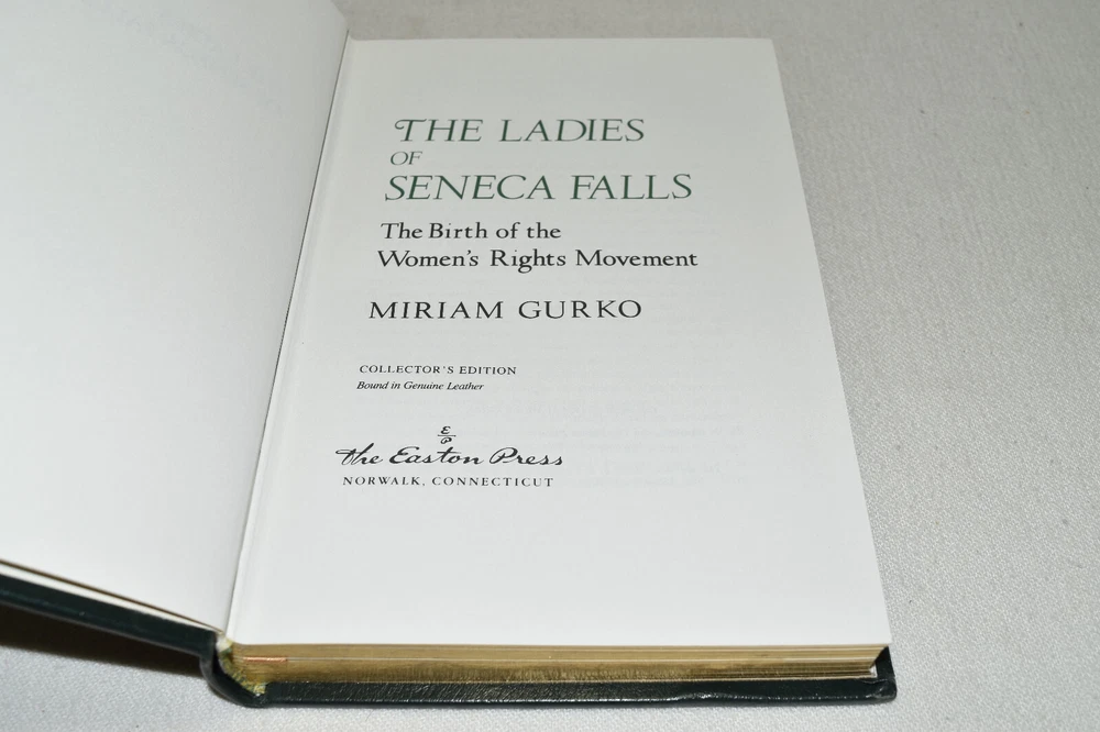 From the Easton Press Masterpieces of American History Collection... The Ladies of Seneca Falls The Birth of the Women's Rights Movement by Mariam Gurko Profusely Illustrated Copyright 1990 by The Easton Press Bound in Premium Full Leather This volume contains all of the classic Easton Press trimmings: Premium Leather Decorated Endleaves Distinctive Cover Design Hubbed Spine, Accented in Real 22KT Gold Satin Ribbon Page Marker Gilded Page Edges Long-lasting, High Quality Acid-neutral Paper Smyth-sewn Pages for Strength and Durability Beautiful Illustrations A very scarce title in any condition, this volume is in Near Fine condition. The front and back covers are both in terrific condition and the gilded page edges show minor wear (see pictures of all edges). There is a blank bookplate attached to the front board. This book is part of the Masterpieces of American History Collection published by Easton Press and would be a beautiful addition to your Easton Press collection. Hopefully you can add this book to your collection and enjoy it in the years to come... Please Email Me With Any Questions You Might Have! Shipping Info: Buyer to Pay Shipping and Handling International Bidders Pay Extra Shipping Seller Not Responsible For Uninsured Items Lost or Damaged in Mail Forms of Payment Accepted: Paypal Good luck and happy bidding! Powered by eBay Turbo Lister The free listing tool. List your items fast and easy and manage your active items.