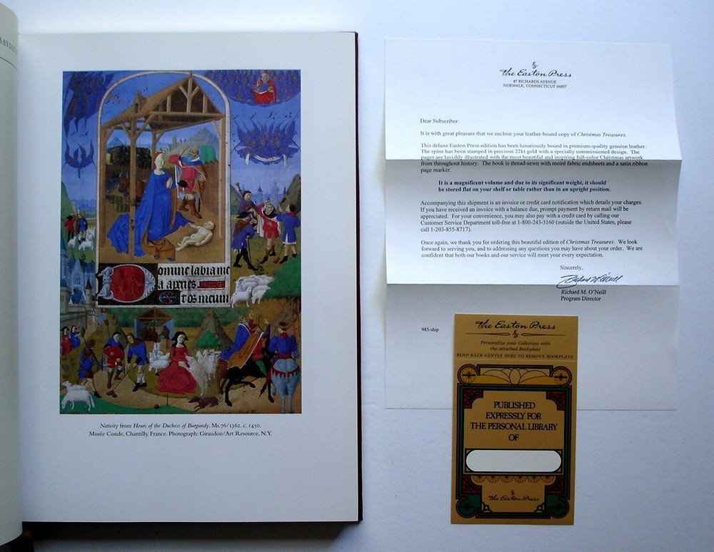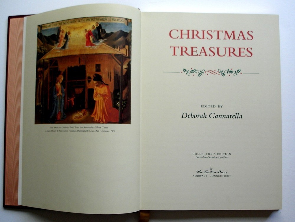 Silicon Valley Fine Books, Sunnyvale, California Rare & used books, collectibles, and more ... Now in our 30th year -- over 26 years on eBay! Christmas Treasures by Deborah Cannarella. Published by Easton Press, 2000, hardcover, 240 pages. Full maroon LEATHER , raised spine bands, satin bookmark, moire endpapers, and gilt page edges, lettering, and decorations; very handsome. Very good, a little shefwear on leather covers, some scratches on gilt edges with some light finger-pressure marks on the pages near one scratch, overall still a quite-nice copy. Includes the publisher's letter and a blank Easton bookmark laid in at front. Large and heavy book, measuring nearly 14 inches tall. Please check out our other eBay items, including our other Easton Press and Franklin Library leatherbound books ! When possible, we offer combined shipping rates on multiple-item purchases. Also, we offer free local pickup if you prefer. Tracking provided for all shown eBay shipping classes. (5.62/6.27/GB5/p-or-pmfrb-or-prb/62459) Powered by SixBit's eCommerce Solution