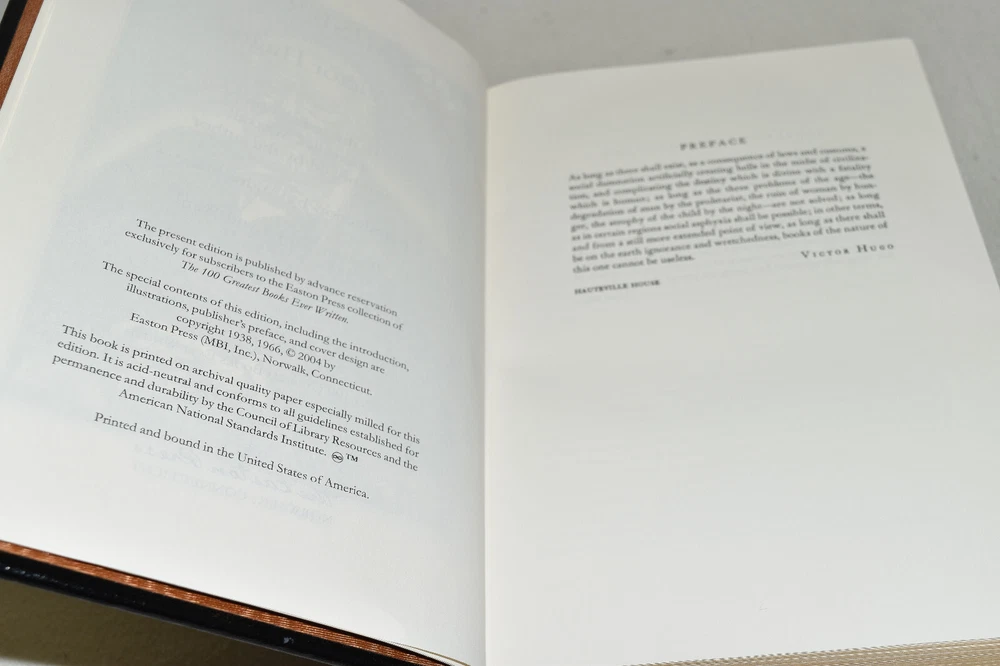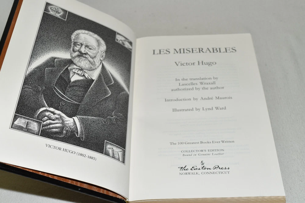 From the Easton Press 100 Greatest Books Ever Written Collection... Les Miserables by Victor Hugo Translated by Lascelles Wraxall With Illustrations by Lynd Ward and an Introduction by Andre Maurois Collector's Edition Copyright 2004 by The Easton Press Bound in Premium Full Leather This volume contains all of the classic Easton Press trimmings: Premium Leather Silk Moire Endleaves Distinctive Cover Design Hubbed Spine, Accented in Real 22KT Gold Satin Ribbon Page Marker Gilded Page Edges Long-lasting, High Quality Acid-neutral Paper Smyth-sewn Pages for Strength and Durability Beautiful Illustrations A very scarce title in any condition, this 2004 Easton Press First Edition is in Fine and Unread condition! The front and back covers are both in near perfect condition and the gilded page edges show only faint wear (see pictures of all sides). There is no attached bookplate nor any other signs of previous ownership . This book is part of the 100 Greatest Books Ever Written Collection published by Easton Press and would be a beautiful addition to your Easton Press collection. Overall, this copy is a grade collector's book. This book is very elusive in this superior condition, as only a limited number of them were ever published, so now is the time to act. Hopefully you can add this book to your collection and enjoy it in the years to come... Please Email Me With Any Questions You Might Have! Shipping Info: Buyer to Pay Shipping and Handling International Bidders Pay Extra Shipping Seller Not Responsible For Uninsured Items Lost or Damaged in Mail Forms of Payment Accepted: Paypal Good luck and happy bidding! Powered by eBay Turbo Lister The free listing tool. List your items fast and easy and manage your active items.