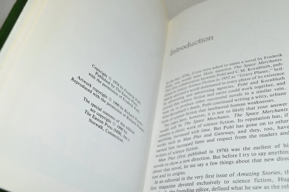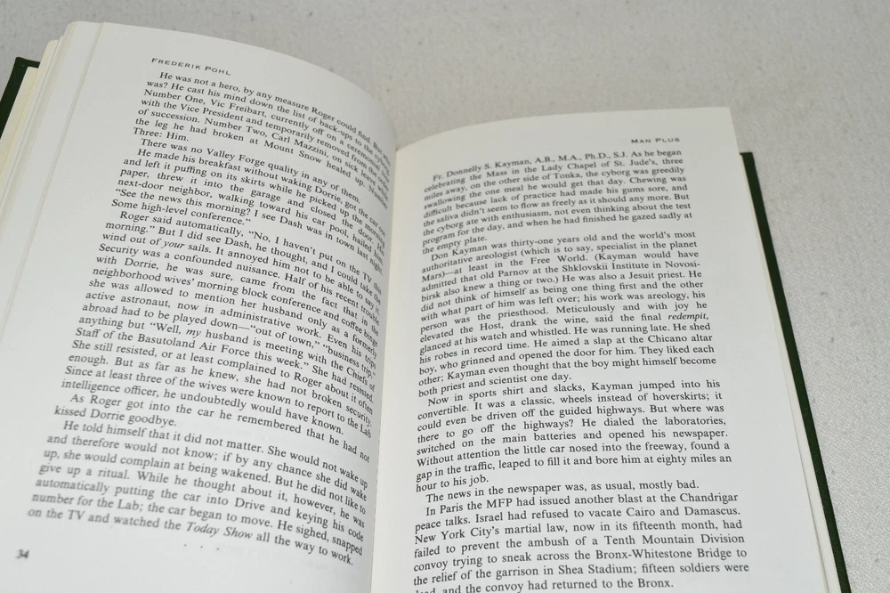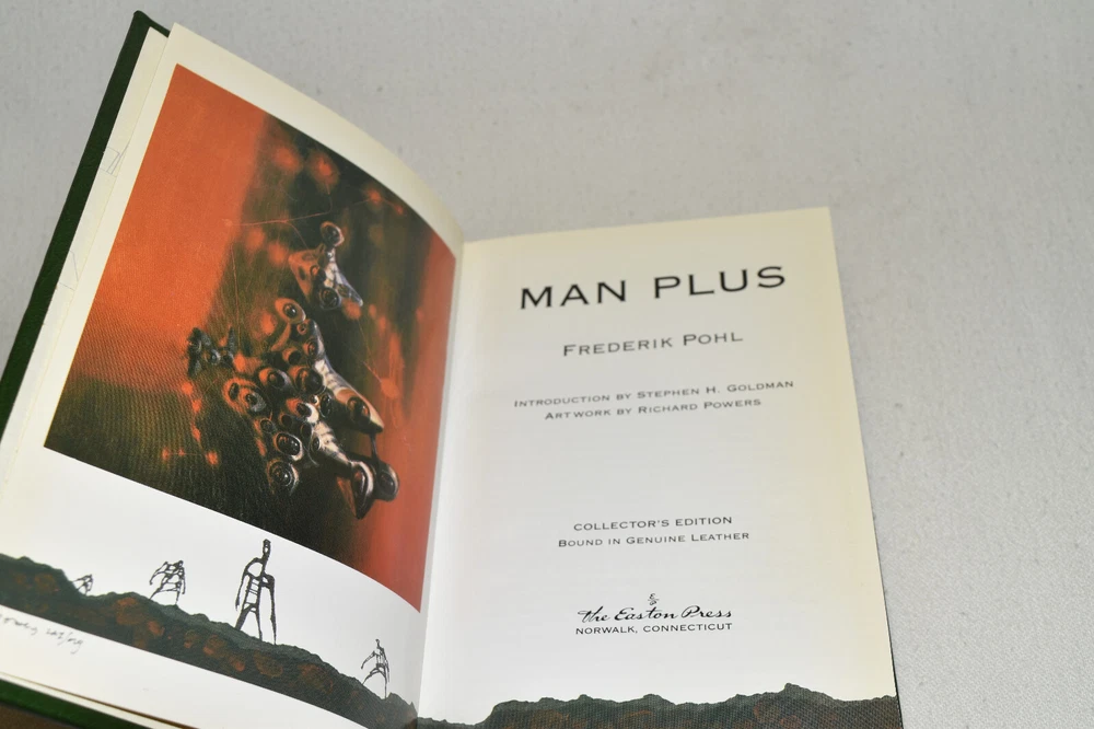 From the Easton Press Masterpieces of Science Fiction Collection... Man Plus by Frederik Pohl Introduction by Stephen Goldman Artwork by Richard Powers Copyright 1990 by The Easton Press Bound in Premium Full Leather This volume contains all of the classic Easton Press trimmings: Premium Leather Decorated Endleaves Distinctive Cover Design Hubbed Spine, Accented in Real 22KT Gold Satin Ribbon Page Marker Gilded Page Edges Long-lasting, High Quality Acid-neutral Paper Smyth-sewn Pages for Strength and Durability Beautiful Illustrations A very scarce title in any condition, this volume is in Fine condition. The front and back covers are in terrific condition and the gilded page edges show only minor wear (see pictures of all edges). There is faint residue on the second page. This book is part of the Masterpieces of Science Fiction Collection published by Easton Press and would be a beautiful addition to your Easton Press collection. Hopefully you can add this book to your collection and enjoy it in the years to come... Please Email Me With Any Questions You Might Have! Shipping Info: Buyer to Pay Shipping and Handling International Bidders Pay Extra Shipping Seller Not Responsible For Uninsured Items Lost or Damaged in Mail Forms of Payment Accepted: Paypal Good luck and happy bidding! Powered by eBay Turbo Lister The free listing tool. List your items fast and easy and manage your active items.