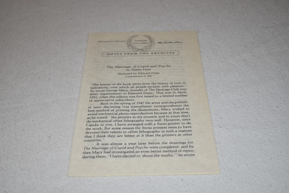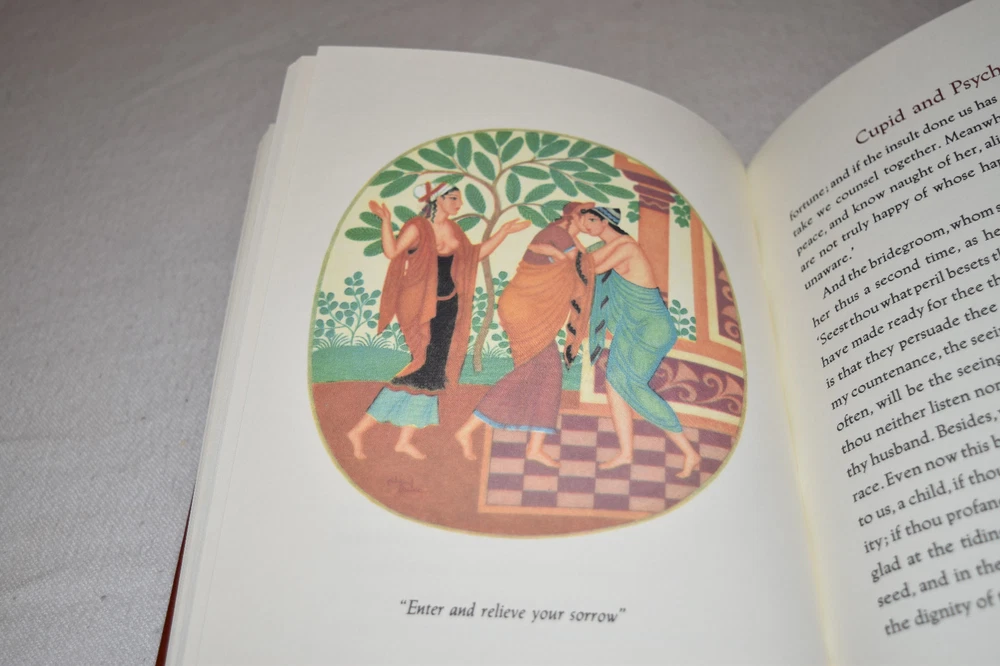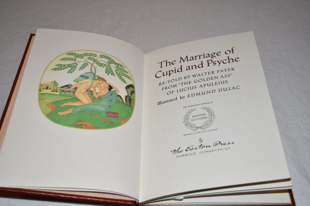 From the Library of Famous Editions Collection by Easton Press... The Marriage of Cupid and Psyche Retold by Walter Pater From "The Golden Ass" by Lucius Apuleius Illustrations by Edmund Dulac Copyright 1951 by The Easton Press Bound in Premium Full Leather This volume contains all of the classic Easton Press trimmings: Premium Leather Silk Moire Endleaves Distinctive Cover Design Hubbed Spine, Accented in Real 22KT Gold Satin Ribbon Page Marker Gilded Page Edges Long-lasting, High Quality Acid-neutral Paper Smyth-sewn Pages for Strength and Durability Beautiful Illustrations A very scarce title in any condition, this volume is in Fine and Unread condition. The front and back covers are both in near perfect condition and the gilded page edges show hardly any wear (see pictures). The binding is tight and square without spine lean. This book is part of the Library of Famous Editions Collection published by Easton Press. It comes complete with Collector's Notes and has an attached bookplate from the previous owner. It would be a beautiful addition to your Easton Press collection. Overall, this copy is a grade collector's book. This book is very elusive in this superior condition, as only a limited number of them were ever published, so now is the time to act. Hopefully you can add this book to your collection and enjoy it in the years to come... Please Email Me With Any Questions You Might Have! Shipping Info: Buyer to Pay Shipping and Handling International Bidders Pay Extra Shipping Seller Not Responsible For Uninsured Items Lost or Damaged in Mail Forms of Payment Accepted: Paypal Good luck and happy bidding! Powered by eBay Turbo Lister The free listing tool. List your items fast and easy and manage your active items.