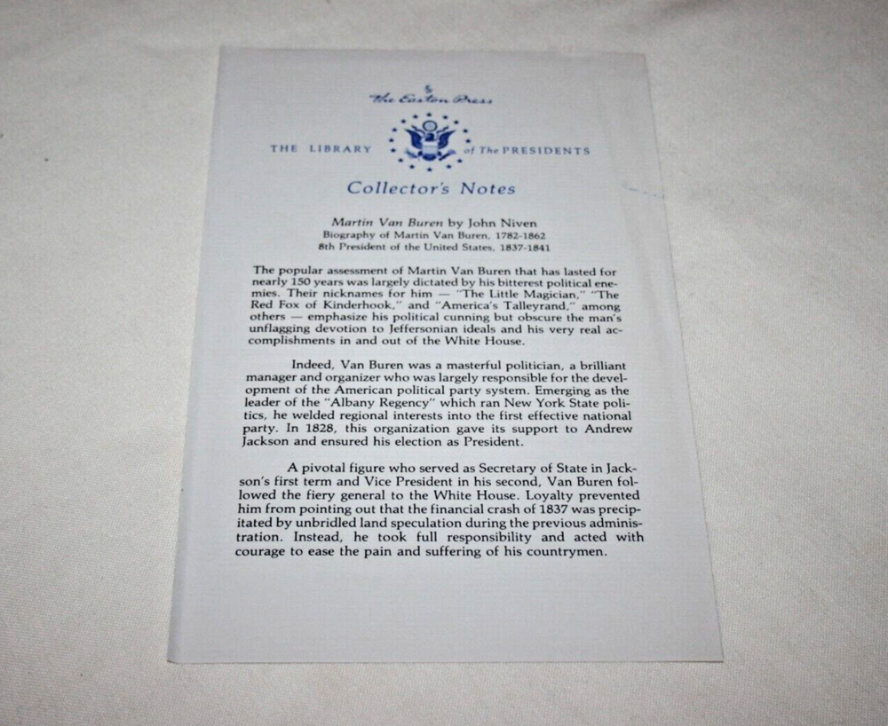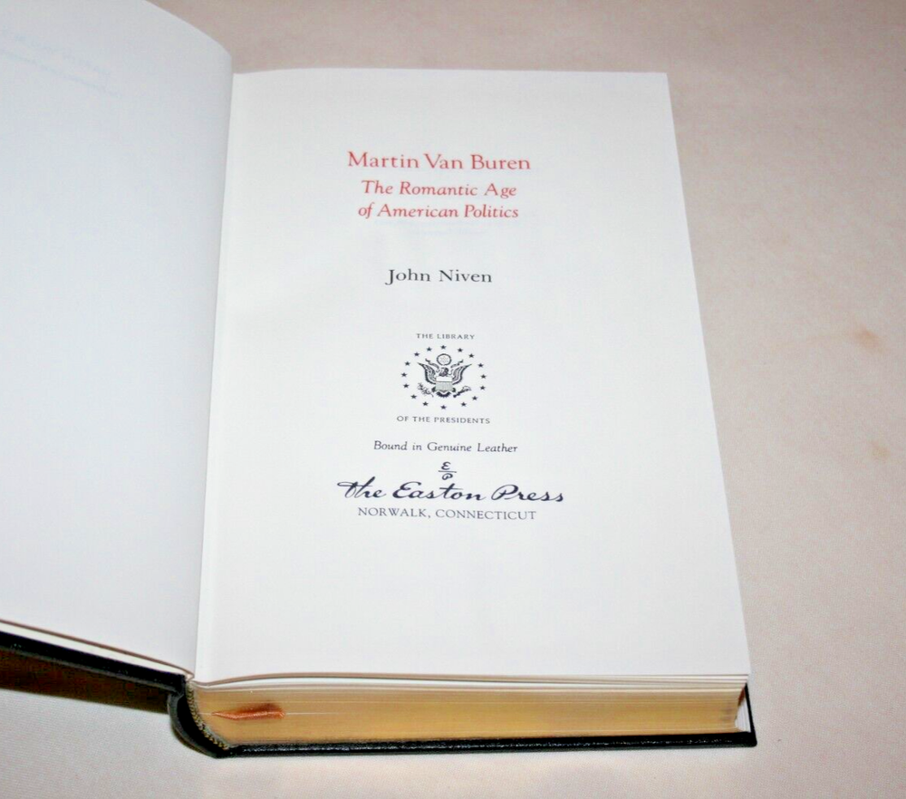 From the Easton Press Library of the Presidents Collector's Edition Series... Martin Van Buren The Romantic Age of American Politics by John Niven Copyright 1996 by The Easton Press Bound in Premium Full Leather This volume contains all of the classic Easton Press trimmings: Premium Leather Decorated Endleaves Distinctive Cover Design Hubbed Spine, Accented in Real 22KT Gold Satin Ribbon Page Marker Gilded Page Edges Long-lasting, High Quality Acid-neutral Paper Smyth-sewn Pages for Strength and Durability A very scarce title in any condition, this copy is in near Fine and Unread condition. The front and back covers are both in Perfect condition and the gilded page edges show only very light wear! There are no writing, markings, bookplates, or other signs of prior ownership in this book. The binding is tight and square without spine lean. This book is part of the Library of Presidents published by Easton Press and comes complete with a Collector's Notes. It would be a beautiful addition to your Easton Press collection. This book is very elusive in this superior condition, as only a limited number of them were ever published, so now is the time to act. Hopefully you can add this book to your collection and enjoy it in the years to come... Please Email Me With Any Questions You Might Have! Shipping Info: Buyer to Pay Shipping and Handling International Bidders Pay Extra Shipping Good luck and happy bidding!