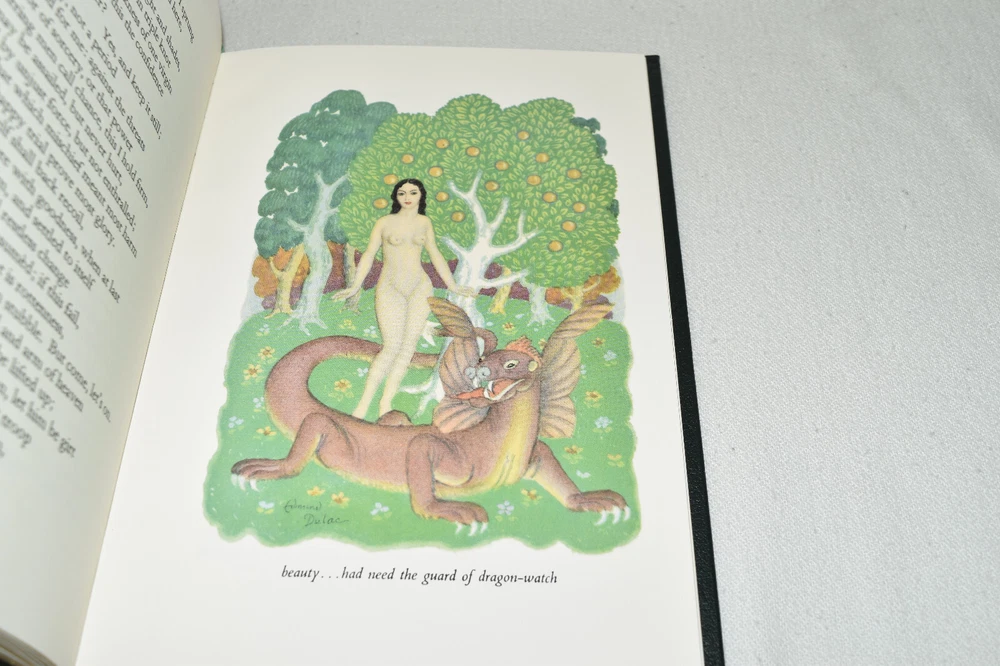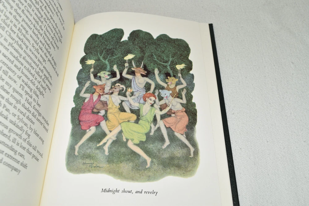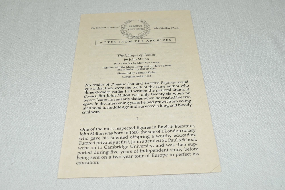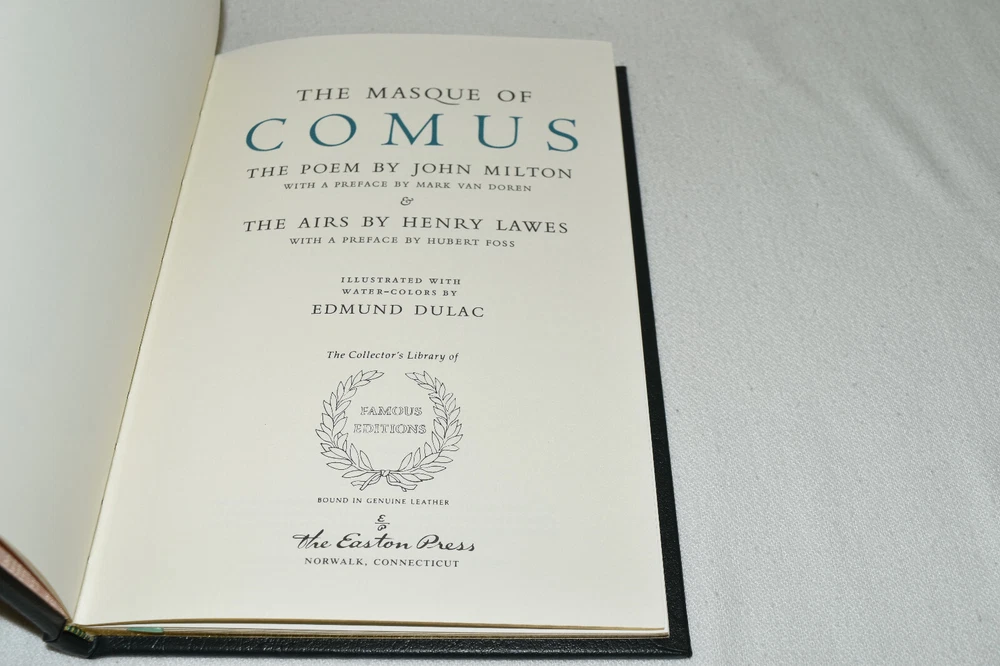 From the Easton Press Library of Famous Editions Collection... The Masque of Comus The Poem by John Milton The Airs by Henry Lawes Preface by Hubert Foss Illustrated by Edmund Dulac Copyright 1997 by The Easton Press Bound in Premium Full Leather This volume contains all of the classic Easton Press trimmings: Premium Leather Silk Moire Endleaves Distinctive Cover Design Hubbed Spine, Accented in Real 22KT Gold Satin Ribbon Page Marker Gilded Page Edges Long-lasting, High Quality Acid-neutral Paper Smyth-sewn Pages for Strength and Durability Beautiful Illustrations A very scarce title in any condition, this copy is in Fine condition. The front and back covers are both in near perfect condition and the gilded page edges show minor wear (see pictures of all sides). There is light residue on the second page. This book is part of the Library of Famous Editions Collection published by Easton Press. It would be a beautiful addition to your Easton Press collection. Overall, this copy is a grade collector's book. This book is very elusive in this superior condition, as only a limited number of them were ever published, so now is the time to act. Hopefully you can add this book to your collection and enjoy it in the years to come... Please Email Me With Any Questions You Might Have! Shipping Info: Buyer to Pay Shipping and Handling International Bidders Pay Extra Shipping Good luck and happy bidding!