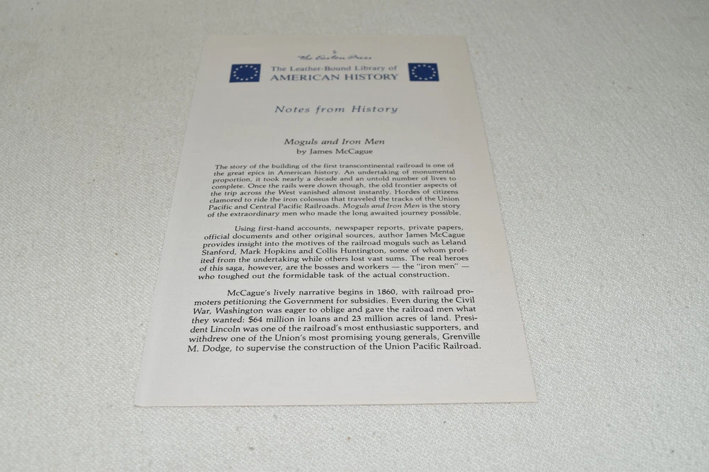 From the Easton Press Masterpieces of American History Collection... Moguls and Iron Men by James McCague Profusely Illustrated Copyright 1990 by The Easton Press Bound in Premium Full Leather This volume contains all of the classic Easton Press trimmings: Premium Leather Decorated Endleaves Distinctive Cover Design Hubbed Spine, Accented in Real 22KT Gold Satin Ribbon Page Marker Gilded Page Edges Long-lasting, High Quality Acid-neutral Paper Smyth-sewn Pages for Strength and Durability Beautiful Illustrations A very scarce title in any condition, this volume is in Fine condition. The front and back covers are both in terrific condition and the gilded page edges show hardly any wear (see pictures of all edges). There are no markings, bookplates, or other signs of prior ownership in this book. This book is part of the Masterpieces of American History Collection published by Easton Press. It comes complete with Collector's Notes and would be a beautiful addition to your Easton Press collection. Hopefully you can add this book to your collection and enjoy it in the years to come... Please Email Me With Any Questions You Might Have! Shipping Info: Buyer to Pay Shipping and Handling International Bidders Pay Extra Shipping Seller Not Responsible For Uninsured Items Lost or Damaged in Mail Forms of Payment Accepted: Paypal Good luck and happy bidding! Powered by eBay Turbo Lister The free listing tool. List your items fast and easy and manage your active items.