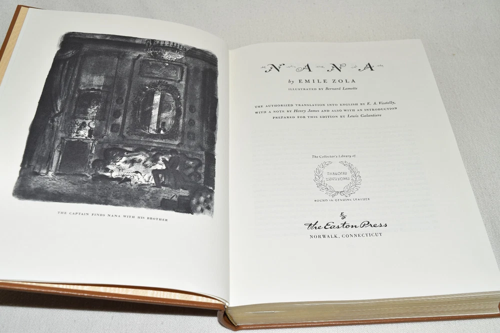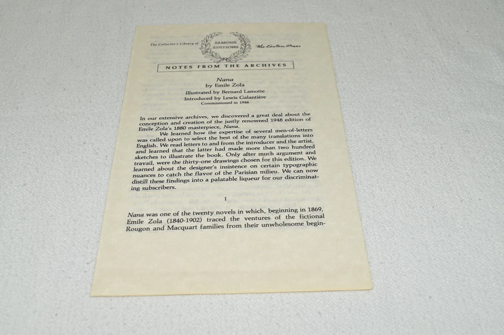 From the Easton Press Library of Famous Editions Collection... Nana by Emile Zola Introduced by Lewis Galantiere Illustrated by Bernard Lamotte Copyright 1976 by The Easton Press Bound in Premium Full Leather This volume contains all of the classic Easton Press trimmings: Premium Leather Silk Moire Endleaves Distinctive Cover Design Hubbed Spine, Accented in Real 22KT Gold Satin Ribbon Page Marker Gilded Page Edges Long-lasting, High Quality Acid-neutral Paper Smyth-sewn Pages for Strength and Durability Beautiful Illustrations A very scarce title in any condition, this volume is in Fine condition. The front and back covers are both in terrific condition and the gilded page edges show hardly any wear (see pictures of all edges). There are no markings, bookplates, or other signs of prior ownership. This book is part of the Library of Famous Editions Collection published by Easton Press. It comes complete with Collector's Notes and would be a beautiful addition to your Easton Press collection. Hopefully you can add this book to your collection and enjoy it in the years to come... Please Email Me With Any Questions You Might Have! Shipping Info: Buyer to Pay Shipping and Handling International Bidders Pay Extra Shipping Seller Not Responsible For Uninsured Items Lost or Damaged in Mail Forms of Payment Accepted: Paypal Good luck and happy bidding! Powered by eBay Turbo Lister The free listing tool. List your items fast and easy and manage your active items.
