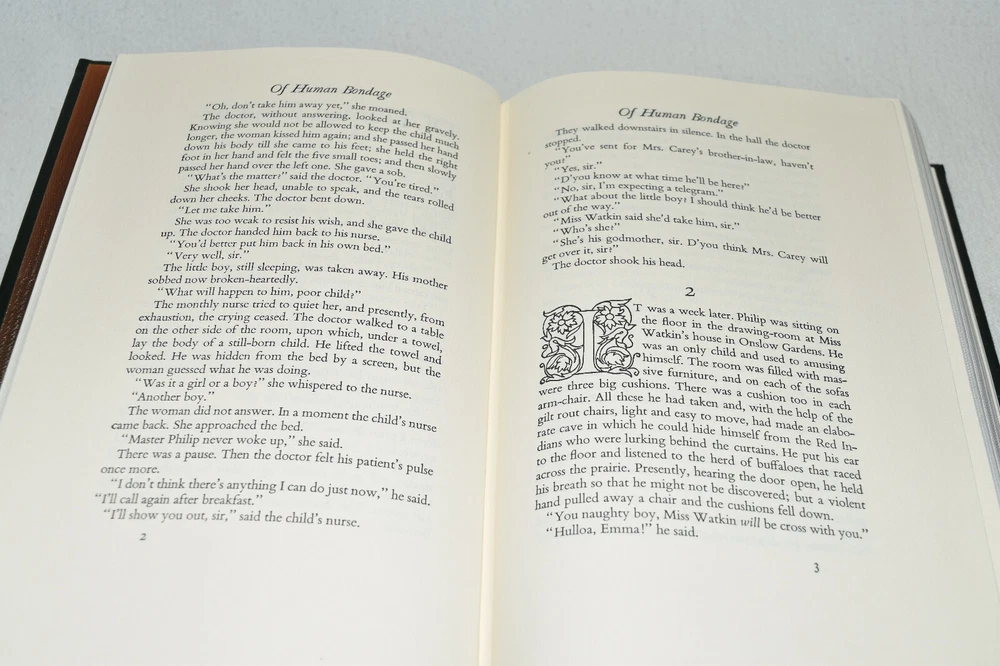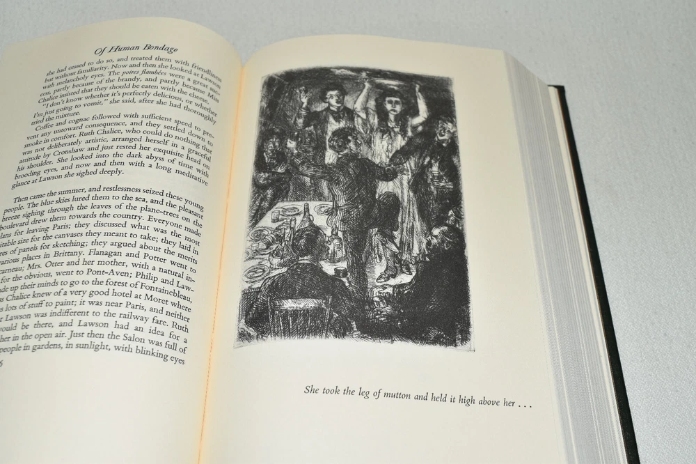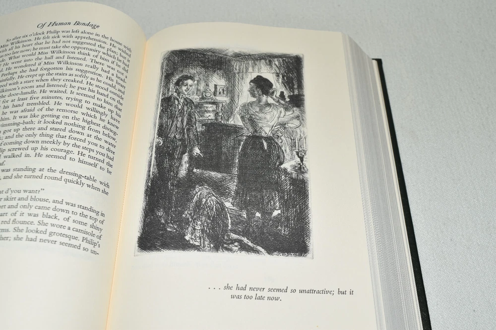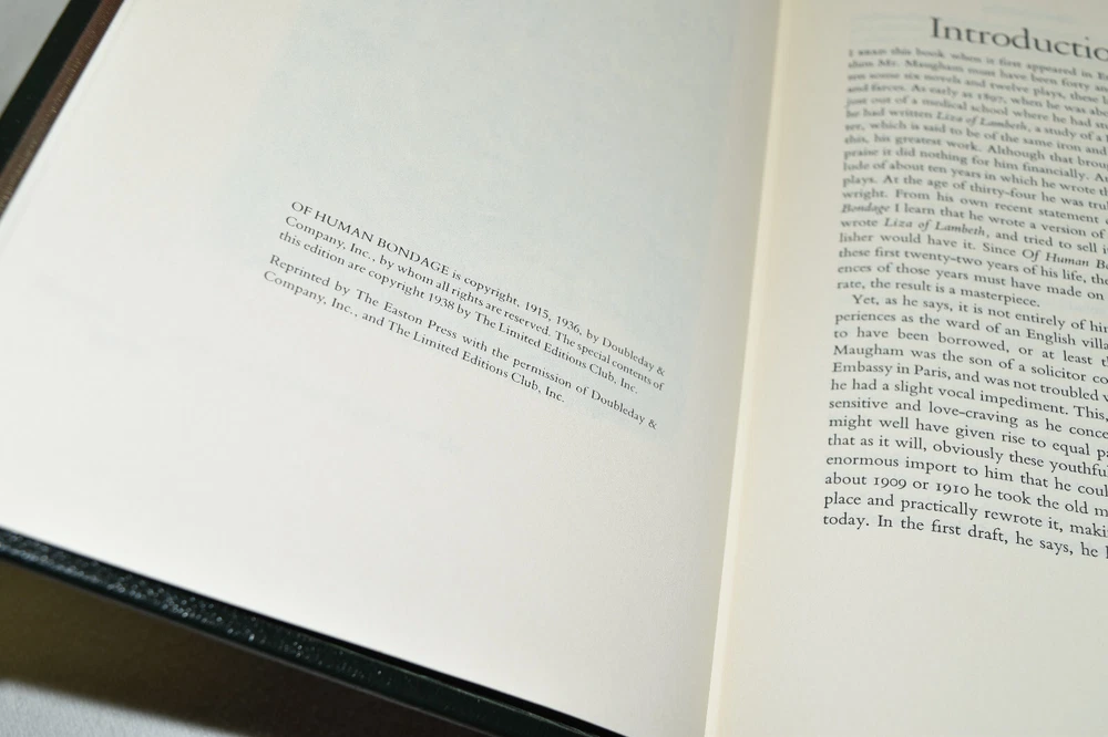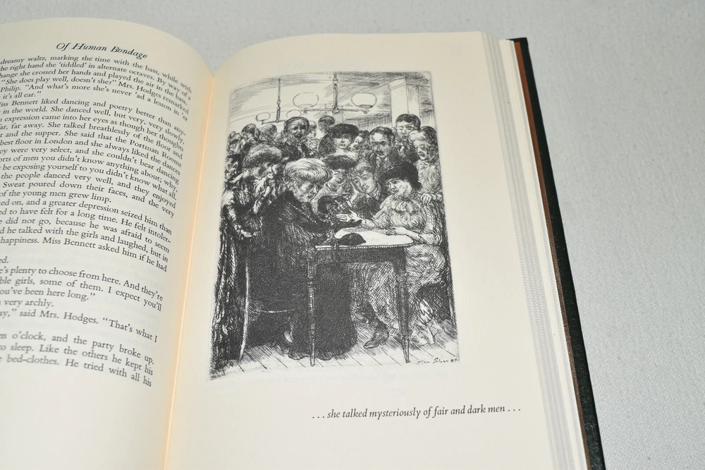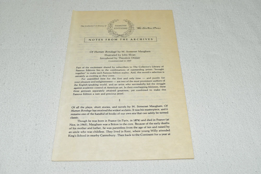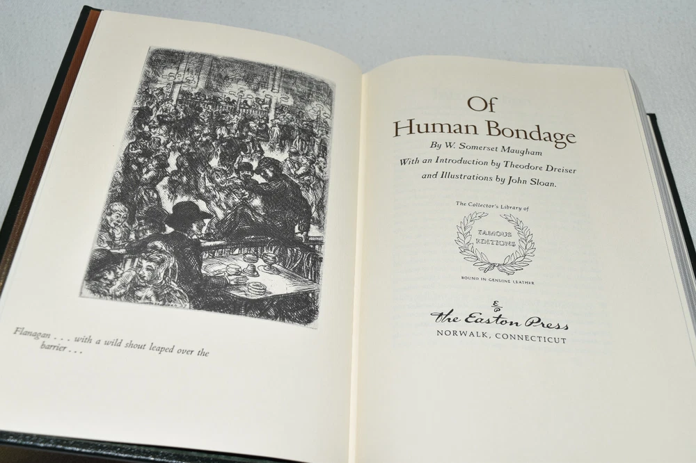 From the Easton Press Library of Famous Editions Collection... Of Human Bondage by W. Somerset Maugham Introduced by Theodore Dreiser Illustrated by John Sloan Copyright 1938 by The Easton Press Bound in Premium Full Leather This volume contains all of the classic Easton Press trimmings: Premium Leather Silk Moire Endleaves Distinctive Cover Design Hubbed Spine, Accented in Real 22KT Gold Satin Ribbon Page Marker Gilded Page Edges Long-lasting, High Quality Acid-neutral Paper Smyth-sewn Pages for Strength and Durability Beautiful Illustrations A very scarce title in any condition, this volume is in Fine condition. The front and back covers are both in terrific condition and the gilded page edges show hardly any wear (see pictures of all edges). There are no bookplates, markings, or other signs of prior ownership in this book. This book is part of the Library of Famous Editions Collection published by Easton Press. It comes complete with Collector's Notes and would be a beautiful addition to your Easton Press collection. Hopefully you can add this book to your collection and enjoy it in the years to come... Please Email Me With Any Questions You Might Have! Shipping Info: Buyer to Pay Shipping and Handling International Bidders Pay Extra Shipping Seller Not Responsible For Uninsured Items Lost or Damaged in Mail Forms of Payment Accepted: Paypal Good luck and happy bidding! Powered by eBay Turbo Lister The free listing tool. List your items fast and easy and manage your active items.