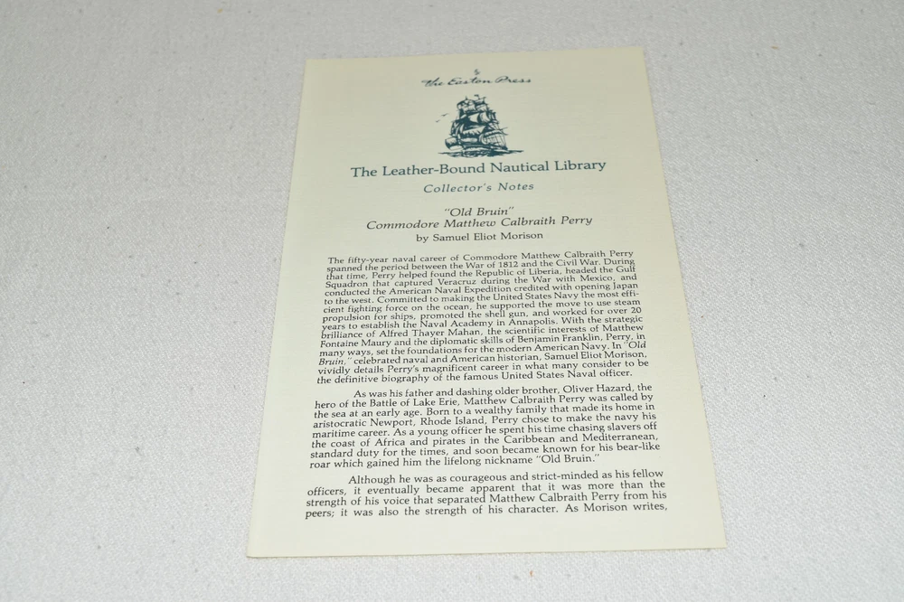 From the Easton Press Nautical Library... "Old Bruin" Commodore Matthew C. Perry by Samuel Eliot Morison Collector's Edition Copyright 1990 by The Easton Press Bound in Premium Full Leather This volume contains all of the classic Easton Press trimmings: Premium Leather Decorated Endleaves Distinctive Cover Design Hubbed Spine, Accented in Real 22KT Gold Satin Ribbon Page Marker Gilded Page Edges Long-lasting, High Quality Acid-neutral Paper Smyth-sewn Pages for Strength and Durability Beautiful Illustrations A very scarce title in any condition, this Easton Press Edition is in Fine condition! The front and back covers are both in terrific condition and the gilded page edges show hardly any wear (see pictures of all sides of gilt). There is light residue on the second page. This book is part of the Nautical Library published by Easton Press. It comes complete with Collector's Notes and would be a beautiful addition to your Easton Press collection. Please Email Me With Any Questions You Might Have! Shipping Info: Buyer to Pay Shipping and Handling International Bidders Pay Extra Shipping Seller Not Responsible For Uninsured Items Lost or Damaged in Mail Forms of Payment Accepted: Paypal Good luck and happy bidding! Powered by eBay Turbo Lister The free listing tool. List your items fast and easy and manage your active items.