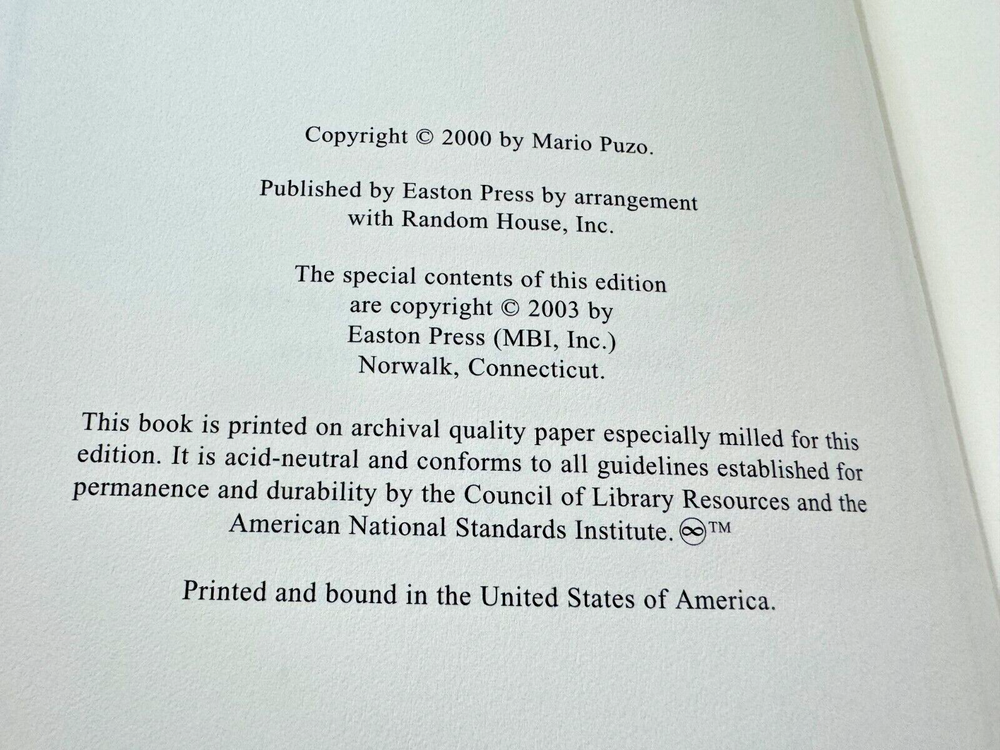 From the Easton Press Godfather Collection... Omerta by Mario Puzo Collector's Edition Copyright 2003 by The Easton Press Bound in Premium Full Leather This volume contains all of the classic Easton Press trimmings: Premium Leather Decorated Endleaves Distinctive Cover Design Hubbed Spine, Accented in Real 22KT Gold Satin Ribbon Page Marker Gilded Page Edges Long-lasting, High Quality Acid-neutral Paper Smyth-sewn Pages for Strength and Durability A very scarce title in any condition, this Easton Press Limited Edition is in Fine and Unread condition. The front and back covers are both in Perfect condition and the gilded page edges hardly any wear at all! There are no markings, bookplates, or other signs of prior ownership. This book was published by Easton Press and would be a beautiful addition to your Easton Press collection. Overall, this copy is a grade collector's book. This book is very elusive in this superior condition, as only a limited number of them were ever published, so now is the time to act. Hopefully you can add this book to your collection and enjoy it in the years to come... Please Email Me With Any Questions You Might Have! Shipping Info: Buyer to Pay Shipping and Handling International Bidders Pay Extra Shipping Good luck and happy bidding!